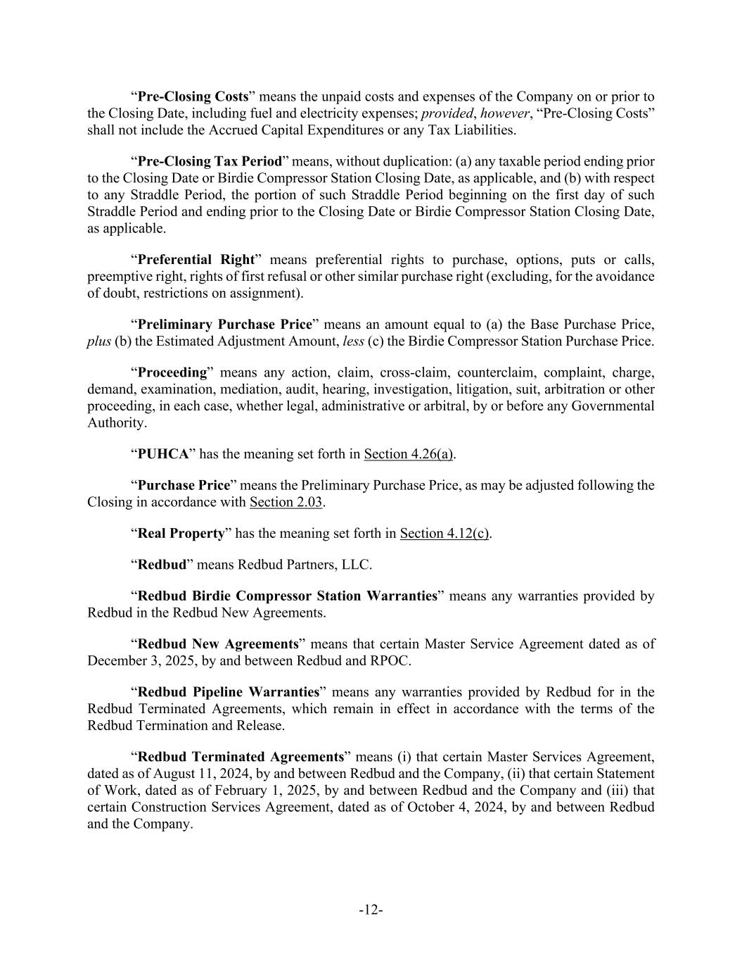-12- “Pre-Closing Costs” means the unpaid costs and expenses of the Company on or prior to the Closing Date, including fuel and electricity expenses; provided, however, “Pre-Closing Costs” shall not include the Accrued Capital Expenditures or any Tax Liabilities. “Pre-Closing Tax Period” means, without duplication: (a) any taxable period ending prior to the Closing Date or Birdie Compressor Station Closing Date, as applicable, and (b) with respect to any Straddle Period, the portion of such Straddle Period beginning on the first day of such Straddle Period and ending prior to the Closing Date or Birdie Compressor Station Closing Date, as applicable. “Preferential Right” means preferential rights to purchase, options, puts or calls, preemptive right, rights of first refusal or other similar purchase right (excluding, for the avoidance of doubt, restrictions on assignment). “Preliminary Purchase Price” means an amount equal to (a) the Base Purchase Price, plus (b) the Estimated Adjustment Amount, less (c) the Birdie Compressor Station Purchase Price. “Proceeding” means any action, claim, cross-claim, counterclaim, complaint, charge, demand, examination, mediation, audit, hearing, investigation, litigation, suit, arbitration or other proceeding, in each case, whether legal, administrative or arbitral, by or before any Governmental Authority. “PUHCA” has the meaning set forth in Section 4.26(a). “Purchase Price” means the Preliminary Purchase Price, as may be adjusted following the Closing in accordance with Section 2.03. “Real Property” has the meaning set forth in Section 4.12(c). “Redbud” means Redbud Partners, LLC. “Redbud Birdie Compressor Station Warranties” means any warranties provided by Redbud in the Redbud New Agreements. “Redbud New Agreements” means that certain Master Service Agreement dated as of December 3, 2025, by and between Redbud and RPOC. “Redbud Pipeline Warranties” means any warranties provided by Redbud for in the Redbud Terminated Agreements, which remain in effect in accordance with the terms of the Redbud Termination and Release. “Redbud Terminated Agreements” means (i) that certain Master Services Agreement, dated as of August 11, 2024, by and between Redbud and the Company, (ii) that certain Statement of Work, dated as of February 1, 2025, by and between Redbud and the Company and (iii) that certain Construction Services Agreement, dated as of October 4, 2024, by and between Redbud and the Company.