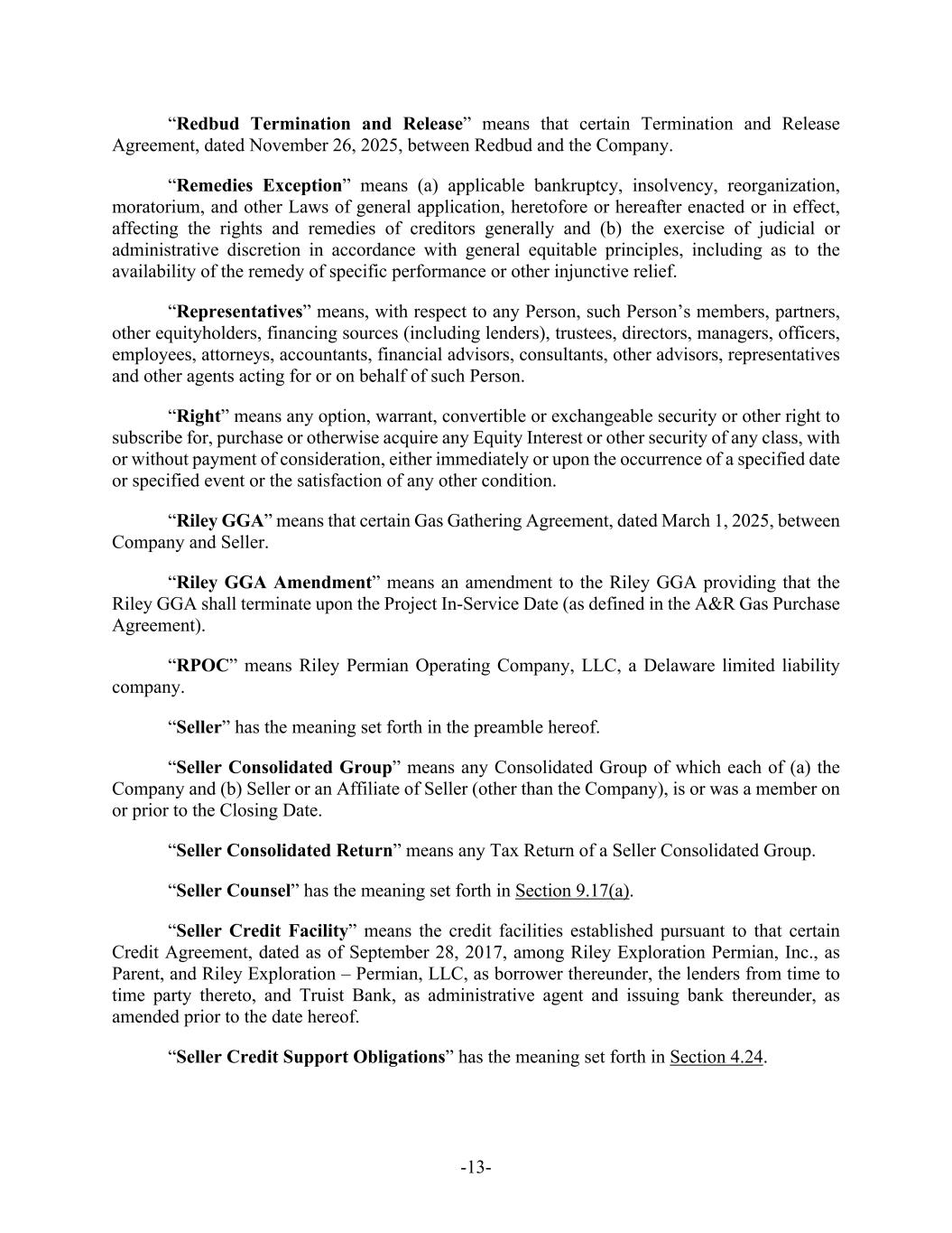 -13- “Redbud Termination and Release” means that certain Termination and Release Agreement, dated November 26, 2025, between Redbud and the Company. “Remedies Exception” means (a) applicable bankruptcy, insolvency, reorganization, moratorium, and other Laws of general application, heretofore or hereafter enacted or in effect, affecting the rights and remedies of creditors generally and (b) the exercise of judicial or administrative discretion in accordance with general equitable principles, including as to the availability of the remedy of specific performance or other injunctive relief. “Representatives” means, with respect to any Person, such Person’s members, partners, other equityholders, financing sources (including lenders), trustees, directors, managers, officers, employees, attorneys, accountants, financial advisors, consultants, other advisors, representatives and other agents acting for or on behalf of such Person. “Right” means any option, warrant, convertible or exchangeable security or other right to subscribe for, purchase or otherwise acquire any Equity Interest or other security of any class, with or without payment of consideration, either immediately or upon the occurrence of a specified date or specified event or the satisfaction of any other condition. “Riley GGA” means that certain Gas Gathering Agreement, dated March 1, 2025, between Company and Seller. “Riley GGA Amendment” means an amendment to the Riley GGA providing that the Riley GGA shall terminate upon the Project In-Service Date (as defined in the A&R Gas Purchase Agreement). “RPOC” means Riley Permian Operating Company, LLC, a Delaware limited liability company. “Seller” has the meaning set forth in the preamble hereof. “Seller Consolidated Group” means any Consolidated Group of which each of (a) the Company and (b) Seller or an Affiliate of Seller (other than the Company), is or was a member on or prior to the Closing Date. “Seller Consolidated Return” means any Tax Return of a Seller Consolidated Group. “Seller Counsel” has the meaning set forth in Section 9.17(a). “Seller Credit Facility” means the credit facilities established pursuant to that certain Credit Agreement, dated as of September 28, 2017, among Riley Exploration Permian, Inc., as Parent, and Riley Exploration – Permian, LLC, as borrower thereunder, the lenders from time to time party thereto, and Truist Bank, as administrative agent and issuing bank thereunder, as amended prior to the date hereof. “Seller Credit Support Obligations” has the meaning set forth in Section 4.24.