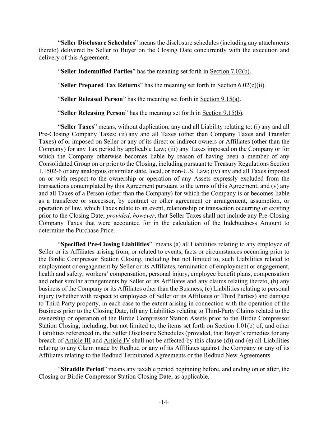 -14- “Seller Disclosure Schedules” means the disclosure schedules (including any attachments thereto) delivered by Seller to Buyer on the Closing Date concurrently with the execution and delivery of this Agreement. “Seller Indemnified Parties” has the meaning set forth in Section 7.02(b). “Seller Prepared Tax Returns” has the meaning set forth in Section 6.02(c)(ii). “Seller Released Person” has the meaning set forth in Section 9.15(a). “Seller Releasing Person” has the meaning set forth in Section 9.15(b). “Seller Taxes” means, without duplication, any and all Liability relating to: (i) any and all Pre-Closing Company Taxes; (ii) any and all Taxes (other than Company Taxes and Transfer Taxes) of or imposed on Seller or any of its direct or indirect owners or Affiliates (other than the Company) for any Tax period by applicable Law; (iii) any Taxes imposed on the Company or for which the Company otherwise becomes liable by reason of having been a member of any Consolidated Group on or prior to the Closing, including pursuant to Treasury Regulations Section 1.1502-6 or any analogous or similar state, local, or non-U.S. Law; (iv) any and all Taxes imposed on or with respect to the ownership or operation of any Assets expressly excluded from the transactions contemplated by this Agreement pursuant to the terms of this Agreement; and (v) any and all Taxes of a Person (other than the Company) for which the Company is or becomes liable as a transferee or successor, by contract or other agreement or arrangement, assumption, or operation of law, which Taxes relate to an event, relationship or transaction occurring or existing prior to the Closing Date; provided, however, that Seller Taxes shall not include any Pre-Closing Company Taxes that were accounted for in the calculation of the Indebtedness Amount to determine the Purchase Price. “Specified Pre-Closing Liabilities” means (a) all Liabilities relating to any employee of Seller or its Affiliates arising from, or related to events, facts or circumstances occurring prior to the Birdie Compressor Station Closing, including but not limited to, such Liabilities related to employment or engagement by Seller or its Affiliates, termination of employment or engagement, health and safety, workers’ compensation, personal injury, employee benefit plans, compensation and other similar arrangements by Seller or its Affiliates and any claims relating thereto, (b) any business of the Company or its Affiliates other than the Business, (c) Liabilities relating to personal injury (whether with respect to employees of Seller or its Affiliates or Third Parties) and damage to Third Party property, in each case to the extent arising in connection with the operation of the Business prior to the Closing Date, (d) any Liabilities relating to Third-Party Claims related to the ownership or operation of the Birdie Compressor Station Assets prior to the Birdie Compressor Station Closing, including, but not limited to, the items set forth on Section 1.01(b) of, and other Liabilities referenced in, the Seller Disclosure Schedules (provided, that Buyer’s remedies for any breach of Article III and Article IV shall not be affected by this clause (d)) and (e) all Liabilities relating to any Claim made by Redbud or any of its Affiliates against the Company or any of its Affiliates relating to the Redbud Terminated Agreements or the Redbud New Agreements. “Straddle Period” means any taxable period beginning before, and ending on or after, the Closing or Birdie Compressor Station Closing Date, as applicable.