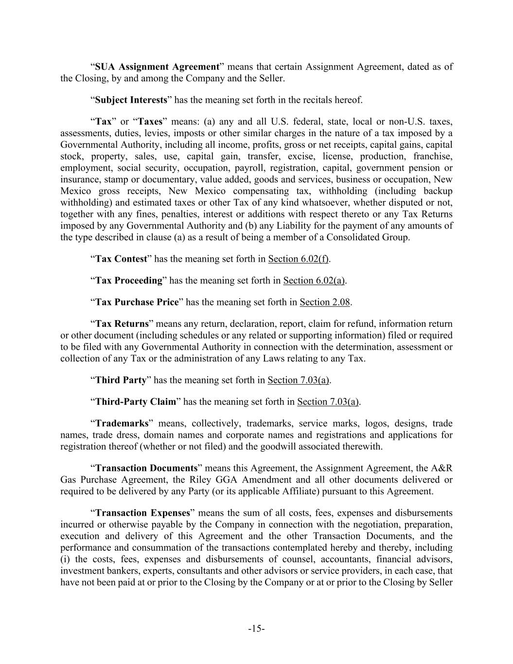 -15- “SUA Assignment Agreement” means that certain Assignment Agreement, dated as of the Closing, by and among the Company and the Seller. “Subject Interests” has the meaning set forth in the recitals hereof. “Tax” or “Taxes” means: (a) any and all U.S. federal, state, local or non-U.S. taxes, assessments, duties, levies, imposts or other similar charges in the nature of a tax imposed by a Governmental Authority, including all income, profits, gross or net receipts, capital gains, capital stock, property, sales, use, capital gain, transfer, excise, license, production, franchise, employment, social security, occupation, payroll, registration, capital, government pension or insurance, stamp or documentary, value added, goods and services, business or occupation, New Mexico gross receipts, New Mexico compensating tax, withholding (including backup withholding) and estimated taxes or other Tax of any kind whatsoever, whether disputed or not, together with any fines, penalties, interest or additions with respect thereto or any Tax Returns imposed by any Governmental Authority and (b) any Liability for the payment of any amounts of the type described in clause (a) as a result of being a member of a Consolidated Group. “Tax Contest” has the meaning set forth in Section 6.02(f). “Tax Proceeding” has the meaning set forth in Section 6.02(a). “Tax Purchase Price” has the meaning set forth in Section 2.08. “Tax Returns” means any return, declaration, report, claim for refund, information return or other document (including schedules or any related or supporting information) filed or required to be filed with any Governmental Authority in connection with the determination, assessment or collection of any Tax or the administration of any Laws relating to any Tax. “Third Party” has the meaning set forth in Section 7.03(a). “Third-Party Claim” has the meaning set forth in Section 7.03(a). “Trademarks” means, collectively, trademarks, service marks, logos, designs, trade names, trade dress, domain names and corporate names and registrations and applications for registration thereof (whether or not filed) and the goodwill associated therewith. “Transaction Documents” means this Agreement, the Assignment Agreement, the A&R Gas Purchase Agreement, the Riley GGA Amendment and all other documents delivered or required to be delivered by any Party (or its applicable Affiliate) pursuant to this Agreement. “Transaction Expenses” means the sum of all costs, fees, expenses and disbursements incurred or otherwise payable by the Company in connection with the negotiation, preparation, execution and delivery of this Agreement and the other Transaction Documents, and the performance and consummation of the transactions contemplated hereby and thereby, including (i) the costs, fees, expenses and disbursements of counsel, accountants, financial advisors, investment bankers, experts, consultants and other advisors or service providers, in each case, that have not been paid at or prior to the Closing by the Company or at or prior to the Closing by Seller