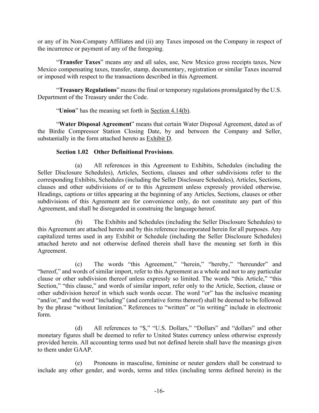 -16- or any of its Non-Company Affiliates and (ii) any Taxes imposed on the Company in respect of the incurrence or payment of any of the foregoing. “Transfer Taxes” means any and all sales, use, New Mexico gross receipts taxes, New Mexico compensating taxes, transfer, stamp, documentary, registration or similar Taxes incurred or imposed with respect to the transactions described in this Agreement. “Treasury Regulations” means the final or temporary regulations promulgated by the U.S. Department of the Treasury under the Code. “Union” has the meaning set forth in Section 4.14(b). “Water Disposal Agreement” means that certain Water Disposal Agreement, dated as of the Birdie Compressor Station Closing Date, by and between the Company and Seller, substantially in the form attached hereto as Exhibit D. Section 1.02 Other Definitional Provisions. (a) All references in this Agreement to Exhibits, Schedules (including the Seller Disclosure Schedules), Articles, Sections, clauses and other subdivisions refer to the corresponding Exhibits, Schedules (including the Seller Disclosure Schedules), Articles, Sections, clauses and other subdivisions of or to this Agreement unless expressly provided otherwise. Headings, captions or titles appearing at the beginning of any Articles, Sections, clauses or other subdivisions of this Agreement are for convenience only, do not constitute any part of this Agreement, and shall be disregarded in construing the language hereof. (b) The Exhibits and Schedules (including the Seller Disclosure Schedules) to this Agreement are attached hereto and by this reference incorporated herein for all purposes. Any capitalized terms used in any Exhibit or Schedule (including the Seller Disclosure Schedules) attached hereto and not otherwise defined therein shall have the meaning set forth in this Agreement. (c) The words “this Agreement,” “herein,” “hereby,” “hereunder” and “hereof,” and words of similar import, refer to this Agreement as a whole and not to any particular clause or other subdivision thereof unless expressly so limited. The words “this Article,” “this Section,” “this clause,” and words of similar import, refer only to the Article, Section, clause or other subdivision hereof in which such words occur. The word “or” has the inclusive meaning “and/or,” and the word “including” (and correlative forms thereof) shall be deemed to be followed by the phrase “without limitation.” References to “written” or “in writing” include in electronic form. (d) All references to “$,” “U.S. Dollars,” “Dollars” and “dollars” and other monetary figures shall be deemed to refer to United States currency unless otherwise expressly provided herein. All accounting terms used but not defined herein shall have the meanings given to them under GAAP. (e) Pronouns in masculine, feminine or neuter genders shall be construed to include any other gender, and words, terms and titles (including terms defined herein) in the