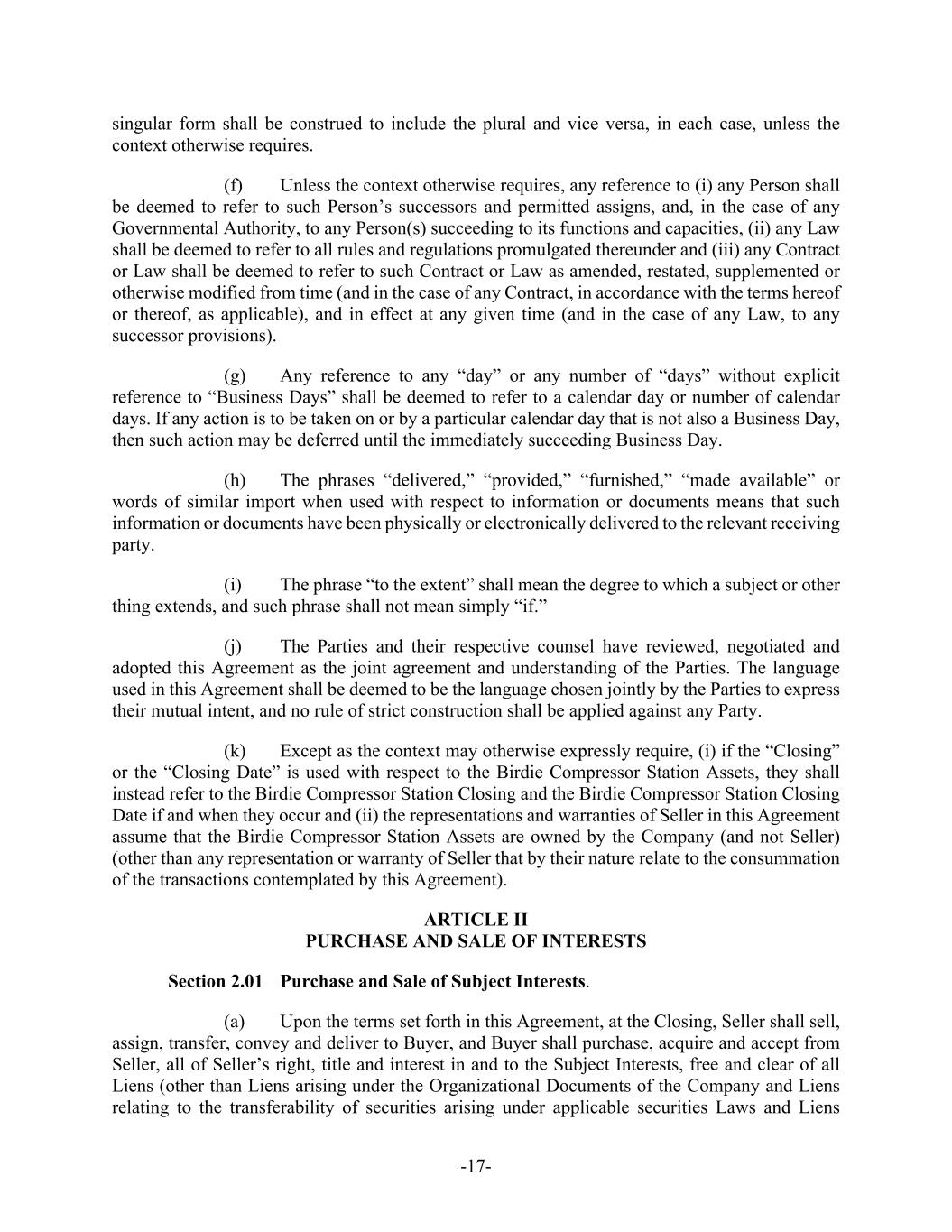 -17- singular form shall be construed to include the plural and vice versa, in each case, unless the context otherwise requires. (f) Unless the context otherwise requires, any reference to (i) any Person shall be deemed to refer to such Person’s successors and permitted assigns, and, in the case of any Governmental Authority, to any Person(s) succeeding to its functions and capacities, (ii) any Law shall be deemed to refer to all rules and regulations promulgated thereunder and (iii) any Contract or Law shall be deemed to refer to such Contract or Law as amended, restated, supplemented or otherwise modified from time (and in the case of any Contract, in accordance with the terms hereof or thereof, as applicable), and in effect at any given time (and in the case of any Law, to any successor provisions). (g) Any reference to any “day” or any number of “days” without explicit reference to “Business Days” shall be deemed to refer to a calendar day or number of calendar days. If any action is to be taken on or by a particular calendar day that is not also a Business Day, then such action may be deferred until the immediately succeeding Business Day. (h) The phrases “delivered,” “provided,” “furnished,” “made available” or words of similar import when used with respect to information or documents means that such information or documents have been physically or electronically delivered to the relevant receiving party. (i) The phrase “to the extent” shall mean the degree to which a subject or other thing extends, and such phrase shall not mean simply “if.” (j) The Parties and their respective counsel have reviewed, negotiated and adopted this Agreement as the joint agreement and understanding of the Parties. The language used in this Agreement shall be deemed to be the language chosen jointly by the Parties to express their mutual intent, and no rule of strict construction shall be applied against any Party. (k) Except as the context may otherwise expressly require, (i) if the “Closing” or the “Closing Date” is used with respect to the Birdie Compressor Station Assets, they shall instead refer to the Birdie Compressor Station Closing and the Birdie Compressor Station Closing Date if and when they occur and (ii) the representations and warranties of Seller in this Agreement assume that the Birdie Compressor Station Assets are owned by the Company (and not Seller) (other than any representation or warranty of Seller that by their nature relate to the consummation of the transactions contemplated by this Agreement). ARTICLE II PURCHASE AND SALE OF INTERESTS Section 2.01 Purchase and Sale of Subject Interests. (a) Upon the terms set forth in this Agreement, at the Closing, Seller shall sell, assign, transfer, convey and deliver to Buyer, and Buyer shall purchase, acquire and accept from Seller, all of Seller’s right, title and interest in and to the Subject Interests, free and clear of all Liens (other than Liens arising under the Organizational Documents of the Company and Liens relating to the transferability of securities arising under applicable securities Laws and Liens