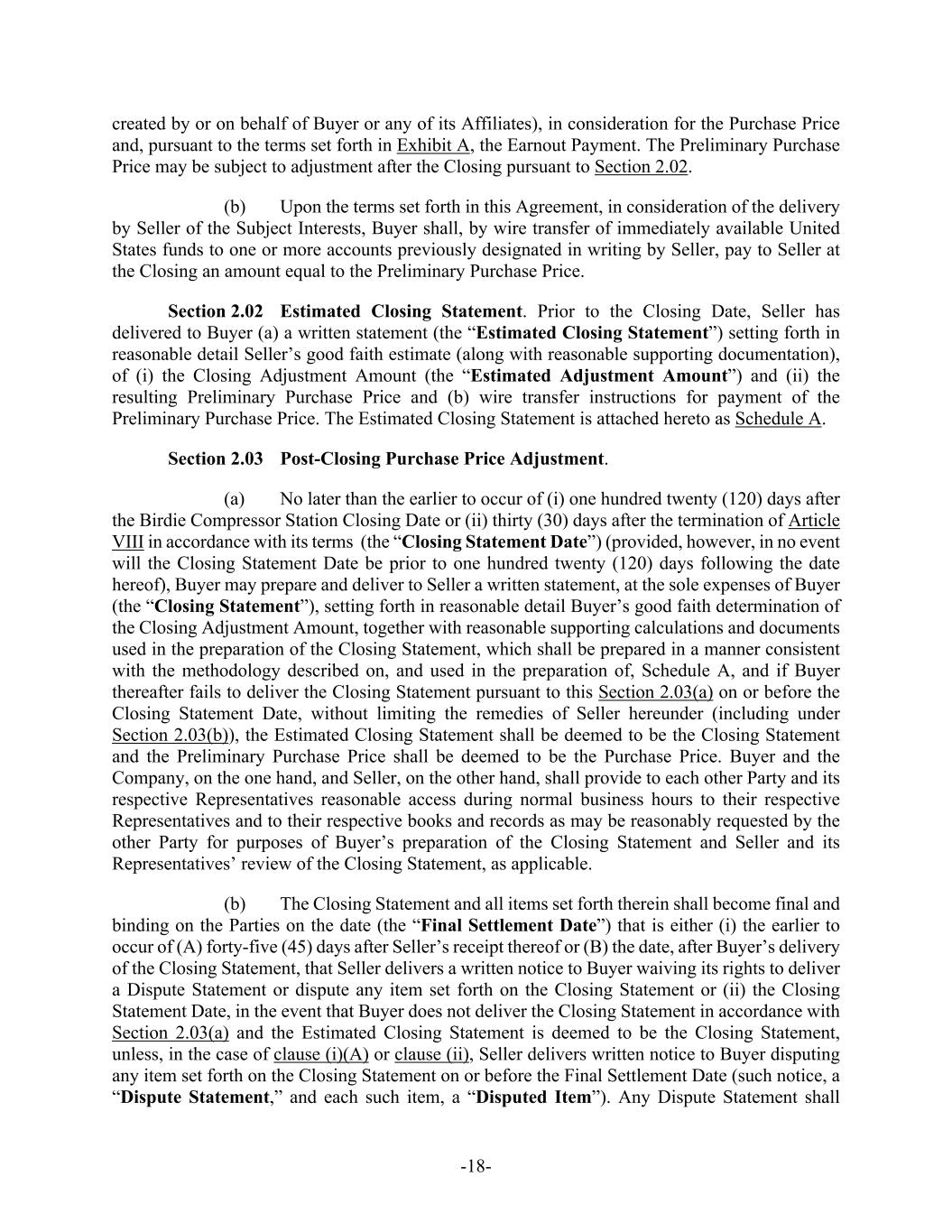 -18- created by or on behalf of Buyer or any of its Affiliates), in consideration for the Purchase Price and, pursuant to the terms set forth in Exhibit A, the Earnout Payment. The Preliminary Purchase Price may be subject to adjustment after the Closing pursuant to Section 2.02. (b) Upon the terms set forth in this Agreement, in consideration of the delivery by Seller of the Subject Interests, Buyer shall, by wire transfer of immediately available United States funds to one or more accounts previously designated in writing by Seller, pay to Seller at the Closing an amount equal to the Preliminary Purchase Price. Section 2.02 Estimated Closing Statement. Prior to the Closing Date, Seller has delivered to Buyer (a) a written statement (the “Estimated Closing Statement”) setting forth in reasonable detail Seller’s good faith estimate (along with reasonable supporting documentation), of (i) the Closing Adjustment Amount (the “Estimated Adjustment Amount”) and (ii) the resulting Preliminary Purchase Price and (b) wire transfer instructions for payment of the Preliminary Purchase Price. The Estimated Closing Statement is attached hereto as Schedule A. Section 2.03 Post-Closing Purchase Price Adjustment. (a) No later than the earlier to occur of (i) one hundred twenty (120) days after the Birdie Compressor Station Closing Date or (ii) thirty (30) days after the termination of Article VIII in accordance with its terms (the “Closing Statement Date”) (provided, however, in no event will the Closing Statement Date be prior to one hundred twenty (120) days following the date hereof), Buyer may prepare and deliver to Seller a written statement, at the sole expenses of Buyer (the “Closing Statement”), setting forth in reasonable detail Buyer’s good faith determination of the Closing Adjustment Amount, together with reasonable supporting calculations and documents used in the preparation of the Closing Statement, which shall be prepared in a manner consistent with the methodology described on, and used in the preparation of, Schedule A, and if Buyer thereafter fails to deliver the Closing Statement pursuant to this Section 2.03(a) on or before the Closing Statement Date, without limiting the remedies of Seller hereunder (including under Section 2.03(b)), the Estimated Closing Statement shall be deemed to be the Closing Statement and the Preliminary Purchase Price shall be deemed to be the Purchase Price. Buyer and the Company, on the one hand, and Seller, on the other hand, shall provide to each other Party and its respective Representatives reasonable access during normal business hours to their respective Representatives and to their respective books and records as may be reasonably requested by the other Party for purposes of Buyer’s preparation of the Closing Statement and Seller and its Representatives’ review of the Closing Statement, as applicable. (b) The Closing Statement and all items set forth therein shall become final and binding on the Parties on the date (the “Final Settlement Date”) that is either (i) the earlier to occur of (A) forty-five (45) days after Seller’s receipt thereof or (B) the date, after Buyer’s delivery of the Closing Statement, that Seller delivers a written notice to Buyer waiving its rights to deliver a Dispute Statement or dispute any item set forth on the Closing Statement or (ii) the Closing Statement Date, in the event that Buyer does not deliver the Closing Statement in accordance with Section 2.03(a) and the Estimated Closing Statement is deemed to be the Closing Statement, unless, in the case of clause (i)(A) or clause (ii), Seller delivers written notice to Buyer disputing any item set forth on the Closing Statement on or before the Final Settlement Date (such notice, a “Dispute Statement,” and each such item, a “Disputed Item”). Any Dispute Statement shall