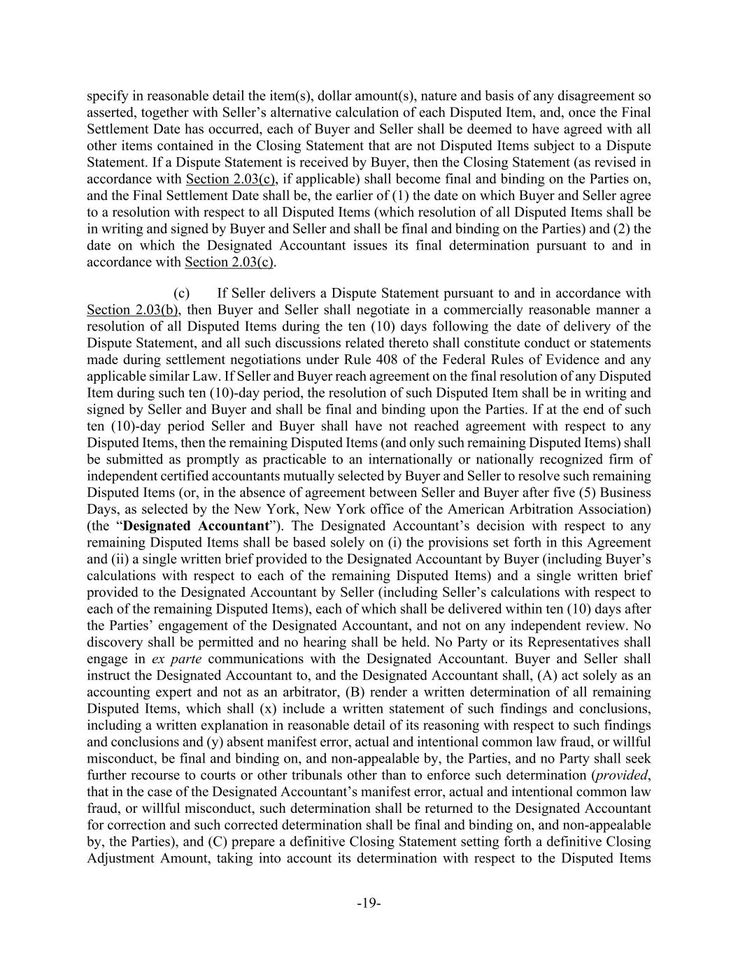 -19- specify in reasonable detail the item(s), dollar amount(s), nature and basis of any disagreement so asserted, together with Seller’s alternative calculation of each Disputed Item, and, once the Final Settlement Date has occurred, each of Buyer and Seller shall be deemed to have agreed with all other items contained in the Closing Statement that are not Disputed Items subject to a Dispute Statement. If a Dispute Statement is received by Buyer, then the Closing Statement (as revised in accordance with Section 2.03(c), if applicable) shall become final and binding on the Parties on, and the Final Settlement Date shall be, the earlier of (1) the date on which Buyer and Seller agree to a resolution with respect to all Disputed Items (which resolution of all Disputed Items shall be in writing and signed by Buyer and Seller and shall be final and binding on the Parties) and (2) the date on which the Designated Accountant issues its final determination pursuant to and in accordance with Section 2.03(c). (c) If Seller delivers a Dispute Statement pursuant to and in accordance with Section 2.03(b), then Buyer and Seller shall negotiate in a commercially reasonable manner a resolution of all Disputed Items during the ten (10) days following the date of delivery of the Dispute Statement, and all such discussions related thereto shall constitute conduct or statements made during settlement negotiations under Rule 408 of the Federal Rules of Evidence and any applicable similar Law. If Seller and Buyer reach agreement on the final resolution of any Disputed Item during such ten (10)-day period, the resolution of such Disputed Item shall be in writing and signed by Seller and Buyer and shall be final and binding upon the Parties. If at the end of such ten (10)-day period Seller and Buyer shall have not reached agreement with respect to any Disputed Items, then the remaining Disputed Items (and only such remaining Disputed Items) shall be submitted as promptly as practicable to an internationally or nationally recognized firm of independent certified accountants mutually selected by Buyer and Seller to resolve such remaining Disputed Items (or, in the absence of agreement between Seller and Buyer after five (5) Business Days, as selected by the New York, New York office of the American Arbitration Association) (the “Designated Accountant”). The Designated Accountant’s decision with respect to any remaining Disputed Items shall be based solely on (i) the provisions set forth in this Agreement and (ii) a single written brief provided to the Designated Accountant by Buyer (including Buyer’s calculations with respect to each of the remaining Disputed Items) and a single written brief provided to the Designated Accountant by Seller (including Seller’s calculations with respect to each of the remaining Disputed Items), each of which shall be delivered within ten (10) days after the Parties’ engagement of the Designated Accountant, and not on any independent review. No discovery shall be permitted and no hearing shall be held. No Party or its Representatives shall engage in ex parte communications with the Designated Accountant. Buyer and Seller shall instruct the Designated Accountant to, and the Designated Accountant shall, (A) act solely as an accounting expert and not as an arbitrator, (B) render a written determination of all remaining Disputed Items, which shall (x) include a written statement of such findings and conclusions, including a written explanation in reasonable detail of its reasoning with respect to such findings and conclusions and (y) absent manifest error, actual and intentional common law fraud, or willful misconduct, be final and binding on, and non-appealable by, the Parties, and no Party shall seek further recourse to courts or other tribunals other than to enforce such determination (provided, that in the case of the Designated Accountant’s manifest error, actual and intentional common law fraud, or willful misconduct, such determination shall be returned to the Designated Accountant for correction and such corrected determination shall be final and binding on, and non-appealable by, the Parties), and (C) prepare a definitive Closing Statement setting forth a definitive Closing Adjustment Amount, taking into account its determination with respect to the Disputed Items