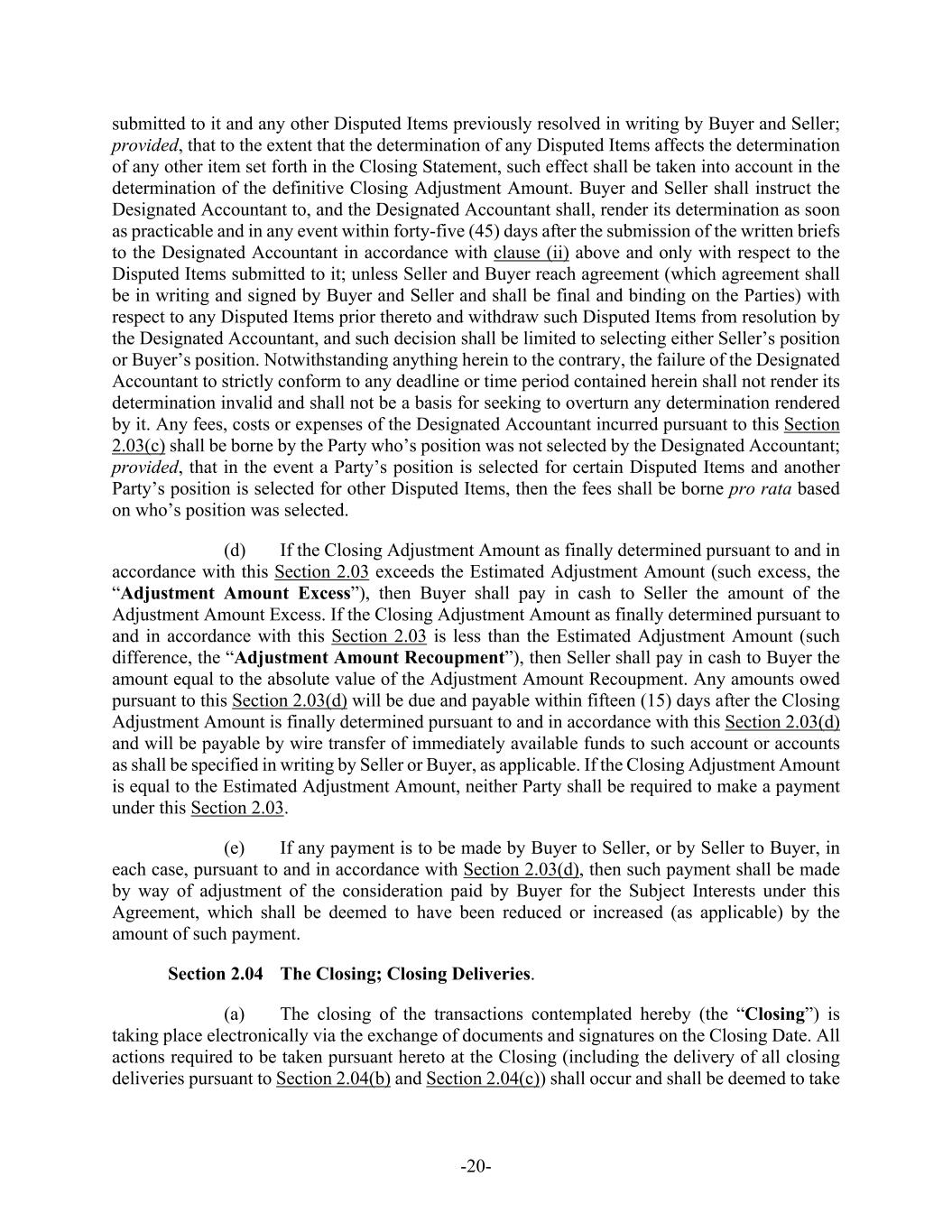 -20- submitted to it and any other Disputed Items previously resolved in writing by Buyer and Seller; provided, that to the extent that the determination of any Disputed Items affects the determination of any other item set forth in the Closing Statement, such effect shall be taken into account in the determination of the definitive Closing Adjustment Amount. Buyer and Seller shall instruct the Designated Accountant to, and the Designated Accountant shall, render its determination as soon as practicable and in any event within forty-five (45) days after the submission of the written briefs to the Designated Accountant in accordance with clause (ii) above and only with respect to the Disputed Items submitted to it; unless Seller and Buyer reach agreement (which agreement shall be in writing and signed by Buyer and Seller and shall be final and binding on the Parties) with respect to any Disputed Items prior thereto and withdraw such Disputed Items from resolution by the Designated Accountant, and such decision shall be limited to selecting either Seller’s position or Buyer’s position. Notwithstanding anything herein to the contrary, the failure of the Designated Accountant to strictly conform to any deadline or time period contained herein shall not render its determination invalid and shall not be a basis for seeking to overturn any determination rendered by it. Any fees, costs or expenses of the Designated Accountant incurred pursuant to this Section 2.03(c) shall be borne by the Party who’s position was not selected by the Designated Accountant; provided, that in the event a Party’s position is selected for certain Disputed Items and another Party’s position is selected for other Disputed Items, then the fees shall be borne pro rata based on who’s position was selected. (d) If the Closing Adjustment Amount as finally determined pursuant to and in accordance with this Section 2.03 exceeds the Estimated Adjustment Amount (such excess, the “Adjustment Amount Excess”), then Buyer shall pay in cash to Seller the amount of the Adjustment Amount Excess. If the Closing Adjustment Amount as finally determined pursuant to and in accordance with this Section 2.03 is less than the Estimated Adjustment Amount (such difference, the “Adjustment Amount Recoupment”), then Seller shall pay in cash to Buyer the amount equal to the absolute value of the Adjustment Amount Recoupment. Any amounts owed pursuant to this Section 2.03(d) will be due and payable within fifteen (15) days after the Closing Adjustment Amount is finally determined pursuant to and in accordance with this Section 2.03(d) and will be payable by wire transfer of immediately available funds to such account or accounts as shall be specified in writing by Seller or Buyer, as applicable. If the Closing Adjustment Amount is equal to the Estimated Adjustment Amount, neither Party shall be required to make a payment under this Section 2.03. (e) If any payment is to be made by Buyer to Seller, or by Seller to Buyer, in each case, pursuant to and in accordance with Section 2.03(d), then such payment shall be made by way of adjustment of the consideration paid by Buyer for the Subject Interests under this Agreement, which shall be deemed to have been reduced or increased (as applicable) by the amount of such payment. Section 2.04 The Closing; Closing Deliveries. (a) The closing of the transactions contemplated hereby (the “Closing”) is taking place electronically via the exchange of documents and signatures on the Closing Date. All actions required to be taken pursuant hereto at the Closing (including the delivery of all closing deliveries pursuant to Section 2.04(b) and Section 2.04(c)) shall occur and shall be deemed to take