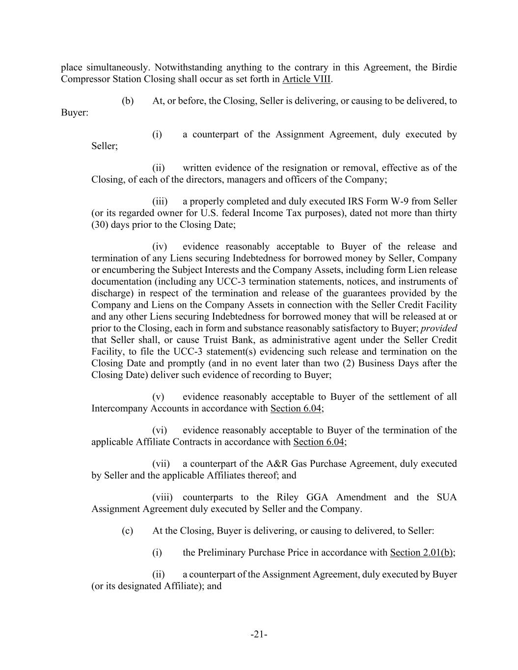 -21- place simultaneously. Notwithstanding anything to the contrary in this Agreement, the Birdie Compressor Station Closing shall occur as set forth in Article VIII. (b) At, or before, the Closing, Seller is delivering, or causing to be delivered, to Buyer: (i) a counterpart of the Assignment Agreement, duly executed by Seller; (ii) written evidence of the resignation or removal, effective as of the Closing, of each of the directors, managers and officers of the Company; (iii) a properly completed and duly executed IRS Form W-9 from Seller (or its regarded owner for U.S. federal Income Tax purposes), dated not more than thirty (30) days prior to the Closing Date; (iv) evidence reasonably acceptable to Buyer of the release and termination of any Liens securing Indebtedness for borrowed money by Seller, Company or encumbering the Subject Interests and the Company Assets, including form Lien release documentation (including any UCC-3 termination statements, notices, and instruments of discharge) in respect of the termination and release of the guarantees provided by the Company and Liens on the Company Assets in connection with the Seller Credit Facility and any other Liens securing Indebtedness for borrowed money that will be released at or prior to the Closing, each in form and substance reasonably satisfactory to Buyer; provided that Seller shall, or cause Truist Bank, as administrative agent under the Seller Credit Facility, to file the UCC-3 statement(s) evidencing such release and termination on the Closing Date and promptly (and in no event later than two (2) Business Days after the Closing Date) deliver such evidence of recording to Buyer; (v) evidence reasonably acceptable to Buyer of the settlement of all Intercompany Accounts in accordance with Section 6.04; (vi) evidence reasonably acceptable to Buyer of the termination of the applicable Affiliate Contracts in accordance with Section 6.04; (vii) a counterpart of the A&R Gas Purchase Agreement, duly executed by Seller and the applicable Affiliates thereof; and (viii) counterparts to the Riley GGA Amendment and the SUA Assignment Agreement duly executed by Seller and the Company. (c) At the Closing, Buyer is delivering, or causing to delivered, to Seller: (i) the Preliminary Purchase Price in accordance with Section 2.01(b); (ii) a counterpart of the Assignment Agreement, duly executed by Buyer (or its designated Affiliate); and