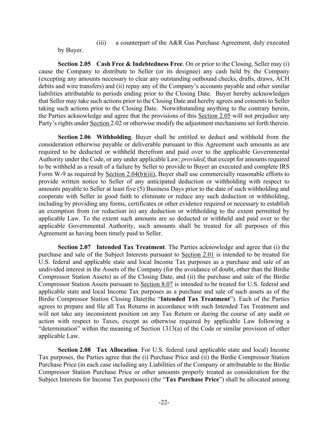 -22- (iii) a counterpart of the A&R Gas Purchase Agreement, duly executed by Buyer. Section 2.05 Cash Free & Indebtedness Free. On or prior to the Closing, Seller may (i) cause the Company to distribute to Seller (or its designee) any cash held by the Company (excepting any amounts necessary to clear any outstanding outbound checks, drafts, draws, ACH debits and wire transfers) and (ii) repay any of the Company’s accounts payable and other similar liabilities attributable to periods ending prior to the Closing Date. Buyer hereby acknowledges that Seller may take such actions prior to the Closing Date and hereby agrees and consents to Seller taking such actions prior to the Closing Date. Notwithstanding anything to the contrary herein, the Parties acknowledge and agree that the provisions of this Section 2.05 will not prejudice any Party’s rights under Section 2.02 or otherwise modify the adjustment mechanisms set forth therein. Section 2.06 Withholding. Buyer shall be entitled to deduct and withhold from the consideration otherwise payable or deliverable pursuant to this Agreement such amounts as are required to be deducted or withheld therefrom and paid over to the applicable Governmental Authority under the Code, or any under applicable Law; provided, that except for amounts required to be withheld as a result of a failure by Seller to provide to Buyer an executed and complete IRS Form W-9 as required by Section 2.04(b)(iii), Buyer shall use commercially reasonable efforts to provide written notice to Seller of any anticipated deduction or withholding with respect to amounts payable to Seller at least five (5) Business Days prior to the date of such withholding and cooperate with Seller in good faith to eliminate or reduce any such deduction or withholding, including by providing any forms, certificates or other evidence required or necessary to establish an exemption from (or reduction in) any deduction or withholding to the extent permitted by applicable Law. To the extent such amounts are so deducted or withheld and paid over to the applicable Governmental Authority, such amounts shall be treated for all purposes of this Agreement as having been timely paid to Seller. Section 2.07 Intended Tax Treatment. The Parties acknowledge and agree that (i) the purchase and sale of the Subject Interests pursuant to Section 2.01 is intended to be treated for U.S. federal and applicable state and local Income Tax purposes as a purchase and sale of an undivided interest in the Assets of the Company (for the avoidance of doubt, other than the Birdie Compressor Station Assets) as of the Closing Date, and (ii) the purchase and sale of the Birdie Compressor Station Assets pursuant to Section 8.07 is intended to be treated for U.S. federal and applicable state and local Income Tax purposes as a purchase and sale of such assets as of the Birdie Compressor Station Closing Date(the “Intended Tax Treatment”). Each of the Parties agrees to prepare and file all Tax Returns in accordance with such Intended Tax Treatment and will not take any inconsistent position on any Tax Return or during the course of any audit or action with respect to Taxes, except as otherwise required by applicable Law following a “determination” within the meaning of Section 1313(a) of the Code or similar provision of other applicable Law. Section 2.08 Tax Allocation. For U.S. federal (and applicable state and local) Income Tax purposes, the Parties agree that the (i) Purchase Price and (ii) the Birdie Compressor Station Purchase Price (in each case including any Liabilities of the Company or attributable to the Birdie Compressor Station Purchase Price or other amounts properly treated as consideration for the Subject Interests for Income Tax purposes) (the “Tax Purchase Price”) shall be allocated among