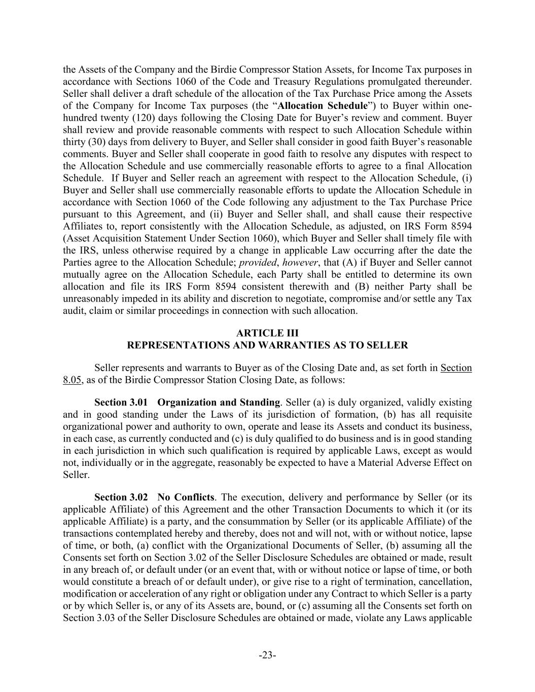 -23- the Assets of the Company and the Birdie Compressor Station Assets, for Income Tax purposes in accordance with Sections 1060 of the Code and Treasury Regulations promulgated thereunder. Seller shall deliver a draft schedule of the allocation of the Tax Purchase Price among the Assets of the Company for Income Tax purposes (the “Allocation Schedule”) to Buyer within one- hundred twenty (120) days following the Closing Date for Buyer’s review and comment. Buyer shall review and provide reasonable comments with respect to such Allocation Schedule within thirty (30) days from delivery to Buyer, and Seller shall consider in good faith Buyer’s reasonable comments. Buyer and Seller shall cooperate in good faith to resolve any disputes with respect to the Allocation Schedule and use commercially reasonable efforts to agree to a final Allocation Schedule. If Buyer and Seller reach an agreement with respect to the Allocation Schedule, (i) Buyer and Seller shall use commercially reasonable efforts to update the Allocation Schedule in accordance with Section 1060 of the Code following any adjustment to the Tax Purchase Price pursuant to this Agreement, and (ii) Buyer and Seller shall, and shall cause their respective Affiliates to, report consistently with the Allocation Schedule, as adjusted, on IRS Form 8594 (Asset Acquisition Statement Under Section 1060), which Buyer and Seller shall timely file with the IRS, unless otherwise required by a change in applicable Law occurring after the date the Parties agree to the Allocation Schedule; provided, however, that (A) if Buyer and Seller cannot mutually agree on the Allocation Schedule, each Party shall be entitled to determine its own allocation and file its IRS Form 8594 consistent therewith and (B) neither Party shall be unreasonably impeded in its ability and discretion to negotiate, compromise and/or settle any Tax audit, claim or similar proceedings in connection with such allocation. ARTICLE III REPRESENTATIONS AND WARRANTIES AS TO SELLER Seller represents and warrants to Buyer as of the Closing Date and, as set forth in Section 8.05, as of the Birdie Compressor Station Closing Date, as follows: Section 3.01 Organization and Standing. Seller (a) is duly organized, validly existing and in good standing under the Laws of its jurisdiction of formation, (b) has all requisite organizational power and authority to own, operate and lease its Assets and conduct its business, in each case, as currently conducted and (c) is duly qualified to do business and is in good standing in each jurisdiction in which such qualification is required by applicable Laws, except as would not, individually or in the aggregate, reasonably be expected to have a Material Adverse Effect on Seller. Section 3.02 No Conflicts. The execution, delivery and performance by Seller (or its applicable Affiliate) of this Agreement and the other Transaction Documents to which it (or its applicable Affiliate) is a party, and the consummation by Seller (or its applicable Affiliate) of the transactions contemplated hereby and thereby, does not and will not, with or without notice, lapse of time, or both, (a) conflict with the Organizational Documents of Seller, (b) assuming all the Consents set forth on Section 3.02 of the Seller Disclosure Schedules are obtained or made, result in any breach of, or default under (or an event that, with or without notice or lapse of time, or both would constitute a breach of or default under), or give rise to a right of termination, cancellation, modification or acceleration of any right or obligation under any Contract to which Seller is a party or by which Seller is, or any of its Assets are, bound, or (c) assuming all the Consents set forth on Section 3.03 of the Seller Disclosure Schedules are obtained or made, violate any Laws applicable