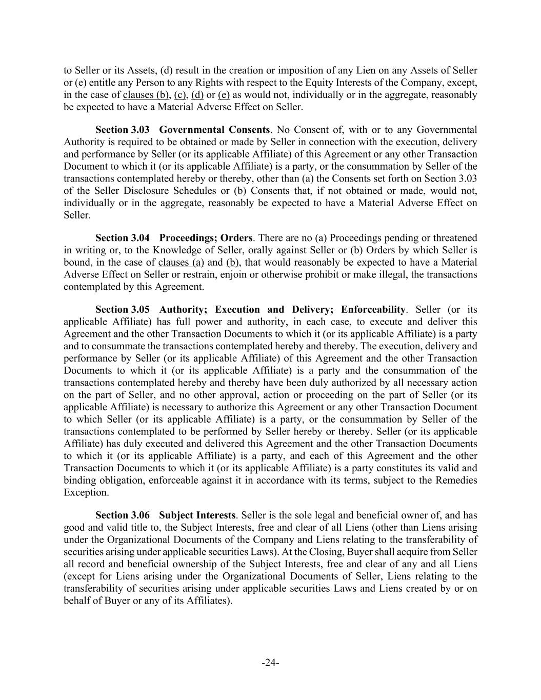 -24- to Seller or its Assets, (d) result in the creation or imposition of any Lien on any Assets of Seller or (e) entitle any Person to any Rights with respect to the Equity Interests of the Company, except, in the case of clauses (b), (c), (d) or (e) as would not, individually or in the aggregate, reasonably be expected to have a Material Adverse Effect on Seller. Section 3.03 Governmental Consents. No Consent of, with or to any Governmental Authority is required to be obtained or made by Seller in connection with the execution, delivery and performance by Seller (or its applicable Affiliate) of this Agreement or any other Transaction Document to which it (or its applicable Affiliate) is a party, or the consummation by Seller of the transactions contemplated hereby or thereby, other than (a) the Consents set forth on Section 3.03 of the Seller Disclosure Schedules or (b) Consents that, if not obtained or made, would not, individually or in the aggregate, reasonably be expected to have a Material Adverse Effect on Seller. Section 3.04 Proceedings; Orders. There are no (a) Proceedings pending or threatened in writing or, to the Knowledge of Seller, orally against Seller or (b) Orders by which Seller is bound, in the case of clauses (a) and (b), that would reasonably be expected to have a Material Adverse Effect on Seller or restrain, enjoin or otherwise prohibit or make illegal, the transactions contemplated by this Agreement. Section 3.05 Authority; Execution and Delivery; Enforceability. Seller (or its applicable Affiliate) has full power and authority, in each case, to execute and deliver this Agreement and the other Transaction Documents to which it (or its applicable Affiliate) is a party and to consummate the transactions contemplated hereby and thereby. The execution, delivery and performance by Seller (or its applicable Affiliate) of this Agreement and the other Transaction Documents to which it (or its applicable Affiliate) is a party and the consummation of the transactions contemplated hereby and thereby have been duly authorized by all necessary action on the part of Seller, and no other approval, action or proceeding on the part of Seller (or its applicable Affiliate) is necessary to authorize this Agreement or any other Transaction Document to which Seller (or its applicable Affiliate) is a party, or the consummation by Seller of the transactions contemplated to be performed by Seller hereby or thereby. Seller (or its applicable Affiliate) has duly executed and delivered this Agreement and the other Transaction Documents to which it (or its applicable Affiliate) is a party, and each of this Agreement and the other Transaction Documents to which it (or its applicable Affiliate) is a party constitutes its valid and binding obligation, enforceable against it in accordance with its terms, subject to the Remedies Exception. Section 3.06 Subject Interests. Seller is the sole legal and beneficial owner of, and has good and valid title to, the Subject Interests, free and clear of all Liens (other than Liens arising under the Organizational Documents of the Company and Liens relating to the transferability of securities arising under applicable securities Laws). At the Closing, Buyer shall acquire from Seller all record and beneficial ownership of the Subject Interests, free and clear of any and all Liens (except for Liens arising under the Organizational Documents of Seller, Liens relating to the transferability of securities arising under applicable securities Laws and Liens created by or on behalf of Buyer or any of its Affiliates).