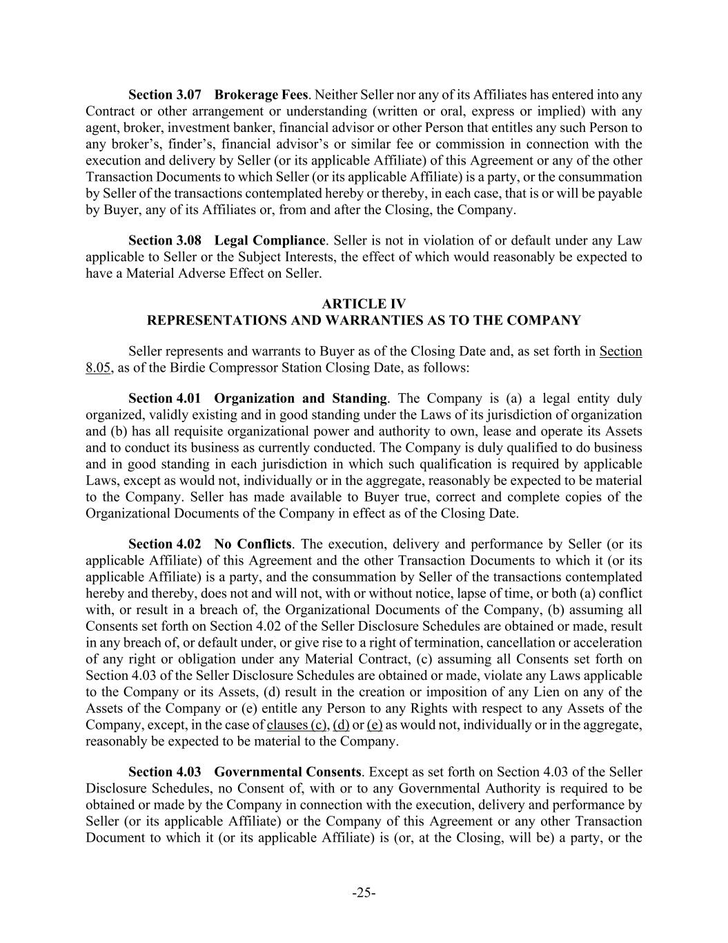 -25- Section 3.07 Brokerage Fees. Neither Seller nor any of its Affiliates has entered into any Contract or other arrangement or understanding (written or oral, express or implied) with any agent, broker, investment banker, financial advisor or other Person that entitles any such Person to any broker’s, finder’s, financial advisor’s or similar fee or commission in connection with the execution and delivery by Seller (or its applicable Affiliate) of this Agreement or any of the other Transaction Documents to which Seller (or its applicable Affiliate) is a party, or the consummation by Seller of the transactions contemplated hereby or thereby, in each case, that is or will be payable by Buyer, any of its Affiliates or, from and after the Closing, the Company. Section 3.08 Legal Compliance. Seller is not in violation of or default under any Law applicable to Seller or the Subject Interests, the effect of which would reasonably be expected to have a Material Adverse Effect on Seller. ARTICLE IV REPRESENTATIONS AND WARRANTIES AS TO THE COMPANY Seller represents and warrants to Buyer as of the Closing Date and, as set forth in Section 8.05, as of the Birdie Compressor Station Closing Date, as follows: Section 4.01 Organization and Standing. The Company is (a) a legal entity duly organized, validly existing and in good standing under the Laws of its jurisdiction of organization and (b) has all requisite organizational power and authority to own, lease and operate its Assets and to conduct its business as currently conducted. The Company is duly qualified to do business and in good standing in each jurisdiction in which such qualification is required by applicable Laws, except as would not, individually or in the aggregate, reasonably be expected to be material to the Company. Seller has made available to Buyer true, correct and complete copies of the Organizational Documents of the Company in effect as of the Closing Date. Section 4.02 No Conflicts. The execution, delivery and performance by Seller (or its applicable Affiliate) of this Agreement and the other Transaction Documents to which it (or its applicable Affiliate) is a party, and the consummation by Seller of the transactions contemplated hereby and thereby, does not and will not, with or without notice, lapse of time, or both (a) conflict with, or result in a breach of, the Organizational Documents of the Company, (b) assuming all Consents set forth on Section 4.02 of the Seller Disclosure Schedules are obtained or made, result in any breach of, or default under, or give rise to a right of termination, cancellation or acceleration of any right or obligation under any Material Contract, (c) assuming all Consents set forth on Section 4.03 of the Seller Disclosure Schedules are obtained or made, violate any Laws applicable to the Company or its Assets, (d) result in the creation or imposition of any Lien on any of the Assets of the Company or (e) entitle any Person to any Rights with respect to any Assets of the Company, except, in the case of clauses (c), (d) or (e) as would not, individually or in the aggregate, reasonably be expected to be material to the Company. Section 4.03 Governmental Consents. Except as set forth on Section 4.03 of the Seller Disclosure Schedules, no Consent of, with or to any Governmental Authority is required to be obtained or made by the Company in connection with the execution, delivery and performance by Seller (or its applicable Affiliate) or the Company of this Agreement or any other Transaction Document to which it (or its applicable Affiliate) is (or, at the Closing, will be) a party, or the