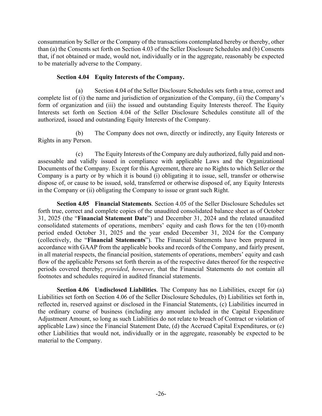 -26- consummation by Seller or the Company of the transactions contemplated hereby or thereby, other than (a) the Consents set forth on Section 4.03 of the Seller Disclosure Schedules and (b) Consents that, if not obtained or made, would not, individually or in the aggregate, reasonably be expected to be materially adverse to the Company. Section 4.04 Equity Interests of the Company. (a) Section 4.04 of the Seller Disclosure Schedules sets forth a true, correct and complete list of (i) the name and jurisdiction of organization of the Company, (ii) the Company’s form of organization and (iii) the issued and outstanding Equity Interests thereof. The Equity Interests set forth on Section 4.04 of the Seller Disclosure Schedules constitute all of the authorized, issued and outstanding Equity Interests of the Company. (b) The Company does not own, directly or indirectly, any Equity Interests or Rights in any Person. (c) The Equity Interests of the Company are duly authorized, fully paid and non- assessable and validly issued in compliance with applicable Laws and the Organizational Documents of the Company. Except for this Agreement, there are no Rights to which Seller or the Company is a party or by which it is bound (i) obligating it to issue, sell, transfer or otherwise dispose of, or cause to be issued, sold, transferred or otherwise disposed of, any Equity Interests in the Company or (ii) obligating the Company to issue or grant such Right. Section 4.05 Financial Statements. Section 4.05 of the Seller Disclosure Schedules set forth true, correct and complete copies of the unaudited consolidated balance sheet as of October 31, 2025 (the “Financial Statement Date”) and December 31, 2024 and the related unaudited consolidated statements of operations, members’ equity and cash flows for the ten (10)-month period ended October 31, 2025 and the year ended December 31, 2024 for the Company (collectively, the “Financial Statements”). The Financial Statements have been prepared in accordance with GAAP from the applicable books and records of the Company, and fairly present, in all material respects, the financial position, statements of operations, members’ equity and cash flow of the applicable Persons set forth therein as of the respective dates thereof for the respective periods covered thereby; provided, however, that the Financial Statements do not contain all footnotes and schedules required in audited financial statements. Section 4.06 Undisclosed Liabilities. The Company has no Liabilities, except for (a) Liabilities set forth on Section 4.06 of the Seller Disclosure Schedules, (b) Liabilities set forth in, reflected in, reserved against or disclosed in the Financial Statements, (c) Liabilities incurred in the ordinary course of business (including any amount included in the Capital Expenditure Adjustment Amount, so long as such Liabilities do not relate to breach of Contract or violation of applicable Law) since the Financial Statement Date, (d) the Accrued Capital Expenditures, or (e) other Liabilities that would not, individually or in the aggregate, reasonably be expected to be material to the Company.