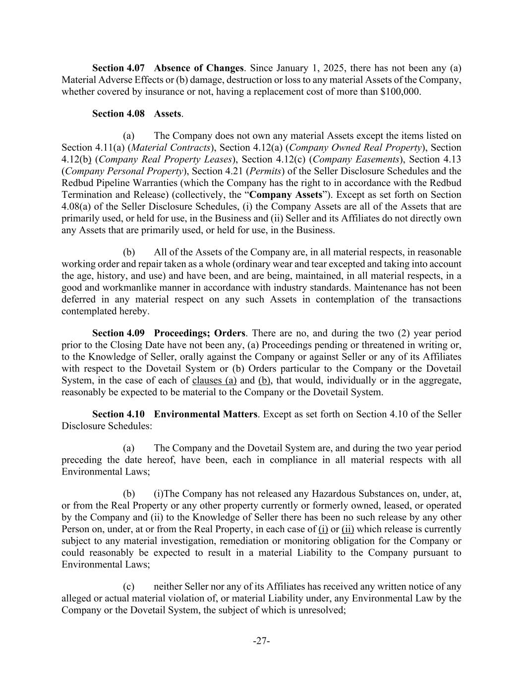 -27- Section 4.07 Absence of Changes. Since January 1, 2025, there has not been any (a) Material Adverse Effects or (b) damage, destruction or loss to any material Assets of the Company, whether covered by insurance or not, having a replacement cost of more than $100,000. Section 4.08 Assets. (a) The Company does not own any material Assets except the items listed on Section 4.11(a) (Material Contracts), Section 4.12(a) (Company Owned Real Property), Section 4.12(b) (Company Real Property Leases), Section 4.12(c) (Company Easements), Section 4.13 (Company Personal Property), Section 4.21 (Permits) of the Seller Disclosure Schedules and the Redbud Pipeline Warranties (which the Company has the right to in accordance with the Redbud Termination and Release) (collectively, the “Company Assets”). Except as set forth on Section 4.08(a) of the Seller Disclosure Schedules, (i) the Company Assets are all of the Assets that are primarily used, or held for use, in the Business and (ii) Seller and its Affiliates do not directly own any Assets that are primarily used, or held for use, in the Business. (b) All of the Assets of the Company are, in all material respects, in reasonable working order and repair taken as a whole (ordinary wear and tear excepted and taking into account the age, history, and use) and have been, and are being, maintained, in all material respects, in a good and workmanlike manner in accordance with industry standards. Maintenance has not been deferred in any material respect on any such Assets in contemplation of the transactions contemplated hereby. Section 4.09 Proceedings; Orders. There are no, and during the two (2) year period prior to the Closing Date have not been any, (a) Proceedings pending or threatened in writing or, to the Knowledge of Seller, orally against the Company or against Seller or any of its Affiliates with respect to the Dovetail System or (b) Orders particular to the Company or the Dovetail System, in the case of each of clauses (a) and (b), that would, individually or in the aggregate, reasonably be expected to be material to the Company or the Dovetail System. Section 4.10 Environmental Matters. Except as set forth on Section 4.10 of the Seller Disclosure Schedules: (a) The Company and the Dovetail System are, and during the two year period preceding the date hereof, have been, each in compliance in all material respects with all Environmental Laws; (b) (i)The Company has not released any Hazardous Substances on, under, at, or from the Real Property or any other property currently or formerly owned, leased, or operated by the Company and (ii) to the Knowledge of Seller there has been no such release by any other Person on, under, at or from the Real Property, in each case of (i) or (ii) which release is currently subject to any material investigation, remediation or monitoring obligation for the Company or could reasonably be expected to result in a material Liability to the Company pursuant to Environmental Laws; (c) neither Seller nor any of its Affiliates has received any written notice of any alleged or actual material violation of, or material Liability under, any Environmental Law by the Company or the Dovetail System, the subject of which is unresolved;