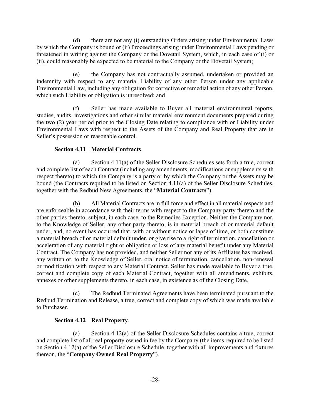 -28- (d) there are not any (i) outstanding Orders arising under Environmental Laws by which the Company is bound or (ii) Proceedings arising under Environmental Laws pending or threatened in writing against the Company or the Dovetail System, which, in each case of (i) or (ii), could reasonably be expected to be material to the Company or the Dovetail System; (e) the Company has not contractually assumed, undertaken or provided an indemnity with respect to any material Liability of any other Person under any applicable Environmental Law, including any obligation for corrective or remedial action of any other Person, which such Liability or obligation is unresolved; and (f) Seller has made available to Buyer all material environmental reports, studies, audits, investigations and other similar material environment documents prepared during the two (2) year period prior to the Closing Date relating to compliance with or Liability under Environmental Laws with respect to the Assets of the Company and Real Property that are in Seller’s possession or reasonable control. Section 4.11 Material Contracts. (a) Section 4.11(a) of the Seller Disclosure Schedules sets forth a true, correct and complete list of each Contract (including any amendments, modifications or supplements with respect thereto) to which the Company is a party or by which the Company or the Assets may be bound (the Contracts required to be listed on Section 4.11(a) of the Seller Disclosure Schedules, together with the Redbud New Agreements, the “Material Contracts”). (b) All Material Contracts are in full force and effect in all material respects and are enforceable in accordance with their terms with respect to the Company party thereto and the other parties thereto, subject, in each case, to the Remedies Exception. Neither the Company nor, to the Knowledge of Seller, any other party thereto, is in material breach of or material default under, and, no event has occurred that, with or without notice or lapse of time, or both constitute a material breach of or material default under, or give rise to a right of termination, cancellation or acceleration of any material right or obligation or loss of any material benefit under any Material Contract. The Company has not provided, and neither Seller nor any of its Affiliates has received, any written or, to the Knowledge of Seller, oral notice of termination, cancellation, non-renewal or modification with respect to any Material Contract. Seller has made available to Buyer a true, correct and complete copy of each Material Contract, together with all amendments, exhibits, annexes or other supplements thereto, in each case, in existence as of the Closing Date. (c) The Redbud Terminated Agreements have been terminated pursuant to the Redbud Termination and Release, a true, correct and complete copy of which was made available to Purchaser. Section 4.12 Real Property. (a) Section 4.12(a) of the Seller Disclosure Schedules contains a true, correct and complete list of all real property owned in fee by the Company (the items required to be listed on Section 4.12(a) of the Seller Disclosure Schedule, together with all improvements and fixtures thereon, the “Company Owned Real Property”).