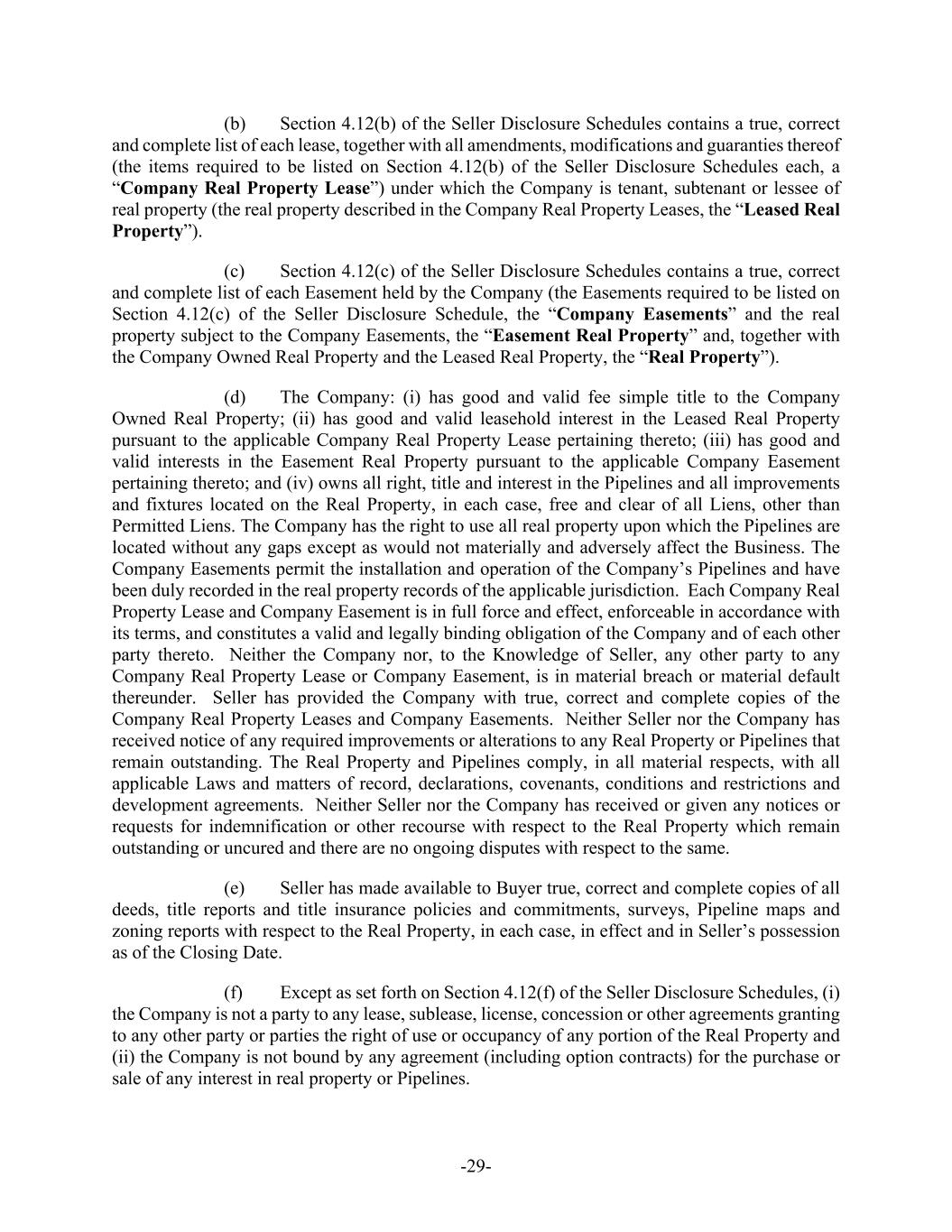 -29- (b) Section 4.12(b) of the Seller Disclosure Schedules contains a true, correct and complete list of each lease, together with all amendments, modifications and guaranties thereof (the items required to be listed on Section 4.12(b) of the Seller Disclosure Schedules each, a “Company Real Property Lease”) under which the Company is tenant, subtenant or lessee of real property (the real property described in the Company Real Property Leases, the “Leased Real Property”). (c) Section 4.12(c) of the Seller Disclosure Schedules contains a true, correct and complete list of each Easement held by the Company (the Easements required to be listed on Section 4.12(c) of the Seller Disclosure Schedule, the “Company Easements” and the real property subject to the Company Easements, the “Easement Real Property” and, together with the Company Owned Real Property and the Leased Real Property, the “Real Property”). (d) The Company: (i) has good and valid fee simple title to the Company Owned Real Property; (ii) has good and valid leasehold interest in the Leased Real Property pursuant to the applicable Company Real Property Lease pertaining thereto; (iii) has good and valid interests in the Easement Real Property pursuant to the applicable Company Easement pertaining thereto; and (iv) owns all right, title and interest in the Pipelines and all improvements and fixtures located on the Real Property, in each case, free and clear of all Liens, other than Permitted Liens. The Company has the right to use all real property upon which the Pipelines are located without any gaps except as would not materially and adversely affect the Business. The Company Easements permit the installation and operation of the Company’s Pipelines and have been duly recorded in the real property records of the applicable jurisdiction. Each Company Real Property Lease and Company Easement is in full force and effect, enforceable in accordance with its terms, and constitutes a valid and legally binding obligation of the Company and of each other party thereto. Neither the Company nor, to the Knowledge of Seller, any other party to any Company Real Property Lease or Company Easement, is in material breach or material default thereunder. Seller has provided the Company with true, correct and complete copies of the Company Real Property Leases and Company Easements. Neither Seller nor the Company has received notice of any required improvements or alterations to any Real Property or Pipelines that remain outstanding. The Real Property and Pipelines comply, in all material respects, with all applicable Laws and matters of record, declarations, covenants, conditions and restrictions and development agreements. Neither Seller nor the Company has received or given any notices or requests for indemnification or other recourse with respect to the Real Property which remain outstanding or uncured and there are no ongoing disputes with respect to the same. (e) Seller has made available to Buyer true, correct and complete copies of all deeds, title reports and title insurance policies and commitments, surveys, Pipeline maps and zoning reports with respect to the Real Property, in each case, in effect and in Seller’s possession as of the Closing Date. (f) Except as set forth on Section 4.12(f) of the Seller Disclosure Schedules, (i) the Company is not a party to any lease, sublease, license, concession or other agreements granting to any other party or parties the right of use or occupancy of any portion of the Real Property and (ii) the Company is not bound by any agreement (including option contracts) for the purchase or sale of any interest in real property or Pipelines.