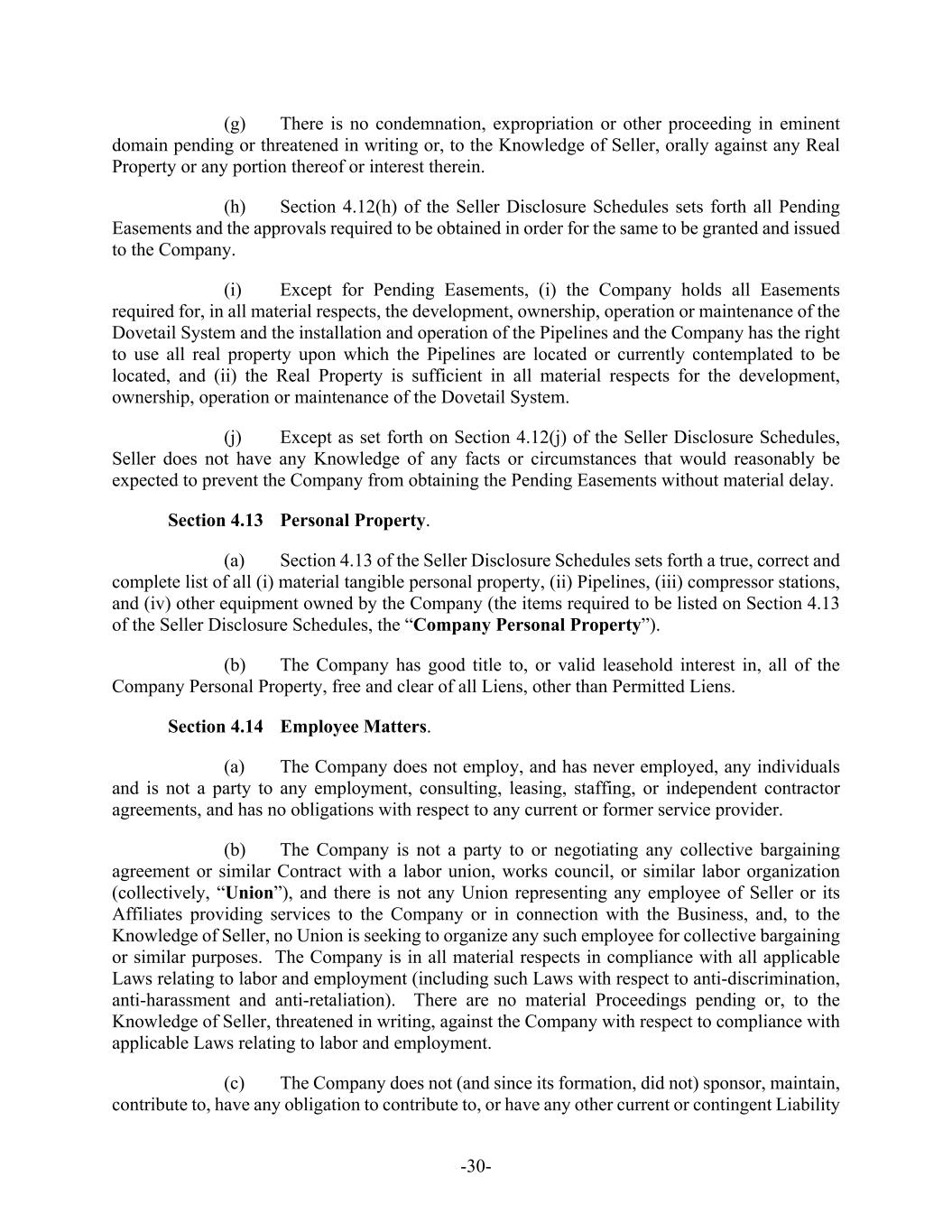 -30- (g) There is no condemnation, expropriation or other proceeding in eminent domain pending or threatened in writing or, to the Knowledge of Seller, orally against any Real Property or any portion thereof or interest therein. (h) Section 4.12(h) of the Seller Disclosure Schedules sets forth all Pending Easements and the approvals required to be obtained in order for the same to be granted and issued to the Company. (i) Except for Pending Easements, (i) the Company holds all Easements required for, in all material respects, the development, ownership, operation or maintenance of the Dovetail System and the installation and operation of the Pipelines and the Company has the right to use all real property upon which the Pipelines are located or currently contemplated to be located, and (ii) the Real Property is sufficient in all material respects for the development, ownership, operation or maintenance of the Dovetail System. (j) Except as set forth on Section 4.12(j) of the Seller Disclosure Schedules, Seller does not have any Knowledge of any facts or circumstances that would reasonably be expected to prevent the Company from obtaining the Pending Easements without material delay. Section 4.13 Personal Property. (a) Section 4.13 of the Seller Disclosure Schedules sets forth a true, correct and complete list of all (i) material tangible personal property, (ii) Pipelines, (iii) compressor stations, and (iv) other equipment owned by the Company (the items required to be listed on Section 4.13 of the Seller Disclosure Schedules, the “Company Personal Property”). (b) The Company has good title to, or valid leasehold interest in, all of the Company Personal Property, free and clear of all Liens, other than Permitted Liens. Section 4.14 Employee Matters. (a) The Company does not employ, and has never employed, any individuals and is not a party to any employment, consulting, leasing, staffing, or independent contractor agreements, and has no obligations with respect to any current or former service provider. (b) The Company is not a party to or negotiating any collective bargaining agreement or similar Contract with a labor union, works council, or similar labor organization (collectively, “Union”), and there is not any Union representing any employee of Seller or its Affiliates providing services to the Company or in connection with the Business, and, to the Knowledge of Seller, no Union is seeking to organize any such employee for collective bargaining or similar purposes. The Company is in all material respects in compliance with all applicable Laws relating to labor and employment (including such Laws with respect to anti-discrimination, anti-harassment and anti-retaliation). There are no material Proceedings pending or, to the Knowledge of Seller, threatened in writing, against the Company with respect to compliance with applicable Laws relating to labor and employment. (c) The Company does not (and since its formation, did not) sponsor, maintain, contribute to, have any obligation to contribute to, or have any other current or contingent Liability
