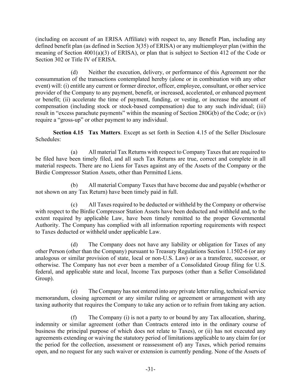 -31- (including on account of an ERISA Affiliate) with respect to, any Benefit Plan, including any defined benefit plan (as defined in Section 3(35) of ERISA) or any multiemployer plan (within the meaning of Section 4001(a)(3) of ERISA), or plan that is subject to Section 412 of the Code or Section 302 or Title IV of ERISA. (d) Neither the execution, delivery, or performance of this Agreement nor the consummation of the transactions contemplated hereby (alone or in combination with any other event) will: (i) entitle any current or former director, officer, employee, consultant, or other service provider of the Company to any payment, benefit, or increased, accelerated, or enhanced payment or benefit; (ii) accelerate the time of payment, funding, or vesting, or increase the amount of compensation (including stock or stock-based compensation) due to any such individual; (iii) result in “excess parachute payments” within the meaning of Section 280G(b) of the Code; or (iv) require a “gross-up” or other payment to any individual. Section 4.15 Tax Matters. Except as set forth in Section 4.15 of the Seller Disclosure Schedules: (a) All material Tax Returns with respect to Company Taxes that are required to be filed have been timely filed, and all such Tax Returns are true, correct and complete in all material respects. There are no Liens for Taxes against any of the Assets of the Company or the Birdie Compressor Station Assets, other than Permitted Liens. (b) All material Company Taxes that have become due and payable (whether or not shown on any Tax Return) have been timely paid in full. (c) All Taxes required to be deducted or withheld by the Company or otherwise with respect to the Birdie Compressor Station Assets have been deducted and withheld and, to the extent required by applicable Law, have been timely remitted to the proper Governmental Authority. The Company has complied with all information reporting requirements with respect to Taxes deducted or withheld under applicable Law. (d) The Company does not have any liability or obligation for Taxes of any other Person (other than the Company) pursuant to Treasury Regulations Section 1.1502-6 (or any analogous or similar provision of state, local or non-U.S. Law) or as a transferee, successor, or otherwise. The Company has not ever been a member of a Consolidated Group filing for U.S. federal, and applicable state and local, Income Tax purposes (other than a Seller Consolidated Group). (e) The Company has not entered into any private letter ruling, technical service memorandum, closing agreement or any similar ruling or agreement or arrangement with any taxing authority that requires the Company to take any action or to refrain from taking any action. (f) The Company (i) is not a party to or bound by any Tax allocation, sharing, indemnity or similar agreement (other than Contracts entered into in the ordinary course of business the principal purpose of which does not relate to Taxes), or (ii) has not executed any agreements extending or waiving the statutory period of limitations applicable to any claim for (or the period for the collection, assessment or reassessment of) any Taxes, which period remains open, and no request for any such waiver or extension is currently pending. None of the Assets of