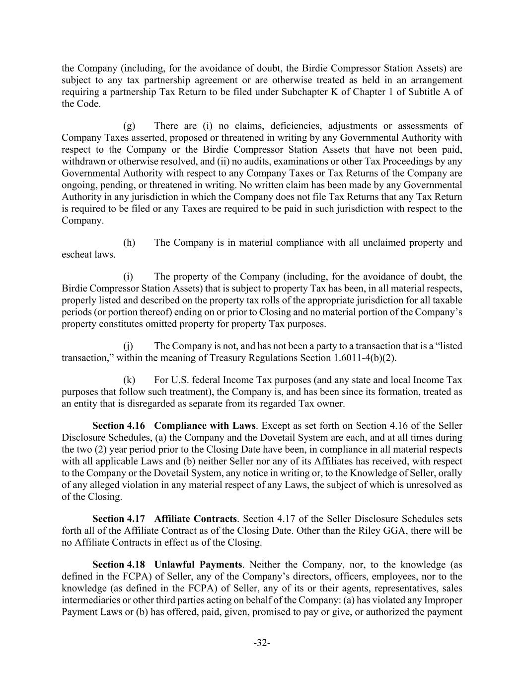-32- the Company (including, for the avoidance of doubt, the Birdie Compressor Station Assets) are subject to any tax partnership agreement or are otherwise treated as held in an arrangement requiring a partnership Tax Return to be filed under Subchapter K of Chapter 1 of Subtitle A of the Code. (g) There are (i) no claims, deficiencies, adjustments or assessments of Company Taxes asserted, proposed or threatened in writing by any Governmental Authority with respect to the Company or the Birdie Compressor Station Assets that have not been paid, withdrawn or otherwise resolved, and (ii) no audits, examinations or other Tax Proceedings by any Governmental Authority with respect to any Company Taxes or Tax Returns of the Company are ongoing, pending, or threatened in writing. No written claim has been made by any Governmental Authority in any jurisdiction in which the Company does not file Tax Returns that any Tax Return is required to be filed or any Taxes are required to be paid in such jurisdiction with respect to the Company. (h) The Company is in material compliance with all unclaimed property and escheat laws. (i) The property of the Company (including, for the avoidance of doubt, the Birdie Compressor Station Assets) that is subject to property Tax has been, in all material respects, properly listed and described on the property tax rolls of the appropriate jurisdiction for all taxable periods (or portion thereof) ending on or prior to Closing and no material portion of the Company’s property constitutes omitted property for property Tax purposes. (j) The Company is not, and has not been a party to a transaction that is a “listed transaction,” within the meaning of Treasury Regulations Section 1.6011-4(b)(2). (k) For U.S. federal Income Tax purposes (and any state and local Income Tax purposes that follow such treatment), the Company is, and has been since its formation, treated as an entity that is disregarded as separate from its regarded Tax owner. Section 4.16 Compliance with Laws. Except as set forth on Section 4.16 of the Seller Disclosure Schedules, (a) the Company and the Dovetail System are each, and at all times during the two (2) year period prior to the Closing Date have been, in compliance in all material respects with all applicable Laws and (b) neither Seller nor any of its Affiliates has received, with respect to the Company or the Dovetail System, any notice in writing or, to the Knowledge of Seller, orally of any alleged violation in any material respect of any Laws, the subject of which is unresolved as of the Closing. Section 4.17 Affiliate Contracts. Section 4.17 of the Seller Disclosure Schedules sets forth all of the Affiliate Contract as of the Closing Date. Other than the Riley GGA, there will be no Affiliate Contracts in effect as of the Closing. Section 4.18 Unlawful Payments. Neither the Company, nor, to the knowledge (as defined in the FCPA) of Seller, any of the Company’s directors, officers, employees, nor to the knowledge (as defined in the FCPA) of Seller, any of its or their agents, representatives, sales intermediaries or other third parties acting on behalf of the Company: (a) has violated any Improper Payment Laws or (b) has offered, paid, given, promised to pay or give, or authorized the payment