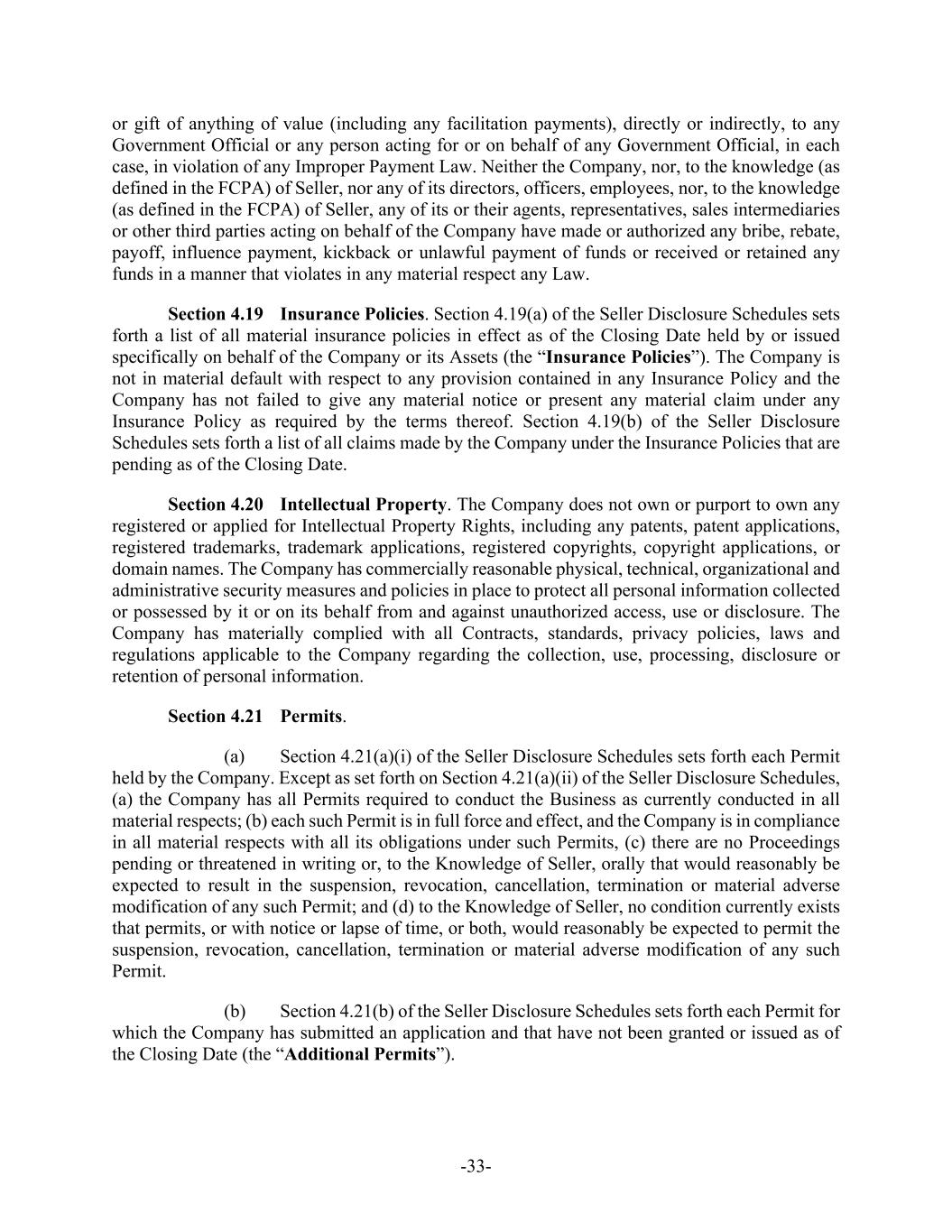 -33- or gift of anything of value (including any facilitation payments), directly or indirectly, to any Government Official or any person acting for or on behalf of any Government Official, in each case, in violation of any Improper Payment Law. Neither the Company, nor, to the knowledge (as defined in the FCPA) of Seller, nor any of its directors, officers, employees, nor, to the knowledge (as defined in the FCPA) of Seller, any of its or their agents, representatives, sales intermediaries or other third parties acting on behalf of the Company have made or authorized any bribe, rebate, payoff, influence payment, kickback or unlawful payment of funds or received or retained any funds in a manner that violates in any material respect any Law. Section 4.19 Insurance Policies. Section 4.19(a) of the Seller Disclosure Schedules sets forth a list of all material insurance policies in effect as of the Closing Date held by or issued specifically on behalf of the Company or its Assets (the “Insurance Policies”). The Company is not in material default with respect to any provision contained in any Insurance Policy and the Company has not failed to give any material notice or present any material claim under any Insurance Policy as required by the terms thereof. Section 4.19(b) of the Seller Disclosure Schedules sets forth a list of all claims made by the Company under the Insurance Policies that are pending as of the Closing Date. Section 4.20 Intellectual Property. The Company does not own or purport to own any registered or applied for Intellectual Property Rights, including any patents, patent applications, registered trademarks, trademark applications, registered copyrights, copyright applications, or domain names. The Company has commercially reasonable physical, technical, organizational and administrative security measures and policies in place to protect all personal information collected or possessed by it or on its behalf from and against unauthorized access, use or disclosure. The Company has materially complied with all Contracts, standards, privacy policies, laws and regulations applicable to the Company regarding the collection, use, processing, disclosure or retention of personal information. Section 4.21 Permits. (a) Section 4.21(a)(i) of the Seller Disclosure Schedules sets forth each Permit held by the Company. Except as set forth on Section 4.21(a)(ii) of the Seller Disclosure Schedules, (a) the Company has all Permits required to conduct the Business as currently conducted in all material respects; (b) each such Permit is in full force and effect, and the Company is in compliance in all material respects with all its obligations under such Permits, (c) there are no Proceedings pending or threatened in writing or, to the Knowledge of Seller, orally that would reasonably be expected to result in the suspension, revocation, cancellation, termination or material adverse modification of any such Permit; and (d) to the Knowledge of Seller, no condition currently exists that permits, or with notice or lapse of time, or both, would reasonably be expected to permit the suspension, revocation, cancellation, termination or material adverse modification of any such Permit. (b) Section 4.21(b) of the Seller Disclosure Schedules sets forth each Permit for which the Company has submitted an application and that have not been granted or issued as of the Closing Date (the “Additional Permits”).