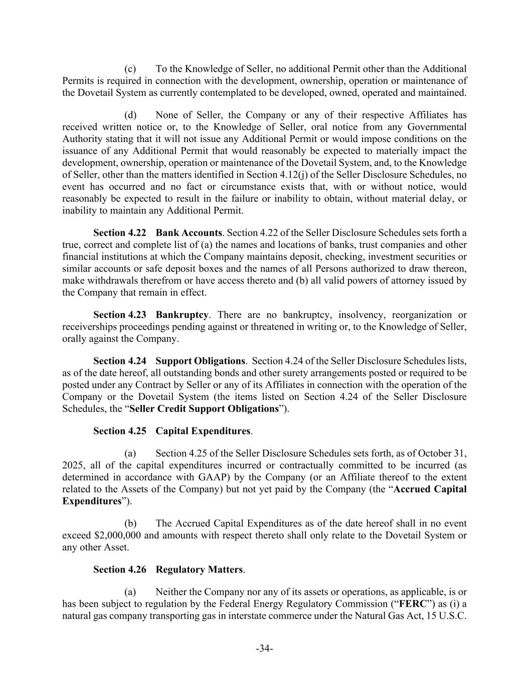 -34- (c) To the Knowledge of Seller, no additional Permit other than the Additional Permits is required in connection with the development, ownership, operation or maintenance of the Dovetail System as currently contemplated to be developed, owned, operated and maintained. (d) None of Seller, the Company or any of their respective Affiliates has received written notice or, to the Knowledge of Seller, oral notice from any Governmental Authority stating that it will not issue any Additional Permit or would impose conditions on the issuance of any Additional Permit that would reasonably be expected to materially impact the development, ownership, operation or maintenance of the Dovetail System, and, to the Knowledge of Seller, other than the matters identified in Section 4.12(j) of the Seller Disclosure Schedules, no event has occurred and no fact or circumstance exists that, with or without notice, would reasonably be expected to result in the failure or inability to obtain, without material delay, or inability to maintain any Additional Permit. Section 4.22 Bank Accounts. Section 4.22 of the Seller Disclosure Schedules sets forth a true, correct and complete list of (a) the names and locations of banks, trust companies and other financial institutions at which the Company maintains deposit, checking, investment securities or similar accounts or safe deposit boxes and the names of all Persons authorized to draw thereon, make withdrawals therefrom or have access thereto and (b) all valid powers of attorney issued by the Company that remain in effect. Section 4.23 Bankruptcy. There are no bankruptcy, insolvency, reorganization or receiverships proceedings pending against or threatened in writing or, to the Knowledge of Seller, orally against the Company. Section 4.24 Support Obligations. Section 4.24 of the Seller Disclosure Schedules lists, as of the date hereof, all outstanding bonds and other surety arrangements posted or required to be posted under any Contract by Seller or any of its Affiliates in connection with the operation of the Company or the Dovetail System (the items listed on Section 4.24 of the Seller Disclosure Schedules, the “Seller Credit Support Obligations”). Section 4.25 Capital Expenditures. (a) Section 4.25 of the Seller Disclosure Schedules sets forth, as of October 31, 2025, all of the capital expenditures incurred or contractually committed to be incurred (as determined in accordance with GAAP) by the Company (or an Affiliate thereof to the extent related to the Assets of the Company) but not yet paid by the Company (the “Accrued Capital Expenditures”). (b) The Accrued Capital Expenditures as of the date hereof shall in no event exceed $2,000,000 and amounts with respect thereto shall only relate to the Dovetail System or any other Asset. Section 4.26 Regulatory Matters. (a) Neither the Company nor any of its assets or operations, as applicable, is or has been subject to regulation by the Federal Energy Regulatory Commission (“FERC”) as (i) a natural gas company transporting gas in interstate commerce under the Natural Gas Act, 15 U.S.C.