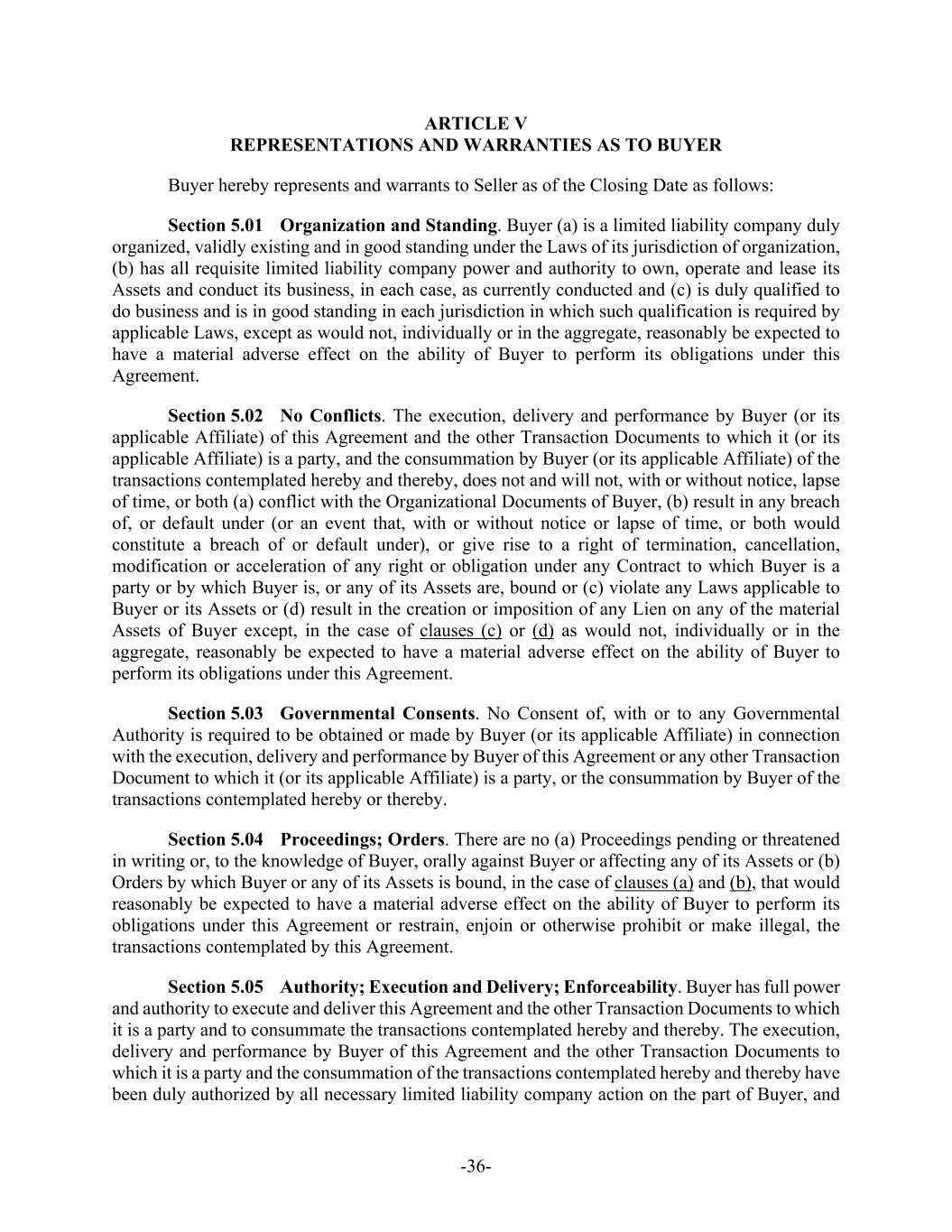 -36- ARTICLE V REPRESENTATIONS AND WARRANTIES AS TO BUYER Buyer hereby represents and warrants to Seller as of the Closing Date as follows: Section 5.01 Organization and Standing. Buyer (a) is a limited liability company duly organized, validly existing and in good standing under the Laws of its jurisdiction of organization, (b) has all requisite limited liability company power and authority to own, operate and lease its Assets and conduct its business, in each case, as currently conducted and (c) is duly qualified to do business and is in good standing in each jurisdiction in which such qualification is required by applicable Laws, except as would not, individually or in the aggregate, reasonably be expected to have a material adverse effect on the ability of Buyer to perform its obligations under this Agreement. Section 5.02 No Conflicts. The execution, delivery and performance by Buyer (or its applicable Affiliate) of this Agreement and the other Transaction Documents to which it (or its applicable Affiliate) is a party, and the consummation by Buyer (or its applicable Affiliate) of the transactions contemplated hereby and thereby, does not and will not, with or without notice, lapse of time, or both (a) conflict with the Organizational Documents of Buyer, (b) result in any breach of, or default under (or an event that, with or without notice or lapse of time, or both would constitute a breach of or default under), or give rise to a right of termination, cancellation, modification or acceleration of any right or obligation under any Contract to which Buyer is a party or by which Buyer is, or any of its Assets are, bound or (c) violate any Laws applicable to Buyer or its Assets or (d) result in the creation or imposition of any Lien on any of the material Assets of Buyer except, in the case of clauses (c) or (d) as would not, individually or in the aggregate, reasonably be expected to have a material adverse effect on the ability of Buyer to perform its obligations under this Agreement. Section 5.03 Governmental Consents. No Consent of, with or to any Governmental Authority is required to be obtained or made by Buyer (or its applicable Affiliate) in connection with the execution, delivery and performance by Buyer of this Agreement or any other Transaction Document to which it (or its applicable Affiliate) is a party, or the consummation by Buyer of the transactions contemplated hereby or thereby. Section 5.04 Proceedings; Orders. There are no (a) Proceedings pending or threatened in writing or, to the knowledge of Buyer, orally against Buyer or affecting any of its Assets or (b) Orders by which Buyer or any of its Assets is bound, in the case of clauses (a) and (b), that would reasonably be expected to have a material adverse effect on the ability of Buyer to perform its obligations under this Agreement or restrain, enjoin or otherwise prohibit or make illegal, the transactions contemplated by this Agreement. Section 5.05 Authority; Execution and Delivery; Enforceability. Buyer has full power and authority to execute and deliver this Agreement and the other Transaction Documents to which it is a party and to consummate the transactions contemplated hereby and thereby. The execution, delivery and performance by Buyer of this Agreement and the other Transaction Documents to which it is a party and the consummation of the transactions contemplated hereby and thereby have been duly authorized by all necessary limited liability company action on the part of Buyer, and