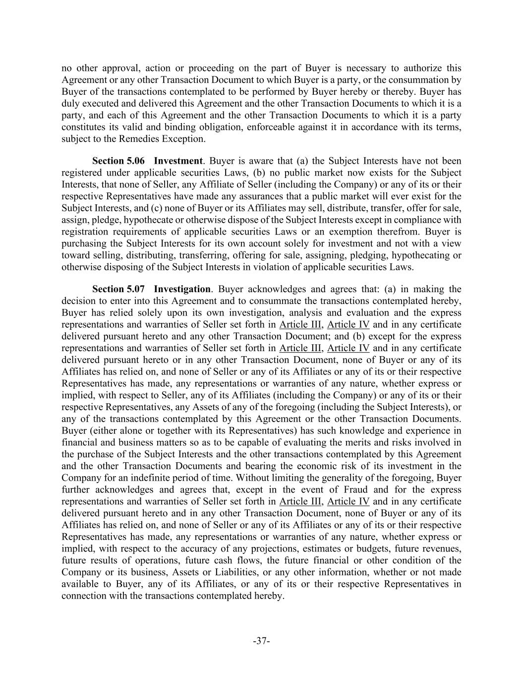 -37- no other approval, action or proceeding on the part of Buyer is necessary to authorize this Agreement or any other Transaction Document to which Buyer is a party, or the consummation by Buyer of the transactions contemplated to be performed by Buyer hereby or thereby. Buyer has duly executed and delivered this Agreement and the other Transaction Documents to which it is a party, and each of this Agreement and the other Transaction Documents to which it is a party constitutes its valid and binding obligation, enforceable against it in accordance with its terms, subject to the Remedies Exception. Section 5.06 Investment. Buyer is aware that (a) the Subject Interests have not been registered under applicable securities Laws, (b) no public market now exists for the Subject Interests, that none of Seller, any Affiliate of Seller (including the Company) or any of its or their respective Representatives have made any assurances that a public market will ever exist for the Subject Interests, and (c) none of Buyer or its Affiliates may sell, distribute, transfer, offer for sale, assign, pledge, hypothecate or otherwise dispose of the Subject Interests except in compliance with registration requirements of applicable securities Laws or an exemption therefrom. Buyer is purchasing the Subject Interests for its own account solely for investment and not with a view toward selling, distributing, transferring, offering for sale, assigning, pledging, hypothecating or otherwise disposing of the Subject Interests in violation of applicable securities Laws. Section 5.07 Investigation. Buyer acknowledges and agrees that: (a) in making the decision to enter into this Agreement and to consummate the transactions contemplated hereby, Buyer has relied solely upon its own investigation, analysis and evaluation and the express representations and warranties of Seller set forth in Article III, Article IV and in any certificate delivered pursuant hereto and any other Transaction Document; and (b) except for the express representations and warranties of Seller set forth in Article III, Article IV and in any certificate delivered pursuant hereto or in any other Transaction Document, none of Buyer or any of its Affiliates has relied on, and none of Seller or any of its Affiliates or any of its or their respective Representatives has made, any representations or warranties of any nature, whether express or implied, with respect to Seller, any of its Affiliates (including the Company) or any of its or their respective Representatives, any Assets of any of the foregoing (including the Subject Interests), or any of the transactions contemplated by this Agreement or the other Transaction Documents. Buyer (either alone or together with its Representatives) has such knowledge and experience in financial and business matters so as to be capable of evaluating the merits and risks involved in the purchase of the Subject Interests and the other transactions contemplated by this Agreement and the other Transaction Documents and bearing the economic risk of its investment in the Company for an indefinite period of time. Without limiting the generality of the foregoing, Buyer further acknowledges and agrees that, except in the event of Fraud and for the express representations and warranties of Seller set forth in Article III, Article IV and in any certificate delivered pursuant hereto and in any other Transaction Document, none of Buyer or any of its Affiliates has relied on, and none of Seller or any of its Affiliates or any of its or their respective Representatives has made, any representations or warranties of any nature, whether express or implied, with respect to the accuracy of any projections, estimates or budgets, future revenues, future results of operations, future cash flows, the future financial or other condition of the Company or its business, Assets or Liabilities, or any other information, whether or not made available to Buyer, any of its Affiliates, or any of its or their respective Representatives in connection with the transactions contemplated hereby.
