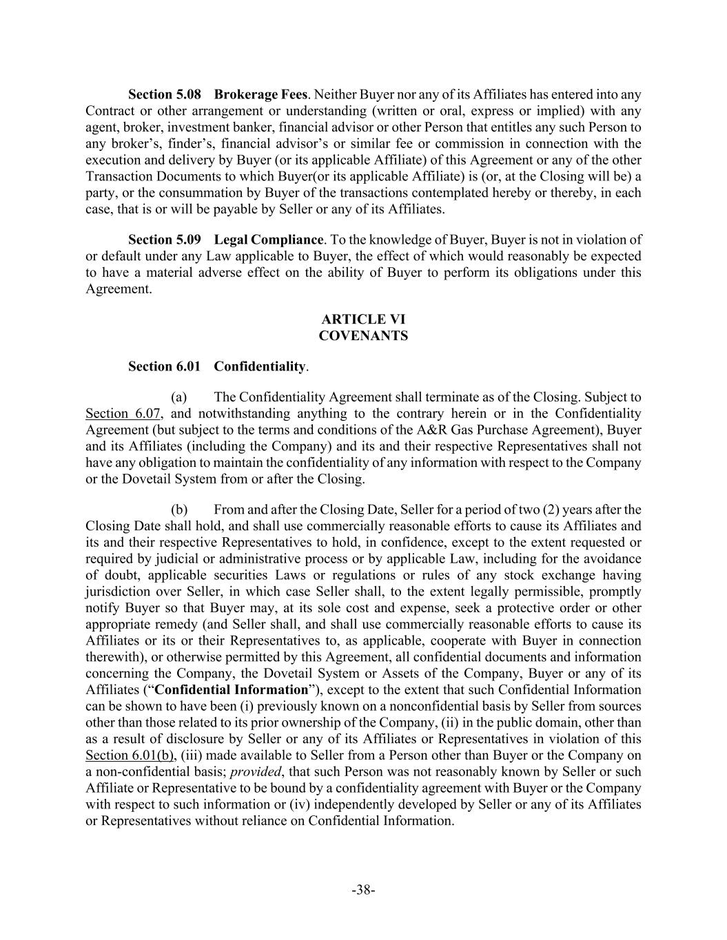 -38- Section 5.08 Brokerage Fees. Neither Buyer nor any of its Affiliates has entered into any Contract or other arrangement or understanding (written or oral, express or implied) with any agent, broker, investment banker, financial advisor or other Person that entitles any such Person to any broker’s, finder’s, financial advisor’s or similar fee or commission in connection with the execution and delivery by Buyer (or its applicable Affiliate) of this Agreement or any of the other Transaction Documents to which Buyer(or its applicable Affiliate) is (or, at the Closing will be) a party, or the consummation by Buyer of the transactions contemplated hereby or thereby, in each case, that is or will be payable by Seller or any of its Affiliates. Section 5.09 Legal Compliance. To the knowledge of Buyer, Buyer is not in violation of or default under any Law applicable to Buyer, the effect of which would reasonably be expected to have a material adverse effect on the ability of Buyer to perform its obligations under this Agreement. ARTICLE VI COVENANTS Section 6.01 Confidentiality. (a) The Confidentiality Agreement shall terminate as of the Closing. Subject to Section 6.07, and notwithstanding anything to the contrary herein or in the Confidentiality Agreement (but subject to the terms and conditions of the A&R Gas Purchase Agreement), Buyer and its Affiliates (including the Company) and its and their respective Representatives shall not have any obligation to maintain the confidentiality of any information with respect to the Company or the Dovetail System from or after the Closing. (b) From and after the Closing Date, Seller for a period of two (2) years after the Closing Date shall hold, and shall use commercially reasonable efforts to cause its Affiliates and its and their respective Representatives to hold, in confidence, except to the extent requested or required by judicial or administrative process or by applicable Law, including for the avoidance of doubt, applicable securities Laws or regulations or rules of any stock exchange having jurisdiction over Seller, in which case Seller shall, to the extent legally permissible, promptly notify Buyer so that Buyer may, at its sole cost and expense, seek a protective order or other appropriate remedy (and Seller shall, and shall use commercially reasonable efforts to cause its Affiliates or its or their Representatives to, as applicable, cooperate with Buyer in connection therewith), or otherwise permitted by this Agreement, all confidential documents and information concerning the Company, the Dovetail System or Assets of the Company, Buyer or any of its Affiliates (“Confidential Information”), except to the extent that such Confidential Information can be shown to have been (i) previously known on a nonconfidential basis by Seller from sources other than those related to its prior ownership of the Company, (ii) in the public domain, other than as a result of disclosure by Seller or any of its Affiliates or Representatives in violation of this Section 6.01(b), (iii) made available to Seller from a Person other than Buyer or the Company on a non-confidential basis; provided, that such Person was not reasonably known by Seller or such Affiliate or Representative to be bound by a confidentiality agreement with Buyer or the Company with respect to such information or (iv) independently developed by Seller or any of its Affiliates or Representatives without reliance on Confidential Information.