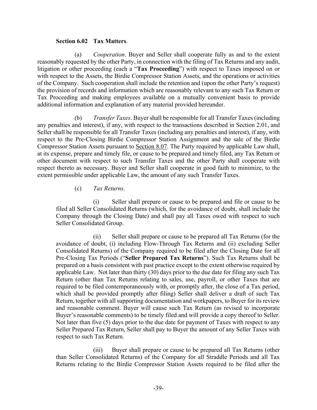 -39- Section 6.02 Tax Matters. (a) Cooperation. Buyer and Seller shall cooperate fully as and to the extent reasonably requested by the other Party, in connection with the filing of Tax Returns and any audit, litigation or other proceeding (each a “Tax Proceeding”) with respect to Taxes imposed on or with respect to the Assets, the Birdie Compressor Station Assets, and the operations or activities of the Company. Such cooperation shall include the retention and (upon the other Party’s request) the provision of records and information which are reasonably relevant to any such Tax Return or Tax Proceeding and making employees available on a mutually convenient basis to provide additional information and explanation of any material provided hereunder. (b) Transfer Taxes. Buyer shall be responsible for all Transfer Taxes (including any penalties and interest), if any, with respect to the transactions described in Section 2.01, and Seller shall be responsible for all Transfer Taxes (including any penalties and interest), if any, with respect to the Pre-Closing Birdie Compressor Station Assignment and the sale of the Birdie Compressor Station Assets pursuant to Section 8.07. The Party required by applicable Law shall, at its expense, prepare and timely file, or cause to be prepared and timely filed, any Tax Return or other document with respect to such Transfer Taxes and the other Party shall cooperate with respect thereto as necessary. Buyer and Seller shall cooperate in good faith to minimize, to the extent permissible under applicable Law, the amount of any such Transfer Taxes. (c) Tax Returns. (i) Seller shall prepare or cause to be prepared and file or cause to be filed all Seller Consolidated Returns (which, for the avoidance of doubt, shall include the Company through the Closing Date) and shall pay all Taxes owed with respect to such Seller Consolidated Group. (ii) Seller shall prepare or cause to be prepared all Tax Returns (for the avoidance of doubt, (i) including Flow-Through Tax Returns and (ii) excluding Seller Consolidated Returns) of the Company required to be filed after the Closing Date for all Pre-Closing Tax Periods (“Seller Prepared Tax Returns”). Such Tax Returns shall be prepared on a basis consistent with past practice except to the extent otherwise required by applicable Law. Not later than thirty (30) days prior to the due date for filing any such Tax Return (other than Tax Returns relating to sales, use, payroll, or other Taxes that are required to be filed contemporaneously with, or promptly after, the close of a Tax period, which shall be provided promptly after filing) Seller shall deliver a draft of such Tax Return, together with all supporting documentation and workpapers, to Buyer for its review and reasonable comment. Buyer will cause such Tax Return (as revised to incorporate Buyer’s reasonable comments) to be timely filed and will provide a copy thereof to Seller. Not later than five (5) days prior to the due date for payment of Taxes with respect to any Seller Prepared Tax Return, Seller shall pay to Buyer the amount of any Seller Taxes with respect to such Tax Return. (iii) Buyer shall prepare or cause to be prepared all Tax Returns (other than Seller Consolidated Returns) of the Company for all Straddle Periods and all Tax Returns relating to the Birdie Compressor Station Assets required to be filed after the