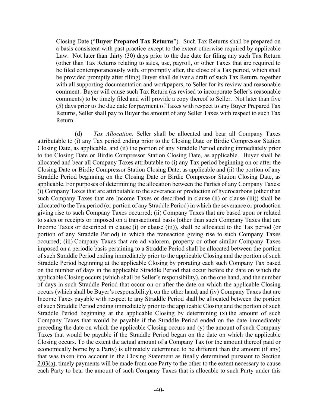 -40- Closing Date (“Buyer Prepared Tax Returns”). Such Tax Returns shall be prepared on a basis consistent with past practice except to the extent otherwise required by applicable Law. Not later than thirty (30) days prior to the due date for filing any such Tax Return (other than Tax Returns relating to sales, use, payroll, or other Taxes that are required to be filed contemporaneously with, or promptly after, the close of a Tax period, which shall be provided promptly after filing) Buyer shall deliver a draft of such Tax Return, together with all supporting documentation and workpapers, to Seller for its review and reasonable comment. Buyer will cause such Tax Return (as revised to incorporate Seller’s reasonable comments) to be timely filed and will provide a copy thereof to Seller. Not later than five (5) days prior to the due date for payment of Taxes with respect to any Buyer Prepared Tax Returns, Seller shall pay to Buyer the amount of any Seller Taxes with respect to such Tax Return. (d) Tax Allocation. Seller shall be allocated and bear all Company Taxes attributable to (i) any Tax period ending prior to the Closing Date or Birdie Compressor Station Closing Date, as applicable, and (ii) the portion of any Straddle Period ending immediately prior to the Closing Date or Birdie Compressor Station Closing Date, as applicable. Buyer shall be allocated and bear all Company Taxes attributable to (i) any Tax period beginning on or after the Closing Date or Birdie Compressor Station Closing Date, as applicable and (ii) the portion of any Straddle Period beginning on the Closing Date or Birdie Compressor Station Closing Date, as applicable. For purposes of determining the allocation between the Parties of any Company Taxes: (i) Company Taxes that are attributable to the severance or production of hydrocarbons (other than such Company Taxes that are Income Taxes or described in clause (ii) or clause (iii)) shall be allocated to the Tax period (or portion of any Straddle Period) in which the severance or production giving rise to such Company Taxes occurred; (ii) Company Taxes that are based upon or related to sales or receipts or imposed on a transactional basis (other than such Company Taxes that are Income Taxes or described in clause (i) or clause (iii)), shall be allocated to the Tax period (or portion of any Straddle Period) in which the transaction giving rise to such Company Taxes occurred; (iii) Company Taxes that are ad valorem, property or other similar Company Taxes imposed on a periodic basis pertaining to a Straddle Period shall be allocated between the portion of such Straddle Period ending immediately prior to the applicable Closing and the portion of such Straddle Period beginning at the applicable Closing by prorating each such Company Tax based on the number of days in the applicable Straddle Period that occur before the date on which the applicable Closing occurs (which shall be Seller’s responsibility), on the one hand, and the number of days in such Straddle Period that occur on or after the date on which the applicable Closing occurs (which shall be Buyer’s responsibility), on the other hand; and (iv) Company Taxes that are Income Taxes payable with respect to any Straddle Period shall be allocated between the portion of such Straddle Period ending immediately prior to the applicable Closing and the portion of such Straddle Period beginning at the applicable Closing by determining (x) the amount of such Company Taxes that would be payable if the Straddle Period ended on the date immediately preceding the date on which the applicable Closing occurs and (y) the amount of such Company Taxes that would be payable if the Straddle Period began on the date on which the applicable Closing occurs. To the extent the actual amount of a Company Tax (or the amount thereof paid or economically borne by a Party) is ultimately determined to be different than the amount (if any) that was taken into account in the Closing Statement as finally determined pursuant to Section 2.03(a), timely payments will be made from one Party to the other to the extent necessary to cause each Party to bear the amount of such Company Taxes that is allocable to such Party under this