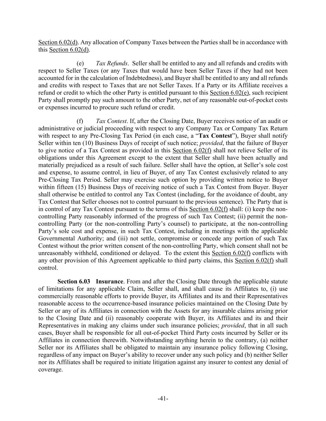 -41- Section 6.02(d). Any allocation of Company Taxes between the Parties shall be in accordance with this Section 6.02(d). (e) Tax Refunds. Seller shall be entitled to any and all refunds and credits with respect to Seller Taxes (or any Taxes that would have been Seller Taxes if they had not been accounted for in the calculation of Indebtedness), and Buyer shall be entitled to any and all refunds and credits with respect to Taxes that are not Seller Taxes. If a Party or its Affiliate receives a refund or credit to which the other Party is entitled pursuant to this Section 6.02(e), such recipient Party shall promptly pay such amount to the other Party, net of any reasonable out-of-pocket costs or expenses incurred to procure such refund or credit. (f) Tax Contest. If, after the Closing Date, Buyer receives notice of an audit or administrative or judicial proceeding with respect to any Company Tax or Company Tax Return with respect to any Pre-Closing Tax Period (in each case, a “Tax Contest”), Buyer shall notify Seller within ten (10) Business Days of receipt of such notice; provided, that the failure of Buyer to give notice of a Tax Contest as provided in this Section 6.02(f) shall not relieve Seller of its obligations under this Agreement except to the extent that Seller shall have been actually and materially prejudiced as a result of such failure. Seller shall have the option, at Seller’s sole cost and expense, to assume control, in lieu of Buyer, of any Tax Contest exclusively related to any Pre-Closing Tax Period. Seller may exercise such option by providing written notice to Buyer within fifteen (15) Business Days of receiving notice of such a Tax Contest from Buyer. Buyer shall otherwise be entitled to control any Tax Contest (including, for the avoidance of doubt, any Tax Contest that Seller chooses not to control pursuant to the previous sentence). The Party that is in control of any Tax Contest pursuant to the terms of this Section 6.02(f) shall: (i) keep the non- controlling Party reasonably informed of the progress of such Tax Contest; (ii) permit the non- controlling Party (or the non-controlling Party’s counsel) to participate, at the non-controlling Party’s sole cost and expense, in such Tax Contest, including in meetings with the applicable Governmental Authority; and (iii) not settle, compromise or concede any portion of such Tax Contest without the prior written consent of the non-controlling Party, which consent shall not be unreasonably withheld, conditioned or delayed. To the extent this Section 6.02(f) conflicts with any other provision of this Agreement applicable to third party claims, this Section 6.02(f) shall control. Section 6.03 Insurance. From and after the Closing Date through the applicable statute of limitations for any applicable Claim, Seller shall, and shall cause its Affiliates to, (i) use commercially reasonable efforts to provide Buyer, its Affiliates and its and their Representatives reasonable access to the occurrence-based insurance policies maintained on the Closing Date by Seller or any of its Affiliates in connection with the Assets for any insurable claims arising prior to the Closing Date and (ii) reasonably cooperate with Buyer, its Affiliates and its and their Representatives in making any claims under such insurance policies; provided, that in all such cases, Buyer shall be responsible for all out-of-pocket Third Party costs incurred by Seller or its Affiliates in connection therewith. Notwithstanding anything herein to the contrary, (a) neither Seller nor its Affiliates shall be obligated to maintain any insurance policy following Closing, regardless of any impact on Buyer’s ability to recover under any such policy and (b) neither Seller nor its Affiliates shall be required to initiate litigation against any insurer to contest any denial of coverage.