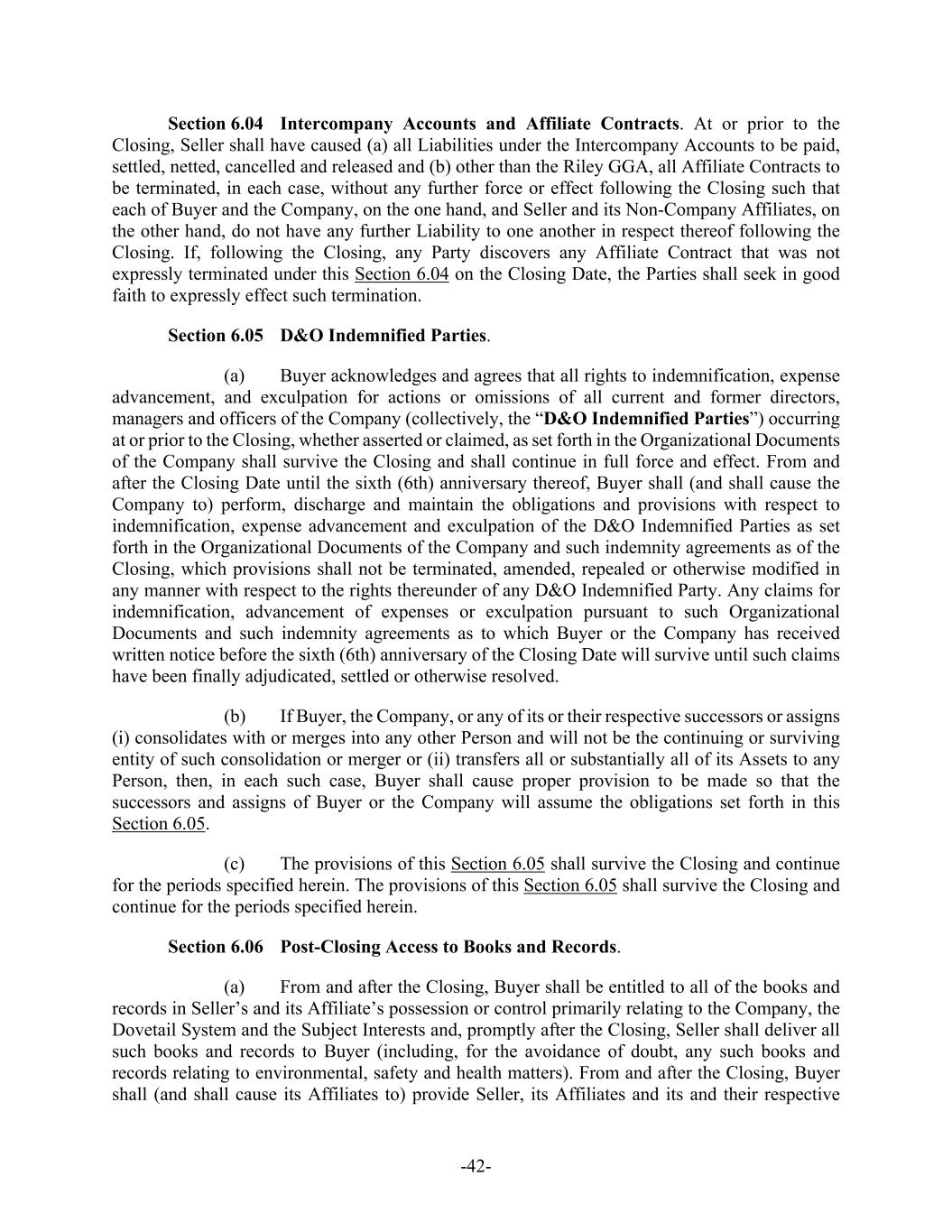 -42- Section 6.04 Intercompany Accounts and Affiliate Contracts. At or prior to the Closing, Seller shall have caused (a) all Liabilities under the Intercompany Accounts to be paid, settled, netted, cancelled and released and (b) other than the Riley GGA, all Affiliate Contracts to be terminated, in each case, without any further force or effect following the Closing such that each of Buyer and the Company, on the one hand, and Seller and its Non-Company Affiliates, on the other hand, do not have any further Liability to one another in respect thereof following the Closing. If, following the Closing, any Party discovers any Affiliate Contract that was not expressly terminated under this Section 6.04 on the Closing Date, the Parties shall seek in good faith to expressly effect such termination. Section 6.05 D&O Indemnified Parties. (a) Buyer acknowledges and agrees that all rights to indemnification, expense advancement, and exculpation for actions or omissions of all current and former directors, managers and officers of the Company (collectively, the “D&O Indemnified Parties”) occurring at or prior to the Closing, whether asserted or claimed, as set forth in the Organizational Documents of the Company shall survive the Closing and shall continue in full force and effect. From and after the Closing Date until the sixth (6th) anniversary thereof, Buyer shall (and shall cause the Company to) perform, discharge and maintain the obligations and provisions with respect to indemnification, expense advancement and exculpation of the D&O Indemnified Parties as set forth in the Organizational Documents of the Company and such indemnity agreements as of the Closing, which provisions shall not be terminated, amended, repealed or otherwise modified in any manner with respect to the rights thereunder of any D&O Indemnified Party. Any claims for indemnification, advancement of expenses or exculpation pursuant to such Organizational Documents and such indemnity agreements as to which Buyer or the Company has received written notice before the sixth (6th) anniversary of the Closing Date will survive until such claims have been finally adjudicated, settled or otherwise resolved. (b) If Buyer, the Company, or any of its or their respective successors or assigns (i) consolidates with or merges into any other Person and will not be the continuing or surviving entity of such consolidation or merger or (ii) transfers all or substantially all of its Assets to any Person, then, in each such case, Buyer shall cause proper provision to be made so that the successors and assigns of Buyer or the Company will assume the obligations set forth in this Section 6.05. (c) The provisions of this Section 6.05 shall survive the Closing and continue for the periods specified herein. The provisions of this Section 6.05 shall survive the Closing and continue for the periods specified herein. Section 6.06 Post-Closing Access to Books and Records. (a) From and after the Closing, Buyer shall be entitled to all of the books and records in Seller’s and its Affiliate’s possession or control primarily relating to the Company, the Dovetail System and the Subject Interests and, promptly after the Closing, Seller shall deliver all such books and records to Buyer (including, for the avoidance of doubt, any such books and records relating to environmental, safety and health matters). From and after the Closing, Buyer shall (and shall cause its Affiliates to) provide Seller, its Affiliates and its and their respective