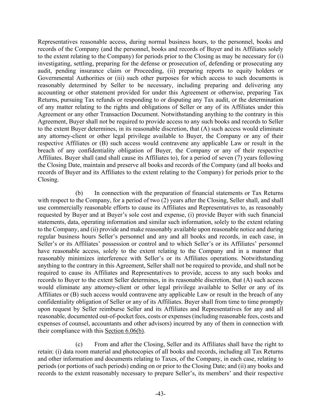 -43- Representatives reasonable access, during normal business hours, to the personnel, books and records of the Company (and the personnel, books and records of Buyer and its Affiliates solely to the extent relating to the Company) for periods prior to the Closing as may be necessary for (i) investigating, settling, preparing for the defense or prosecution of, defending or prosecuting any audit, pending insurance claim or Proceeding, (ii) preparing reports to equity holders or Governmental Authorities or (iii) such other purposes for which access to such documents is reasonably determined by Seller to be necessary, including preparing and delivering any accounting or other statement provided for under this Agreement or otherwise, preparing Tax Returns, pursuing Tax refunds or responding to or disputing any Tax audit, or the determination of any matter relating to the rights and obligations of Seller or any of its Affiliates under this Agreement or any other Transaction Document. Notwithstanding anything to the contrary in this Agreement, Buyer shall not be required to provide access to any such books and records to Seller to the extent Buyer determines, in its reasonable discretion, that (A) such access would eliminate any attorney-client or other legal privilege available to Buyer, the Company or any of their respective Affiliates or (B) such access would contravene any applicable Law or result in the breach of any confidentiality obligation of Buyer, the Company or any of their respective Affiliates. Buyer shall (and shall cause its Affiliates to), for a period of seven (7) years following the Closing Date, maintain and preserve all books and records of the Company (and all books and records of Buyer and its Affiliates to the extent relating to the Company) for periods prior to the Closing. (b) In connection with the preparation of financial statements or Tax Returns with respect to the Company, for a period of two (2) years after the Closing, Seller shall, and shall use commercially reasonable efforts to cause its Affiliates and Representatives to, as reasonably requested by Buyer and at Buyer’s sole cost and expense, (i) provide Buyer with such financial statements, data, operating information and similar such information, solely to the extent relating to the Company, and (ii) provide and make reasonably available upon reasonable notice and during regular business hours Seller’s personnel and any and all books and records, in each case, in Seller’s or its Affiliates’ possession or control and to which Seller’s or its Affiliates’ personnel have reasonable access, solely to the extent relating to the Company and in a manner that reasonably minimizes interference with Seller’s or its Affiliates operations. Notwithstanding anything to the contrary in this Agreement, Seller shall not be required to provide, and shall not be required to cause its Affiliates and Representatives to provide, access to any such books and records to Buyer to the extent Seller determines, in its reasonable discretion, that (A) such access would eliminate any attorney-client or other legal privilege available to Seller or any of its Affiliates or (B) such access would contravene any applicable Law or result in the breach of any confidentiality obligation of Seller or any of its Affiliates. Buyer shall from time to time promptly upon request by Seller reimburse Seller and its Affiliates and Representatives for any and all reasonable, documented out-of-pocket fees, costs or expenses (including reasonable fees, costs and expenses of counsel, accountants and other advisors) incurred by any of them in connection with their compliance with this Section 6.06(b). (c) From and after the Closing, Seller and its Affiliates shall have the right to retain: (i) data room material and photocopies of all books and records, including all Tax Returns and other information and documents relating to Taxes, of the Company, in each case, relating to periods (or portions of such periods) ending on or prior to the Closing Date; and (ii) any books and records to the extent reasonably necessary to prepare Seller’s, its members’ and their respective