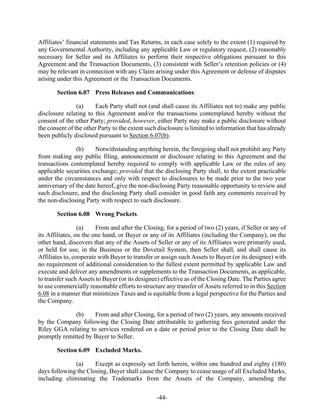 -44- Affiliates’ financial statements and Tax Returns, in each case solely to the extent (1) required by any Governmental Authority, including any applicable Law or regulatory request, (2) reasonably necessary for Seller and its Affiliates to perform their respective obligations pursuant to this Agreement and the Transaction Documents, (3) consistent with Seller’s retention policies or (4) may be relevant in connection with any Claim arising under this Agreement or defense of disputes arising under this Agreement or the Transaction Documents. Section 6.07 Press Releases and Communications. (a) Each Party shall not (and shall cause its Affiliates not to) make any public disclosure relating to this Agreement and/or the transactions contemplated hereby without the consent of the other Party; provided, however, either Party may make a public disclosure without the consent of the other Party to the extent such disclosure is limited to information that has already been publicly disclosed pursuant to Section 6.07(b). (b) Notwithstanding anything herein, the foregoing shall not prohibit any Party from making any public filing, announcement or disclosure relating to this Agreement and the transactions contemplated hereby required to comply with applicable Law or the rules of any applicable securities exchange; provided that the disclosing Party shall, to the extent practicable under the circumstances and only with respect to disclosures to be made prior to the two year anniversary of the date hereof, give the non-disclosing Party reasonable opportunity to review and such disclosure, and the disclosing Party shall consider in good faith any comments received by the non-disclosing Party with respect to such disclosure. Section 6.08 Wrong Pockets. (a) From and after the Closing, for a period of two (2) years, if Seller or any of its Affiliates, on the one hand, or Buyer or any of its Affiliates (including the Company), on the other hand, discovers that any of the Assets of Seller or any of its Affiliates were primarily used, or held for use, in the Business or the Dovetail System, then Seller shall, and shall cause its Affiliates to, cooperate with Buyer to transfer or assign such Assets to Buyer (or its designee) with no requirement of additional consideration to the fullest extent permitted by applicable Law and execute and deliver any amendments or supplements to the Transaction Documents, as applicable, to transfer such Assets to Buyer (or its designee) effective as of the Closing Date. The Parties agree to use commercially reasonable efforts to structure any transfer of Assets referred to in this Section 6.08 in a manner that minimizes Taxes and is equitable from a legal perspective for the Parties and the Company. (b) From and after Closing, for a period of two (2) years, any amounts received by the Company following the Closing Date attributable to gathering fees generated under the Riley GGA relating to services rendered on a date or period prior to the Closing Date shall be promptly remitted by Buyer to Seller. Section 6.09 Excluded Marks. (a) Except as expressly set forth herein, within one hundred and eighty (180) days following the Closing, Buyer shall cause the Company to cease usage of all Excluded Marks, including eliminating the Trademarks from the Assets of the Company, amending the