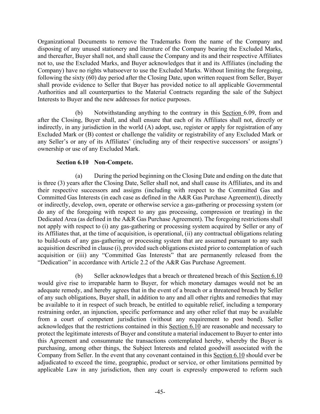 -45- Organizational Documents to remove the Trademarks from the name of the Company and disposing of any unused stationery and literature of the Company bearing the Excluded Marks, and thereafter, Buyer shall not, and shall cause the Company and its and their respective Affiliates not to, use the Excluded Marks, and Buyer acknowledges that it and its Affiliates (including the Company) have no rights whatsoever to use the Excluded Marks. Without limiting the foregoing, following the sixty (60) day period after the Closing Date, upon written request from Seller, Buyer shall provide evidence to Seller that Buyer has provided notice to all applicable Governmental Authorities and all counterparties to the Material Contracts regarding the sale of the Subject Interests to Buyer and the new addresses for notice purposes. (b) Notwithstanding anything to the contrary in this Section 6.09, from and after the Closing, Buyer shall, and shall ensure that each of its Affiliates shall not, directly or indirectly, in any jurisdiction in the world (A) adopt, use, register or apply for registration of any Excluded Mark or (B) contest or challenge the validity or registrability of any Excluded Mark or any Seller’s or any of its Affiliates’ (including any of their respective successors’ or assigns’) ownership or use of any Excluded Mark. Section 6.10 Non-Compete. (a) During the period beginning on the Closing Date and ending on the date that is three (3) years after the Closing Date, Seller shall not, and shall cause its Affiliates, and its and their respective successors and assigns (including with respect to the Committed Gas and Committed Gas Interests (in each case as defined in the A&R Gas Purchase Agreement)), directly or indirectly, develop, own, operate or otherwise service a gas-gathering or processing system (or do any of the foregoing with respect to any gas processing, compression or treating) in the Dedicated Area (as defined in the A&R Gas Purchase Agreement). The foregoing restrictions shall not apply with respect to (i) any gas-gathering or processing system acquired by Seller or any of its Affiliates that, at the time of acquisition, is operational, (ii) any contractual obligations relating to build-outs of any gas-gathering or processing system that are assumed pursuant to any such acquisition described in clause (i), provided such obligations existed prior to contemplation of such acquisition or (iii) any “Committed Gas Interests” that are permanently released from the “Dedication” in accordance with Article 2.2 of the A&R Gas Purchase Agreement. (b) Seller acknowledges that a breach or threatened breach of this Section 6.10 would give rise to irreparable harm to Buyer, for which monetary damages would not be an adequate remedy, and hereby agrees that in the event of a breach or a threatened breach by Seller of any such obligations, Buyer shall, in addition to any and all other rights and remedies that may be available to it in respect of such breach, be entitled to equitable relief, including a temporary restraining order, an injunction, specific performance and any other relief that may be available from a court of competent jurisdiction (without any requirement to post bond). Seller acknowledges that the restrictions contained in this Section 6.10 are reasonable and necessary to protect the legitimate interests of Buyer and constitute a material inducement to Buyer to enter into this Agreement and consummate the transactions contemplated hereby, whereby the Buyer is purchasing, among other things, the Subject Interests and related goodwill associated with the Company from Seller. In the event that any covenant contained in this Section 6.10 should ever be adjudicated to exceed the time, geographic, product or service, or other limitations permitted by applicable Law in any jurisdiction, then any court is expressly empowered to reform such