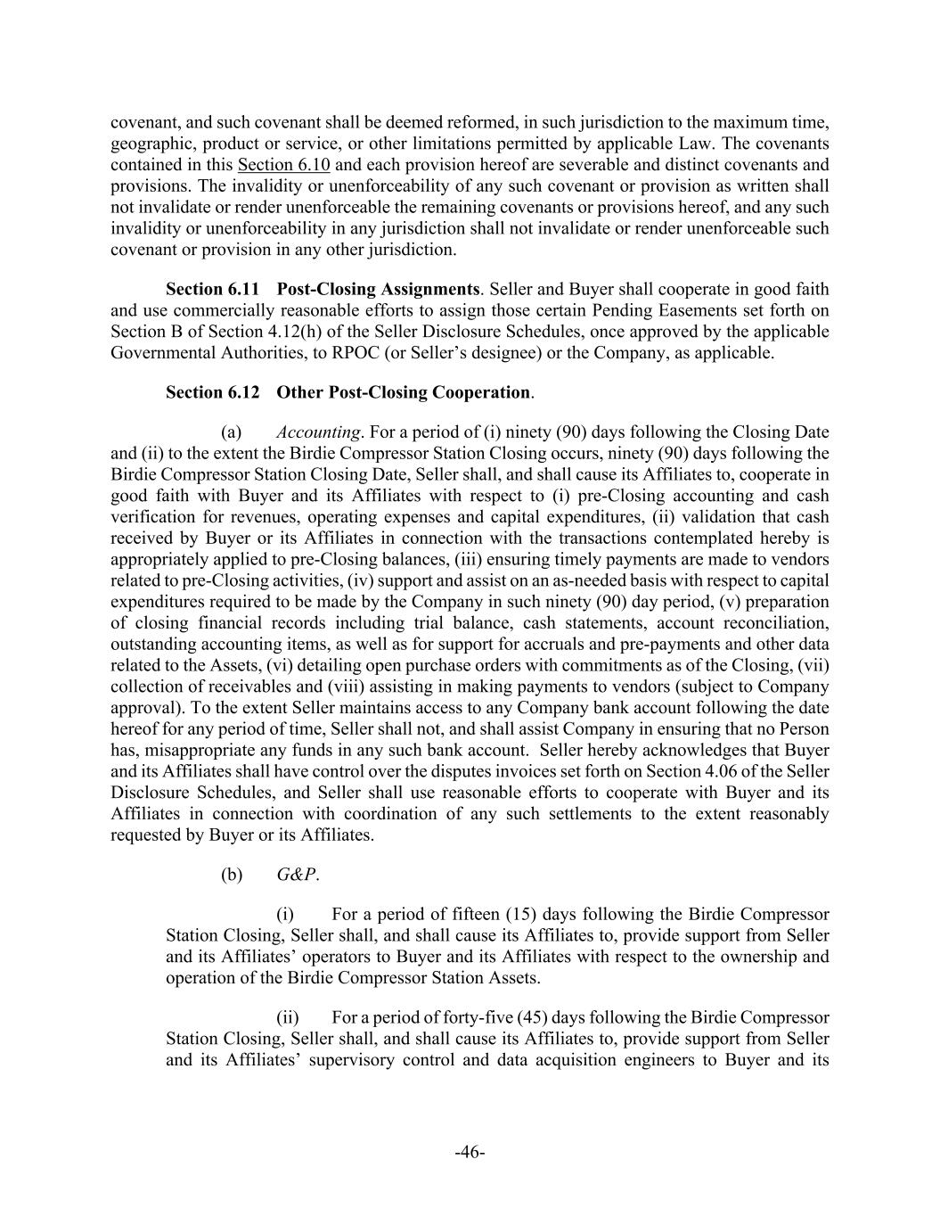 -46- covenant, and such covenant shall be deemed reformed, in such jurisdiction to the maximum time, geographic, product or service, or other limitations permitted by applicable Law. The covenants contained in this Section 6.10 and each provision hereof are severable and distinct covenants and provisions. The invalidity or unenforceability of any such covenant or provision as written shall not invalidate or render unenforceable the remaining covenants or provisions hereof, and any such invalidity or unenforceability in any jurisdiction shall not invalidate or render unenforceable such covenant or provision in any other jurisdiction. Section 6.11 Post-Closing Assignments. Seller and Buyer shall cooperate in good faith and use commercially reasonable efforts to assign those certain Pending Easements set forth on Section B of Section 4.12(h) of the Seller Disclosure Schedules, once approved by the applicable Governmental Authorities, to RPOC (or Seller’s designee) or the Company, as applicable. Section 6.12 Other Post-Closing Cooperation. (a) Accounting. For a period of (i) ninety (90) days following the Closing Date and (ii) to the extent the Birdie Compressor Station Closing occurs, ninety (90) days following the Birdie Compressor Station Closing Date, Seller shall, and shall cause its Affiliates to, cooperate in good faith with Buyer and its Affiliates with respect to (i) pre-Closing accounting and cash verification for revenues, operating expenses and capital expenditures, (ii) validation that cash received by Buyer or its Affiliates in connection with the transactions contemplated hereby is appropriately applied to pre-Closing balances, (iii) ensuring timely payments are made to vendors related to pre-Closing activities, (iv) support and assist on an as-needed basis with respect to capital expenditures required to be made by the Company in such ninety (90) day period, (v) preparation of closing financial records including trial balance, cash statements, account reconciliation, outstanding accounting items, as well as for support for accruals and pre-payments and other data related to the Assets, (vi) detailing open purchase orders with commitments as of the Closing, (vii) collection of receivables and (viii) assisting in making payments to vendors (subject to Company approval). To the extent Seller maintains access to any Company bank account following the date hereof for any period of time, Seller shall not, and shall assist Company in ensuring that no Person has, misappropriate any funds in any such bank account. Seller hereby acknowledges that Buyer and its Affiliates shall have control over the disputes invoices set forth on Section 4.06 of the Seller Disclosure Schedules, and Seller shall use reasonable efforts to cooperate with Buyer and its Affiliates in connection with coordination of any such settlements to the extent reasonably requested by Buyer or its Affiliates. (b) G&P. (i) For a period of fifteen (15) days following the Birdie Compressor Station Closing, Seller shall, and shall cause its Affiliates to, provide support from Seller and its Affiliates’ operators to Buyer and its Affiliates with respect to the ownership and operation of the Birdie Compressor Station Assets. (ii) For a period of forty-five (45) days following the Birdie Compressor Station Closing, Seller shall, and shall cause its Affiliates to, provide support from Seller and its Affiliates’ supervisory control and data acquisition engineers to Buyer and its