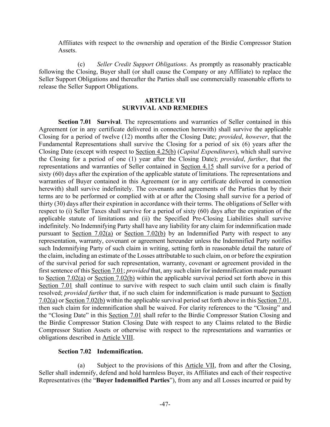 -47- Affiliates with respect to the ownership and operation of the Birdie Compressor Station Assets. (c) Seller Credit Support Obligations. As promptly as reasonably practicable following the Closing, Buyer shall (or shall cause the Company or any Affiliate) to replace the Seller Support Obligations and thereafter the Parties shall use commercially reasonable efforts to release the Seller Support Obligations. ARTICLE VII SURVIVAL AND REMEDIES Section 7.01 Survival. The representations and warranties of Seller contained in this Agreement (or in any certificate delivered in connection herewith) shall survive the applicable Closing for a period of twelve (12) months after the Closing Date; provided, however, that the Fundamental Representations shall survive the Closing for a period of six (6) years after the Closing Date (except with respect to Section 4.25(b) (Capital Expenditures), which shall survive the Closing for a period of one (1) year after the Closing Date); provided, further, that the representations and warranties of Seller contained in Section 4.15 shall survive for a period of sixty (60) days after the expiration of the applicable statute of limitations. The representations and warranties of Buyer contained in this Agreement (or in any certificate delivered in connection herewith) shall survive indefinitely. The covenants and agreements of the Parties that by their terms are to be performed or complied with at or after the Closing shall survive for a period of thirty (30) days after their expiration in accordance with their terms. The obligations of Seller with respect to (i) Seller Taxes shall survive for a period of sixty (60) days after the expiration of the applicable statute of limitations and (ii) the Specified Pre-Closing Liabilities shall survive indefinitely. No Indemnifying Party shall have any liability for any claim for indemnification made pursuant to Section 7.02(a) or Section 7.02(b) by an Indemnified Party with respect to any representation, warranty, covenant or agreement hereunder unless the Indemnified Party notifies such Indemnifying Party of such claim in writing, setting forth in reasonable detail the nature of the claim, including an estimate of the Losses attributable to such claim, on or before the expiration of the survival period for such representation, warranty, covenant or agreement provided in the first sentence of this Section 7.01; provided that, any such claim for indemnification made pursuant to Section 7.02(a) or Section 7.02(b) within the applicable survival period set forth above in this Section 7.01 shall continue to survive with respect to such claim until such claim is finally resolved; provided further that, if no such claim for indemnification is made pursuant to Section 7.02(a) or Section 7.02(b) within the applicable survival period set forth above in this Section 7.01, then such claim for indemnification shall be waived. For clarity references to the “Closing” and the “Closing Date” in this Section 7.01 shall refer to the Birdie Compressor Station Closing and the Birdie Compressor Station Closing Date with respect to any Claims related to the Birdie Compressor Station Assets or otherwise with respect to the representations and warranties or obligations described in Article VIII. Section 7.02 Indemnification. (a) Subject to the provisions of this Article VII, from and after the Closing, Seller shall indemnify, defend and hold harmless Buyer, its Affiliates and each of their respective Representatives (the “Buyer Indemnified Parties”), from any and all Losses incurred or paid by