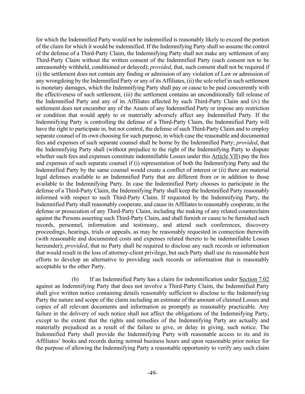 -49- for which the Indemnified Party would not be indemnified is reasonably likely to exceed the portion of the claim for which it would be indemnified. If the Indemnifying Party shall so assume the control of the defense of a Third-Party Claim, the Indemnifying Party shall not make any settlement of any Third-Party Claim without the written consent of the Indemnified Party (such consent not to be unreasonably withheld, conditioned or delayed); provided, that, such consent shall not be required if (i) the settlement does not contain any finding or admission of any violation of Law or admission of any wrongdoing by the Indemnified Party or any of its Affiliates, (ii) the sole relief in such settlement is monetary damages, which the Indemnifying Party shall pay or cause to be paid concurrently with the effectiveness of such settlement, (iii) the settlement contains an unconditionally full release of the Indemnified Party and any of its Affiliates affected by such Third-Party Claim and (iv) the settlement does not encumber any of the Assets of any Indemnified Party or impose any restriction or condition that would apply to or materially adversely affect any Indemnified Party. If the Indemnifying Party is controlling the defense of a Third-Party Claim, the Indemnified Party will have the right to participate in, but not control, the defense of such Third-Party Claim and to employ separate counsel of its own choosing for such purpose, in which case the reasonable and documented fees and expenses of such separate counsel shall be borne by the Indemnified Party; provided, that the Indemnifying Party shall (without prejudice to the right of the Indemnifying Party to dispute whether such fees and expenses constitute indemnifiable Losses under this Article VII) pay the fees and expenses of such separate counsel if (i) representation of both the Indemnifying Party and the Indemnified Party by the same counsel would create a conflict of interest or (ii) there are material legal defenses available to an Indemnified Party that are different from or in addition to those available to the Indemnifying Party. In case the Indemnified Party chooses to participate in the defense of a Third-Party Claim, the Indemnifying Party shall keep the Indemnified Party reasonably informed with respect to such Third-Party Claim. If requested by the Indemnifying Party, the Indemnified Party shall reasonably cooperate, and cause its Affiliates to reasonably cooperate, in the defense or prosecution of any Third-Party Claim, including the making of any related counterclaim against the Persons asserting such Third-Party Claim, and shall furnish or cause to be furnished such records, personnel, information and testimony, and attend such conferences, discovery proceedings, hearings, trials or appeals, as may be reasonably requested in connection therewith (with reasonable and documented costs and expenses related thereto to be indemnifiable Losses hereunder); provided, that no Party shall be required to disclose any such records or information that would result in the loss of attorney-client privilege, but such Party shall use its reasonable best efforts to develop an alternative to providing such records or information that is reasonably acceptable to the other Party. (b) If an Indemnified Party has a claim for indemnification under Section 7.02 against an Indemnifying Party that does not involve a Third-Party Claim, the Indemnified Party shall give written notice containing details reasonably sufficient to disclose to the Indemnifying Party the nature and scope of the claim including an estimate of the amount of claimed Losses and copies of all relevant documents and information as promptly as reasonably practicable. Any failure in the delivery of such notice shall not affect the obligations of the Indemnifying Party, except to the extent that the rights and remedies of the Indemnifying Party are actually and materially prejudiced as a result of the failure to give, or delay in giving, such notice. The Indemnified Party shall provide the Indemnifying Party with reasonable access to its and its Affiliates’ books and records during normal business hours and upon reasonable prior notice for the purpose of allowing the Indemnifying Party a reasonable opportunity to verify any such claim