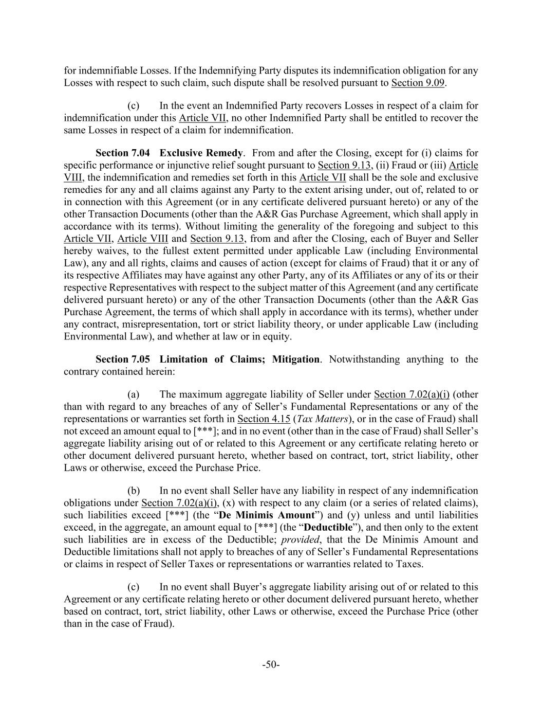 -50- for indemnifiable Losses. If the Indemnifying Party disputes its indemnification obligation for any Losses with respect to such claim, such dispute shall be resolved pursuant to Section 9.09. (c) In the event an Indemnified Party recovers Losses in respect of a claim for indemnification under this Article VII, no other Indemnified Party shall be entitled to recover the same Losses in respect of a claim for indemnification. Section 7.04 Exclusive Remedy. From and after the Closing, except for (i) claims for specific performance or injunctive relief sought pursuant to Section 9.13, (ii) Fraud or (iii) Article VIII, the indemnification and remedies set forth in this Article VII shall be the sole and exclusive remedies for any and all claims against any Party to the extent arising under, out of, related to or in connection with this Agreement (or in any certificate delivered pursuant hereto) or any of the other Transaction Documents (other than the A&R Gas Purchase Agreement, which shall apply in accordance with its terms). Without limiting the generality of the foregoing and subject to this Article VII, Article VIII and Section 9.13, from and after the Closing, each of Buyer and Seller hereby waives, to the fullest extent permitted under applicable Law (including Environmental Law), any and all rights, claims and causes of action (except for claims of Fraud) that it or any of its respective Affiliates may have against any other Party, any of its Affiliates or any of its or their respective Representatives with respect to the subject matter of this Agreement (and any certificate delivered pursuant hereto) or any of the other Transaction Documents (other than the A&R Gas Purchase Agreement, the terms of which shall apply in accordance with its terms), whether under any contract, misrepresentation, tort or strict liability theory, or under applicable Law (including Environmental Law), and whether at law or in equity. Section 7.05 Limitation of Claims; Mitigation. Notwithstanding anything to the contrary contained herein: (a) The maximum aggregate liability of Seller under Section 7.02(a)(i) (other than with regard to any breaches of any of Seller’s Fundamental Representations or any of the representations or warranties set forth in Section 4.15 (Tax Matters), or in the case of Fraud) shall not exceed an amount equal to [***]; and in no event (other than in the case of Fraud) shall Seller’s aggregate liability arising out of or related to this Agreement or any certificate relating hereto or other document delivered pursuant hereto, whether based on contract, tort, strict liability, other Laws or otherwise, exceed the Purchase Price. (b) In no event shall Seller have any liability in respect of any indemnification obligations under Section 7.02(a)(i), (x) with respect to any claim (or a series of related claims), such liabilities exceed [***] (the “De Minimis Amount”) and (y) unless and until liabilities exceed, in the aggregate, an amount equal to [***] (the “Deductible”), and then only to the extent such liabilities are in excess of the Deductible; provided, that the De Minimis Amount and Deductible limitations shall not apply to breaches of any of Seller’s Fundamental Representations or claims in respect of Seller Taxes or representations or warranties related to Taxes. (c) In no event shall Buyer’s aggregate liability arising out of or related to this Agreement or any certificate relating hereto or other document delivered pursuant hereto, whether based on contract, tort, strict liability, other Laws or otherwise, exceed the Purchase Price (other than in the case of Fraud).