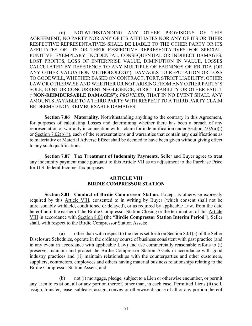 -51- (d) NOTWITHSTANDING ANY OTHER PROVISIONS OF THIS AGREEMENT, NO PARTY NOR ANY OF ITS AFFILIATES NOR ANY OF ITS OR THEIR RESPECTIVE REPRESENTATIVES SHALL BE LIABLE TO THE OTHER PARTY OR ITS AFFILIATES OR ITS OR THEIR RESPECTIVE REPRESENTATIVES FOR SPECIAL, PUNITIVE, EXEMPLARY, INCIDENTAL, CONSEQUENTIAL OR INDIRECT DAMAGES, LOST PROFITS, LOSS OF ENTERPRISE VALUE, DIMINUTION IN VALUE, LOSSES CALCULATED BY REFERENCE TO ANY MULTIPLE OF EARNINGS OR EBITDA (OR ANY OTHER VALUATION METHODOLOGY), DAMAGES TO REPUTATION OR LOSS TO GOODWILL, WHETHER BASED ON CONTRACT, TORT, STRICT LIABILITY, OTHER LAW OR OTHERWISE AND WHETHER OR NOT ARISING FROM ANY OTHER PARTY’S SOLE, JOINT OR CONCURRENT NEGLIGENCE, STRICT LIABILITY OR OTHER FAULT (“NON-REIMBURSABLE DAMAGES”); PROVIDED, THAT IN NO EVENT SHALL ANY AMOUNTS PAYABLE TO A THIRD PARTY WITH RESPECT TO A THIRD PARTY CLAIM BE DEEMED NON-REIMBURSABLE DAMAGES. Section 7.06 Materiality. Notwithstanding anything to the contrary in this Agreement, for purposes of calculating Losses and determining whether there has been a breach of any representation or warranty in connection with a claim for indemnification under Section 7.02(a)(i) or Section 7.02(b)(i), each of the representations and warranties that contain any qualifications as to materiality or Material Adverse Effect shall be deemed to have been given without giving effect to any such qualifications. Section 7.07 Tax Treatment of Indemnity Payments. Seller and Buyer agree to treat any indemnity payment made pursuant to this Article VII as an adjustment to the Purchase Price for U.S. federal Income Tax purposes. ARTICLE VIII BIRDIE COMPRESSOR STATION Section 8.01 Conduct of Birdie Compressor Station. Except as otherwise expressly required by this Article VIII, consented to in writing by Buyer (which consent shall not be unreasonably withheld, conditioned or delayed), or as required by applicable Law, from the date hereof until the earlier of the Birdie Compressor Station Closing or the termination of this Article VIII in accordance with Section 8.08 (the “Birdie Compressor Station Interim Period”), Seller shall, with respect to the Birdie Compressor Station Assets: (a) other than with respect to the items set forth on Section 8.01(a) of the Seller Disclosure Schedules, operate in the ordinary course of business consistent with past practice (and in any event in accordance with applicable Law) and use commercially reasonable efforts to (i) preserve, maintain and protect the Birdie Compressor Station Assets in accordance with good industry practices and (ii) maintain relationships with the counterparties and other customers, suppliers, contractors, employees and others having material business relationships relating to the Birdie Compressor Station Assets; and (b) not (i) mortgage, pledge, subject to a Lien or otherwise encumber, or permit any Lien to exist on, all or any portion thereof, other than, in each case, Permitted Liens (ii) sell, assign, transfer, lease, sublease, assign, convey or otherwise dispose of all or any portion thereof