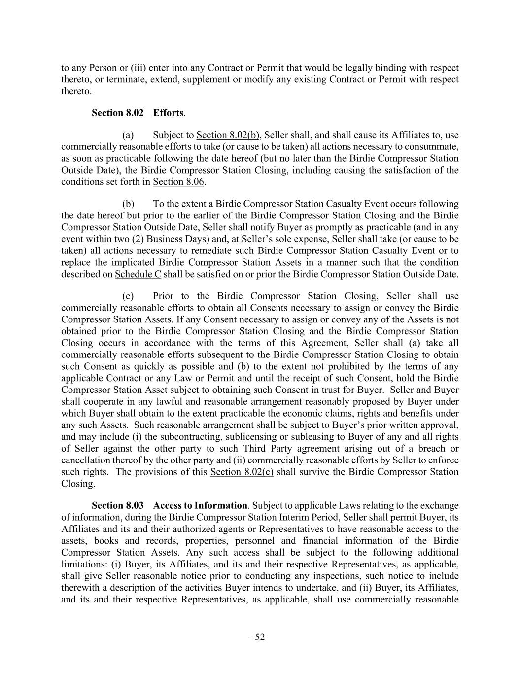 -52- to any Person or (iii) enter into any Contract or Permit that would be legally binding with respect thereto, or terminate, extend, supplement or modify any existing Contract or Permit with respect thereto. Section 8.02 Efforts. (a) Subject to Section 8.02(b), Seller shall, and shall cause its Affiliates to, use commercially reasonable efforts to take (or cause to be taken) all actions necessary to consummate, as soon as practicable following the date hereof (but no later than the Birdie Compressor Station Outside Date), the Birdie Compressor Station Closing, including causing the satisfaction of the conditions set forth in Section 8.06. (b) To the extent a Birdie Compressor Station Casualty Event occurs following the date hereof but prior to the earlier of the Birdie Compressor Station Closing and the Birdie Compressor Station Outside Date, Seller shall notify Buyer as promptly as practicable (and in any event within two (2) Business Days) and, at Seller’s sole expense, Seller shall take (or cause to be taken) all actions necessary to remediate such Birdie Compressor Station Casualty Event or to replace the implicated Birdie Compressor Station Assets in a manner such that the condition described on Schedule C shall be satisfied on or prior the Birdie Compressor Station Outside Date. (c) Prior to the Birdie Compressor Station Closing, Seller shall use commercially reasonable efforts to obtain all Consents necessary to assign or convey the Birdie Compressor Station Assets. If any Consent necessary to assign or convey any of the Assets is not obtained prior to the Birdie Compressor Station Closing and the Birdie Compressor Station Closing occurs in accordance with the terms of this Agreement, Seller shall (a) take all commercially reasonable efforts subsequent to the Birdie Compressor Station Closing to obtain such Consent as quickly as possible and (b) to the extent not prohibited by the terms of any applicable Contract or any Law or Permit and until the receipt of such Consent, hold the Birdie Compressor Station Asset subject to obtaining such Consent in trust for Buyer. Seller and Buyer shall cooperate in any lawful and reasonable arrangement reasonably proposed by Buyer under which Buyer shall obtain to the extent practicable the economic claims, rights and benefits under any such Assets. Such reasonable arrangement shall be subject to Buyer’s prior written approval, and may include (i) the subcontracting, sublicensing or subleasing to Buyer of any and all rights of Seller against the other party to such Third Party agreement arising out of a breach or cancellation thereof by the other party and (ii) commercially reasonable efforts by Seller to enforce such rights. The provisions of this Section 8.02(c) shall survive the Birdie Compressor Station Closing. Section 8.03 Access to Information. Subject to applicable Laws relating to the exchange of information, during the Birdie Compressor Station Interim Period, Seller shall permit Buyer, its Affiliates and its and their authorized agents or Representatives to have reasonable access to the assets, books and records, properties, personnel and financial information of the Birdie Compressor Station Assets. Any such access shall be subject to the following additional limitations: (i) Buyer, its Affiliates, and its and their respective Representatives, as applicable, shall give Seller reasonable notice prior to conducting any inspections, such notice to include therewith a description of the activities Buyer intends to undertake, and (ii) Buyer, its Affiliates, and its and their respective Representatives, as applicable, shall use commercially reasonable