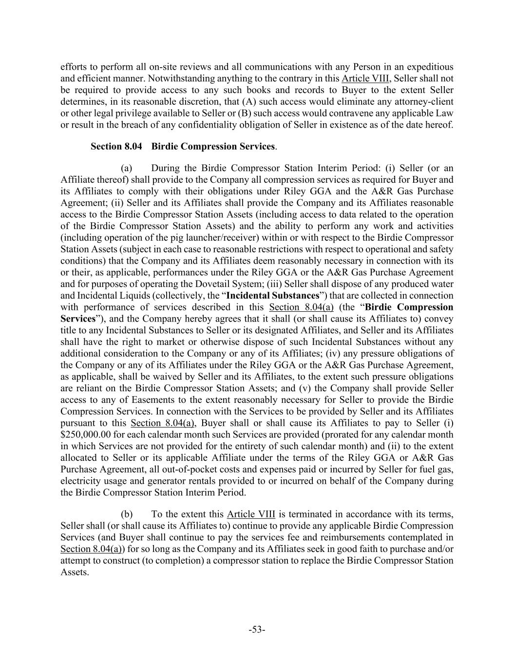 -53- efforts to perform all on-site reviews and all communications with any Person in an expeditious and efficient manner. Notwithstanding anything to the contrary in this Article VIII, Seller shall not be required to provide access to any such books and records to Buyer to the extent Seller determines, in its reasonable discretion, that (A) such access would eliminate any attorney-client or other legal privilege available to Seller or (B) such access would contravene any applicable Law or result in the breach of any confidentiality obligation of Seller in existence as of the date hereof. Section 8.04 Birdie Compression Services. (a) During the Birdie Compressor Station Interim Period: (i) Seller (or an Affiliate thereof) shall provide to the Company all compression services as required for Buyer and its Affiliates to comply with their obligations under Riley GGA and the A&R Gas Purchase Agreement; (ii) Seller and its Affiliates shall provide the Company and its Affiliates reasonable access to the Birdie Compressor Station Assets (including access to data related to the operation of the Birdie Compressor Station Assets) and the ability to perform any work and activities (including operation of the pig launcher/receiver) within or with respect to the Birdie Compressor Station Assets (subject in each case to reasonable restrictions with respect to operational and safety conditions) that the Company and its Affiliates deem reasonably necessary in connection with its or their, as applicable, performances under the Riley GGA or the A&R Gas Purchase Agreement and for purposes of operating the Dovetail System; (iii) Seller shall dispose of any produced water and Incidental Liquids (collectively, the “Incidental Substances”) that are collected in connection with performance of services described in this Section 8.04(a) (the “Birdie Compression Services”), and the Company hereby agrees that it shall (or shall cause its Affiliates to) convey title to any Incidental Substances to Seller or its designated Affiliates, and Seller and its Affiliates shall have the right to market or otherwise dispose of such Incidental Substances without any additional consideration to the Company or any of its Affiliates; (iv) any pressure obligations of the Company or any of its Affiliates under the Riley GGA or the A&R Gas Purchase Agreement, as applicable, shall be waived by Seller and its Affiliates, to the extent such pressure obligations are reliant on the Birdie Compressor Station Assets; and (v) the Company shall provide Seller access to any of Easements to the extent reasonably necessary for Seller to provide the Birdie Compression Services. In connection with the Services to be provided by Seller and its Affiliates pursuant to this Section 8.04(a), Buyer shall or shall cause its Affiliates to pay to Seller (i) $250,000.00 for each calendar month such Services are provided (prorated for any calendar month in which Services are not provided for the entirety of such calendar month) and (ii) to the extent allocated to Seller or its applicable Affiliate under the terms of the Riley GGA or A&R Gas Purchase Agreement, all out-of-pocket costs and expenses paid or incurred by Seller for fuel gas, electricity usage and generator rentals provided to or incurred on behalf of the Company during the Birdie Compressor Station Interim Period. (b) To the extent this Article VIII is terminated in accordance with its terms, Seller shall (or shall cause its Affiliates to) continue to provide any applicable Birdie Compression Services (and Buyer shall continue to pay the services fee and reimbursements contemplated in Section 8.04(a)) for so long as the Company and its Affiliates seek in good faith to purchase and/or attempt to construct (to completion) a compressor station to replace the Birdie Compressor Station Assets.