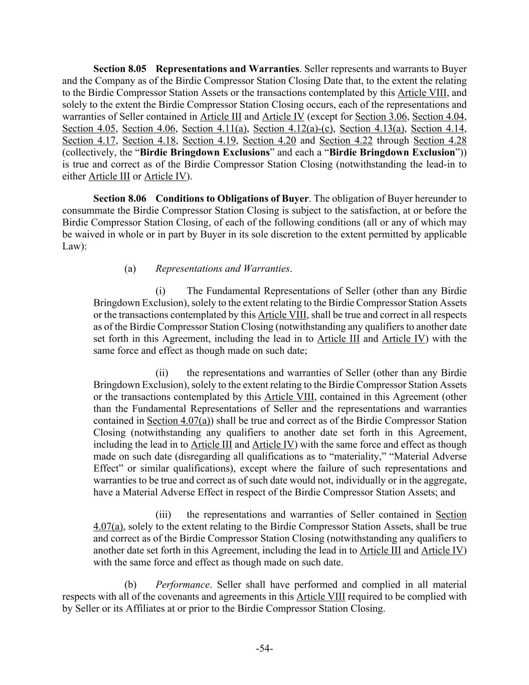 -54- Section 8.05 Representations and Warranties. Seller represents and warrants to Buyer and the Company as of the Birdie Compressor Station Closing Date that, to the extent the relating to the Birdie Compressor Station Assets or the transactions contemplated by this Article VIII, and solely to the extent the Birdie Compressor Station Closing occurs, each of the representations and warranties of Seller contained in Article III and Article IV (except for Section 3.06, Section 4.04, Section 4.05, Section 4.06, Section 4.11(a), Section 4.12(a)-(c), Section 4.13(a), Section 4.14, Section 4.17, Section 4.18, Section 4.19, Section 4.20 and Section 4.22 through Section 4.28 (collectively, the “Birdie Bringdown Exclusions” and each a “Birdie Bringdown Exclusion”)) is true and correct as of the Birdie Compressor Station Closing (notwithstanding the lead-in to either Article III or Article IV). Section 8.06 Conditions to Obligations of Buyer. The obligation of Buyer hereunder to consummate the Birdie Compressor Station Closing is subject to the satisfaction, at or before the Birdie Compressor Station Closing, of each of the following conditions (all or any of which may be waived in whole or in part by Buyer in its sole discretion to the extent permitted by applicable Law): (a) Representations and Warranties. (i) The Fundamental Representations of Seller (other than any Birdie Bringdown Exclusion), solely to the extent relating to the Birdie Compressor Station Assets or the transactions contemplated by this Article VIII, shall be true and correct in all respects as of the Birdie Compressor Station Closing (notwithstanding any qualifiers to another date set forth in this Agreement, including the lead in to Article III and Article IV) with the same force and effect as though made on such date; (ii) the representations and warranties of Seller (other than any Birdie Bringdown Exclusion), solely to the extent relating to the Birdie Compressor Station Assets or the transactions contemplated by this Article VIII, contained in this Agreement (other than the Fundamental Representations of Seller and the representations and warranties contained in Section 4.07(a)) shall be true and correct as of the Birdie Compressor Station Closing (notwithstanding any qualifiers to another date set forth in this Agreement, including the lead in to Article III and Article IV) with the same force and effect as though made on such date (disregarding all qualifications as to “materiality,” “Material Adverse Effect” or similar qualifications), except where the failure of such representations and warranties to be true and correct as of such date would not, individually or in the aggregate, have a Material Adverse Effect in respect of the Birdie Compressor Station Assets; and (iii) the representations and warranties of Seller contained in Section 4.07(a), solely to the extent relating to the Birdie Compressor Station Assets, shall be true and correct as of the Birdie Compressor Station Closing (notwithstanding any qualifiers to another date set forth in this Agreement, including the lead in to Article III and Article IV) with the same force and effect as though made on such date. (b) Performance. Seller shall have performed and complied in all material respects with all of the covenants and agreements in this Article VIII required to be complied with by Seller or its Affiliates at or prior to the Birdie Compressor Station Closing.