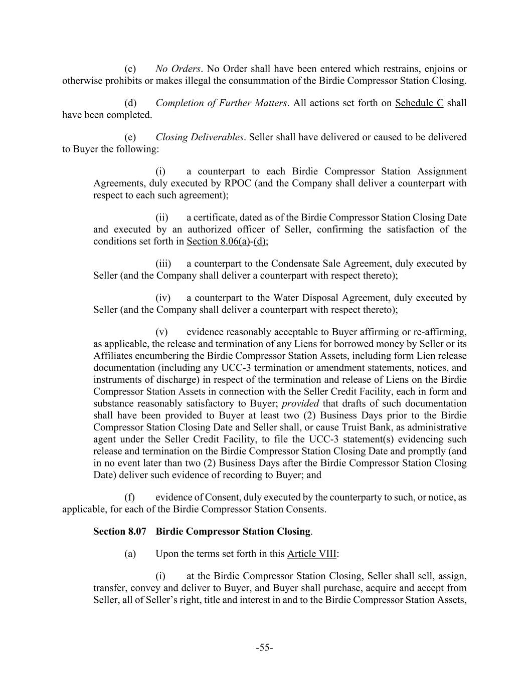 -55- (c) No Orders. No Order shall have been entered which restrains, enjoins or otherwise prohibits or makes illegal the consummation of the Birdie Compressor Station Closing. (d) Completion of Further Matters. All actions set forth on Schedule C shall have been completed. (e) Closing Deliverables. Seller shall have delivered or caused to be delivered to Buyer the following: (i) a counterpart to each Birdie Compressor Station Assignment Agreements, duly executed by RPOC (and the Company shall deliver a counterpart with respect to each such agreement); (ii) a certificate, dated as of the Birdie Compressor Station Closing Date and executed by an authorized officer of Seller, confirming the satisfaction of the conditions set forth in Section 8.06(a)-(d); (iii) a counterpart to the Condensate Sale Agreement, duly executed by Seller (and the Company shall deliver a counterpart with respect thereto); (iv) a counterpart to the Water Disposal Agreement, duly executed by Seller (and the Company shall deliver a counterpart with respect thereto); (v) evidence reasonably acceptable to Buyer affirming or re-affirming, as applicable, the release and termination of any Liens for borrowed money by Seller or its Affiliates encumbering the Birdie Compressor Station Assets, including form Lien release documentation (including any UCC-3 termination or amendment statements, notices, and instruments of discharge) in respect of the termination and release of Liens on the Birdie Compressor Station Assets in connection with the Seller Credit Facility, each in form and substance reasonably satisfactory to Buyer; provided that drafts of such documentation shall have been provided to Buyer at least two (2) Business Days prior to the Birdie Compressor Station Closing Date and Seller shall, or cause Truist Bank, as administrative agent under the Seller Credit Facility, to file the UCC-3 statement(s) evidencing such release and termination on the Birdie Compressor Station Closing Date and promptly (and in no event later than two (2) Business Days after the Birdie Compressor Station Closing Date) deliver such evidence of recording to Buyer; and (f) evidence of Consent, duly executed by the counterparty to such, or notice, as applicable, for each of the Birdie Compressor Station Consents. Section 8.07 Birdie Compressor Station Closing. (a) Upon the terms set forth in this Article VIII: (i) at the Birdie Compressor Station Closing, Seller shall sell, assign, transfer, convey and deliver to Buyer, and Buyer shall purchase, acquire and accept from Seller, all of Seller’s right, title and interest in and to the Birdie Compressor Station Assets,