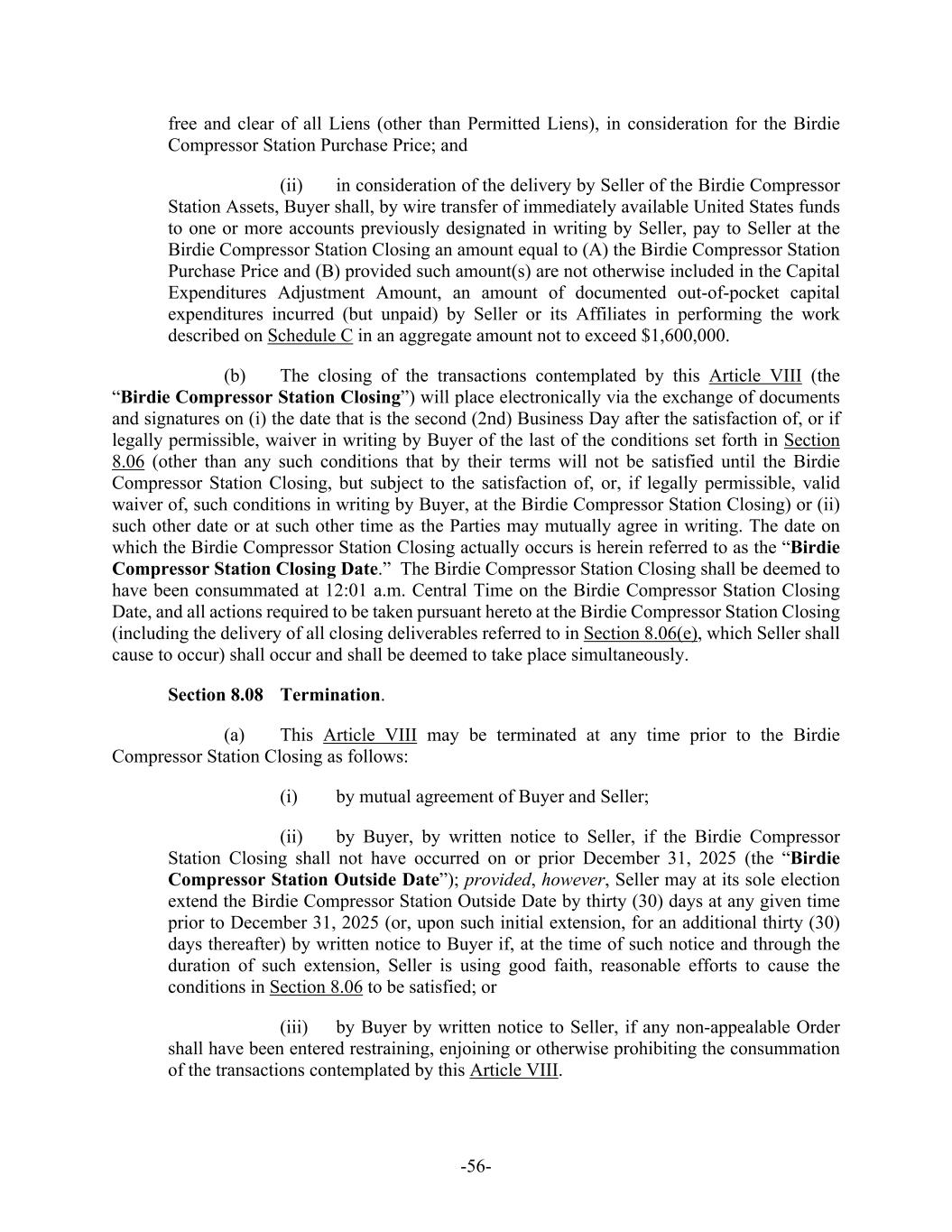 -56- free and clear of all Liens (other than Permitted Liens), in consideration for the Birdie Compressor Station Purchase Price; and (ii) in consideration of the delivery by Seller of the Birdie Compressor Station Assets, Buyer shall, by wire transfer of immediately available United States funds to one or more accounts previously designated in writing by Seller, pay to Seller at the Birdie Compressor Station Closing an amount equal to (A) the Birdie Compressor Station Purchase Price and (B) provided such amount(s) are not otherwise included in the Capital Expenditures Adjustment Amount, an amount of documented out-of-pocket capital expenditures incurred (but unpaid) by Seller or its Affiliates in performing the work described on Schedule C in an aggregate amount not to exceed $1,600,000. (b) The closing of the transactions contemplated by this Article VIII (the “Birdie Compressor Station Closing”) will place electronically via the exchange of documents and signatures on (i) the date that is the second (2nd) Business Day after the satisfaction of, or if legally permissible, waiver in writing by Buyer of the last of the conditions set forth in Section 8.06 (other than any such conditions that by their terms will not be satisfied until the Birdie Compressor Station Closing, but subject to the satisfaction of, or, if legally permissible, valid waiver of, such conditions in writing by Buyer, at the Birdie Compressor Station Closing) or (ii) such other date or at such other time as the Parties may mutually agree in writing. The date on which the Birdie Compressor Station Closing actually occurs is herein referred to as the “Birdie Compressor Station Closing Date.” The Birdie Compressor Station Closing shall be deemed to have been consummated at 12:01 a.m. Central Time on the Birdie Compressor Station Closing Date, and all actions required to be taken pursuant hereto at the Birdie Compressor Station Closing (including the delivery of all closing deliverables referred to in Section 8.06(e), which Seller shall cause to occur) shall occur and shall be deemed to take place simultaneously. Section 8.08 Termination. (a) This Article VIII may be terminated at any time prior to the Birdie Compressor Station Closing as follows: (i) by mutual agreement of Buyer and Seller; (ii) by Buyer, by written notice to Seller, if the Birdie Compressor Station Closing shall not have occurred on or prior December 31, 2025 (the “Birdie Compressor Station Outside Date”); provided, however, Seller may at its sole election extend the Birdie Compressor Station Outside Date by thirty (30) days at any given time prior to December 31, 2025 (or, upon such initial extension, for an additional thirty (30) days thereafter) by written notice to Buyer if, at the time of such notice and through the duration of such extension, Seller is using good faith, reasonable efforts to cause the conditions in Section 8.06 to be satisfied; or (iii) by Buyer by written notice to Seller, if any non-appealable Order shall have been entered restraining, enjoining or otherwise prohibiting the consummation of the transactions contemplated by this Article VIII.