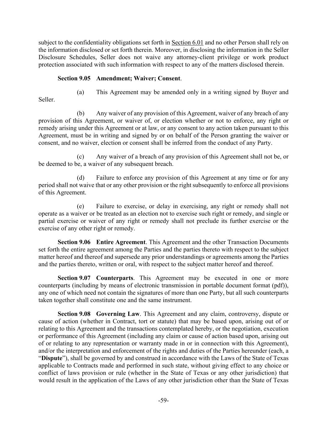 -59- subject to the confidentiality obligations set forth in Section 6.01 and no other Person shall rely on the information disclosed or set forth therein. Moreover, in disclosing the information in the Seller Disclosure Schedules, Seller does not waive any attorney-client privilege or work product protection associated with such information with respect to any of the matters disclosed therein. Section 9.05 Amendment; Waiver; Consent. (a) This Agreement may be amended only in a writing signed by Buyer and Seller. (b) Any waiver of any provision of this Agreement, waiver of any breach of any provision of this Agreement, or waiver of, or election whether or not to enforce, any right or remedy arising under this Agreement or at law, or any consent to any action taken pursuant to this Agreement, must be in writing and signed by or on behalf of the Person granting the waiver or consent, and no waiver, election or consent shall be inferred from the conduct of any Party. (c) Any waiver of a breach of any provision of this Agreement shall not be, or be deemed to be, a waiver of any subsequent breach. (d) Failure to enforce any provision of this Agreement at any time or for any period shall not waive that or any other provision or the right subsequently to enforce all provisions of this Agreement. (e) Failure to exercise, or delay in exercising, any right or remedy shall not operate as a waiver or be treated as an election not to exercise such right or remedy, and single or partial exercise or waiver of any right or remedy shall not preclude its further exercise or the exercise of any other right or remedy. Section 9.06 Entire Agreement. This Agreement and the other Transaction Documents set forth the entire agreement among the Parties and the parties thereto with respect to the subject matter hereof and thereof and supersede any prior understandings or agreements among the Parties and the parties thereto, written or oral, with respect to the subject matter hereof and thereof. Section 9.07 Counterparts. This Agreement may be executed in one or more counterparts (including by means of electronic transmission in portable document format (pdf)), any one of which need not contain the signatures of more than one Party, but all such counterparts taken together shall constitute one and the same instrument. Section 9.08 Governing Law. This Agreement and any claim, controversy, dispute or cause of action (whether in Contract, tort or statute) that may be based upon, arising out of or relating to this Agreement and the transactions contemplated hereby, or the negotiation, execution or performance of this Agreement (including any claim or cause of action based upon, arising out of or relating to any representation or warranty made in or in connection with this Agreement), and/or the interpretation and enforcement of the rights and duties of the Parties hereunder (each, a “Dispute”), shall be governed by and construed in accordance with the Laws of the State of Texas applicable to Contracts made and performed in such state, without giving effect to any choice or conflict of laws provision or rule (whether in the State of Texas or any other jurisdiction) that would result in the application of the Laws of any other jurisdiction other than the State of Texas
