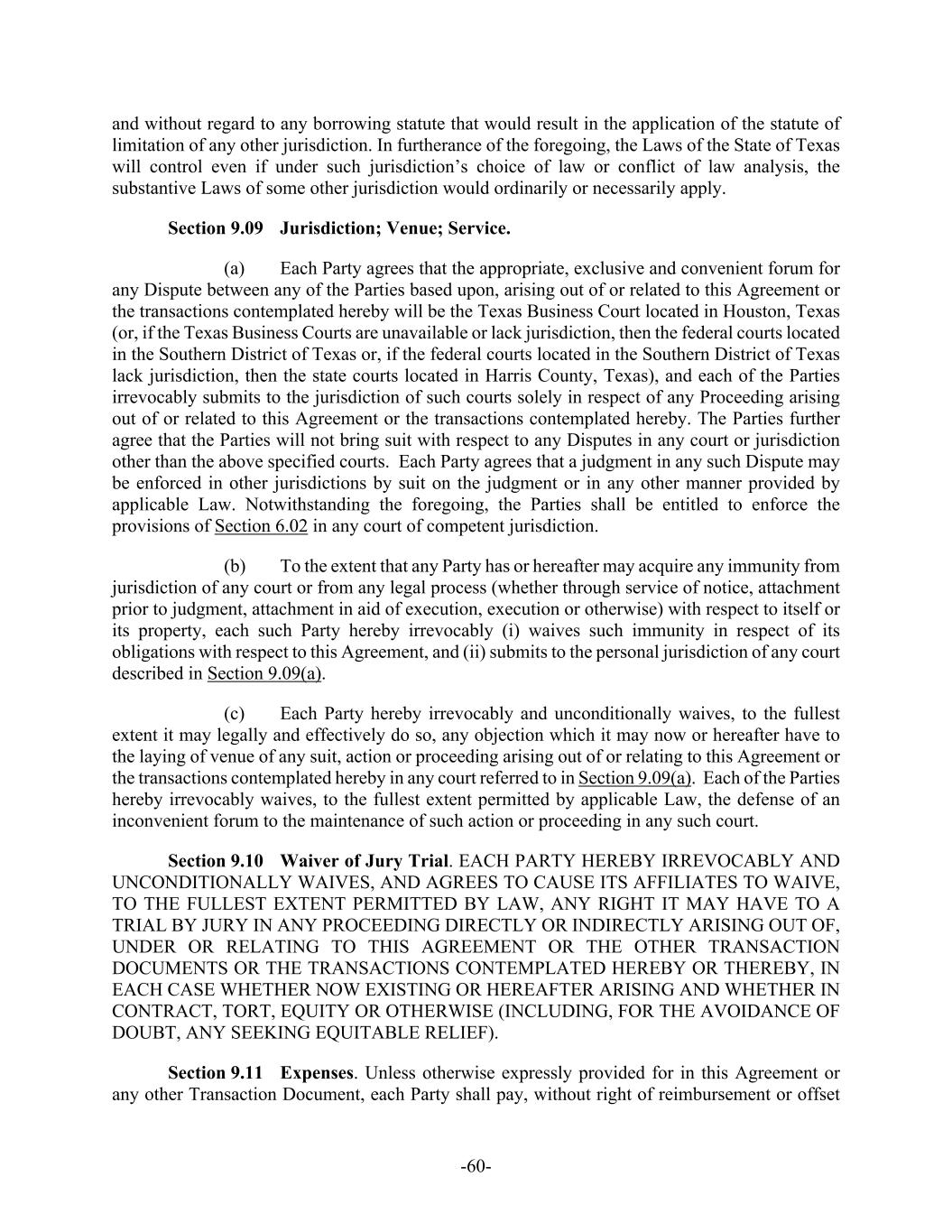 -60- and without regard to any borrowing statute that would result in the application of the statute of limitation of any other jurisdiction. In furtherance of the foregoing, the Laws of the State of Texas will control even if under such jurisdiction’s choice of law or conflict of law analysis, the substantive Laws of some other jurisdiction would ordinarily or necessarily apply. Section 9.09 Jurisdiction; Venue; Service. (a) Each Party agrees that the appropriate, exclusive and convenient forum for any Dispute between any of the Parties based upon, arising out of or related to this Agreement or the transactions contemplated hereby will be the Texas Business Court located in Houston, Texas (or, if the Texas Business Courts are unavailable or lack jurisdiction, then the federal courts located in the Southern District of Texas or, if the federal courts located in the Southern District of Texas lack jurisdiction, then the state courts located in Harris County, Texas), and each of the Parties irrevocably submits to the jurisdiction of such courts solely in respect of any Proceeding arising out of or related to this Agreement or the transactions contemplated hereby. The Parties further agree that the Parties will not bring suit with respect to any Disputes in any court or jurisdiction other than the above specified courts. Each Party agrees that a judgment in any such Dispute may be enforced in other jurisdictions by suit on the judgment or in any other manner provided by applicable Law. Notwithstanding the foregoing, the Parties shall be entitled to enforce the provisions of Section 6.02 in any court of competent jurisdiction. (b) To the extent that any Party has or hereafter may acquire any immunity from jurisdiction of any court or from any legal process (whether through service of notice, attachment prior to judgment, attachment in aid of execution, execution or otherwise) with respect to itself or its property, each such Party hereby irrevocably (i) waives such immunity in respect of its obligations with respect to this Agreement, and (ii) submits to the personal jurisdiction of any court described in Section 9.09(a). (c) Each Party hereby irrevocably and unconditionally waives, to the fullest extent it may legally and effectively do so, any objection which it may now or hereafter have to the laying of venue of any suit, action or proceeding arising out of or relating to this Agreement or the transactions contemplated hereby in any court referred to in Section 9.09(a). Each of the Parties hereby irrevocably waives, to the fullest extent permitted by applicable Law, the defense of an inconvenient forum to the maintenance of such action or proceeding in any such court. Section 9.10 Waiver of Jury Trial. EACH PARTY HEREBY IRREVOCABLY AND UNCONDITIONALLY WAIVES, AND AGREES TO CAUSE ITS AFFILIATES TO WAIVE, TO THE FULLEST EXTENT PERMITTED BY LAW, ANY RIGHT IT MAY HAVE TO A TRIAL BY JURY IN ANY PROCEEDING DIRECTLY OR INDIRECTLY ARISING OUT OF, UNDER OR RELATING TO THIS AGREEMENT OR THE OTHER TRANSACTION DOCUMENTS OR THE TRANSACTIONS CONTEMPLATED HEREBY OR THEREBY, IN EACH CASE WHETHER NOW EXISTING OR HEREAFTER ARISING AND WHETHER IN CONTRACT, TORT, EQUITY OR OTHERWISE (INCLUDING, FOR THE AVOIDANCE OF DOUBT, ANY SEEKING EQUITABLE RELIEF). Section 9.11 Expenses. Unless otherwise expressly provided for in this Agreement or any other Transaction Document, each Party shall pay, without right of reimbursement or offset