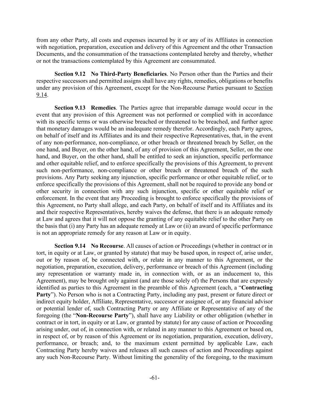 -61- from any other Party, all costs and expenses incurred by it or any of its Affiliates in connection with negotiation, preparation, execution and delivery of this Agreement and the other Transaction Documents, and the consummation of the transactions contemplated hereby and thereby, whether or not the transactions contemplated by this Agreement are consummated. Section 9.12 No Third-Party Beneficiaries. No Person other than the Parties and their respective successors and permitted assigns shall have any rights, remedies, obligations or benefits under any provision of this Agreement, except for the Non-Recourse Parties pursuant to Section 9.14. Section 9.13 Remedies. The Parties agree that irreparable damage would occur in the event that any provision of this Agreement was not performed or complied with in accordance with its specific terms or was otherwise breached or threatened to be breached, and further agree that monetary damages would be an inadequate remedy therefor. Accordingly, each Party agrees, on behalf of itself and its Affiliates and its and their respective Representatives, that, in the event of any non-performance, non-compliance, or other breach or threatened breach by Seller, on the one hand, and Buyer, on the other hand, of any of provision of this Agreement, Seller, on the one hand, and Buyer, on the other hand, shall be entitled to seek an injunction, specific performance and other equitable relief, and to enforce specifically the provisions of this Agreement, to prevent such non-performance, non-compliance or other breach or threatened breach of the such provisions. Any Party seeking any injunction, specific performance or other equitable relief, or to enforce specifically the provisions of this Agreement, shall not be required to provide any bond or other security in connection with any such injunction, specific or other equitable relief or enforcement. In the event that any Proceeding is brought to enforce specifically the provisions of this Agreement, no Party shall allege, and each Party, on behalf of itself and its Affiliates and its and their respective Representatives, hereby waives the defense, that there is an adequate remedy at Law and agrees that it will not oppose the granting of any equitable relief to the other Party on the basis that (i) any Party has an adequate remedy at Law or (ii) an award of specific performance is not an appropriate remedy for any reason at Law or in equity. Section 9.14 No Recourse. All causes of action or Proceedings (whether in contract or in tort, in equity or at Law, or granted by statute) that may be based upon, in respect of, arise under, out or by reason of, be connected with, or relate in any manner to this Agreement, or the negotiation, preparation, execution, delivery, performance or breach of this Agreement (including any representation or warranty made in, in connection with, or as an inducement to, this Agreement), may be brought only against (and are those solely of) the Persons that are expressly identified as parties to this Agreement in the preamble of this Agreement (each, a “Contracting Party”). No Person who is not a Contracting Party, including any past, present or future direct or indirect equity holder, Affiliate, Representative, successor or assignee of, or any financial advisor or potential lender of, such Contracting Party or any Affiliate or Representative of any of the foregoing (the “Non-Recourse Party”), shall have any Liability or other obligation (whether in contract or in tort, in equity or at Law, or granted by statute) for any cause of action or Proceeding arising under, out of, in connection with, or related in any manner to this Agreement or based on, in respect of, or by reason of this Agreement or its negotiation, preparation, execution, delivery, performance, or breach; and, to the maximum extent permitted by applicable Law, each Contracting Party hereby waives and releases all such causes of action and Proceedings against any such Non-Recourse Party. Without limiting the generality of the foregoing, to the maximum