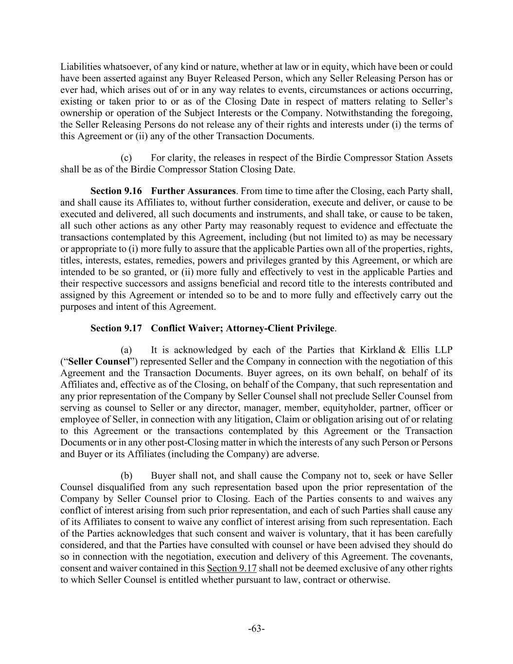 -63- Liabilities whatsoever, of any kind or nature, whether at law or in equity, which have been or could have been asserted against any Buyer Released Person, which any Seller Releasing Person has or ever had, which arises out of or in any way relates to events, circumstances or actions occurring, existing or taken prior to or as of the Closing Date in respect of matters relating to Seller’s ownership or operation of the Subject Interests or the Company. Notwithstanding the foregoing, the Seller Releasing Persons do not release any of their rights and interests under (i) the terms of this Agreement or (ii) any of the other Transaction Documents. (c) For clarity, the releases in respect of the Birdie Compressor Station Assets shall be as of the Birdie Compressor Station Closing Date. Section 9.16 Further Assurances. From time to time after the Closing, each Party shall, and shall cause its Affiliates to, without further consideration, execute and deliver, or cause to be executed and delivered, all such documents and instruments, and shall take, or cause to be taken, all such other actions as any other Party may reasonably request to evidence and effectuate the transactions contemplated by this Agreement, including (but not limited to) as may be necessary or appropriate to (i) more fully to assure that the applicable Parties own all of the properties, rights, titles, interests, estates, remedies, powers and privileges granted by this Agreement, or which are intended to be so granted, or (ii) more fully and effectively to vest in the applicable Parties and their respective successors and assigns beneficial and record title to the interests contributed and assigned by this Agreement or intended so to be and to more fully and effectively carry out the purposes and intent of this Agreement. Section 9.17 Conflict Waiver; Attorney-Client Privilege. (a) It is acknowledged by each of the Parties that Kirkland & Ellis LLP (“Seller Counsel”) represented Seller and the Company in connection with the negotiation of this Agreement and the Transaction Documents. Buyer agrees, on its own behalf, on behalf of its Affiliates and, effective as of the Closing, on behalf of the Company, that such representation and any prior representation of the Company by Seller Counsel shall not preclude Seller Counsel from serving as counsel to Seller or any director, manager, member, equityholder, partner, officer or employee of Seller, in connection with any litigation, Claim or obligation arising out of or relating to this Agreement or the transactions contemplated by this Agreement or the Transaction Documents or in any other post-Closing matter in which the interests of any such Person or Persons and Buyer or its Affiliates (including the Company) are adverse. (b) Buyer shall not, and shall cause the Company not to, seek or have Seller Counsel disqualified from any such representation based upon the prior representation of the Company by Seller Counsel prior to Closing. Each of the Parties consents to and waives any conflict of interest arising from such prior representation, and each of such Parties shall cause any of its Affiliates to consent to waive any conflict of interest arising from such representation. Each of the Parties acknowledges that such consent and waiver is voluntary, that it has been carefully considered, and that the Parties have consulted with counsel or have been advised they should do so in connection with the negotiation, execution and delivery of this Agreement. The covenants, consent and waiver contained in this Section 9.17 shall not be deemed exclusive of any other rights to which Seller Counsel is entitled whether pursuant to law, contract or otherwise.