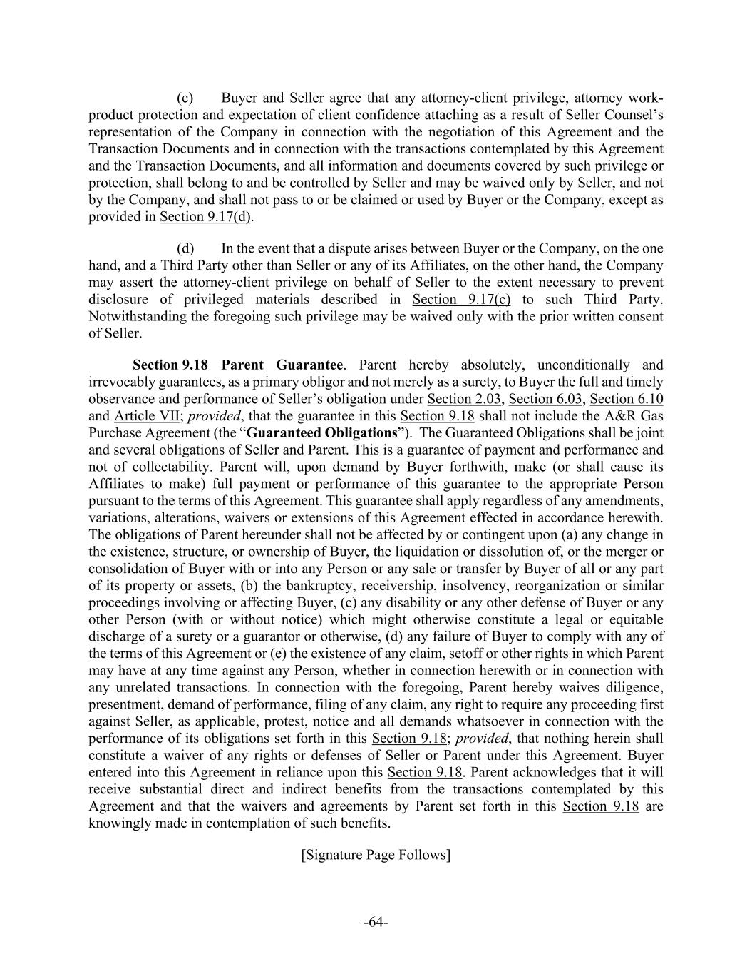 -64- (c) Buyer and Seller agree that any attorney-client privilege, attorney work- product protection and expectation of client confidence attaching as a result of Seller Counsel’s representation of the Company in connection with the negotiation of this Agreement and the Transaction Documents and in connection with the transactions contemplated by this Agreement and the Transaction Documents, and all information and documents covered by such privilege or protection, shall belong to and be controlled by Seller and may be waived only by Seller, and not by the Company, and shall not pass to or be claimed or used by Buyer or the Company, except as provided in Section 9.17(d). (d) In the event that a dispute arises between Buyer or the Company, on the one hand, and a Third Party other than Seller or any of its Affiliates, on the other hand, the Company may assert the attorney-client privilege on behalf of Seller to the extent necessary to prevent disclosure of privileged materials described in Section 9.17(c) to such Third Party. Notwithstanding the foregoing such privilege may be waived only with the prior written consent of Seller. Section 9.18 Parent Guarantee. Parent hereby absolutely, unconditionally and irrevocably guarantees, as a primary obligor and not merely as a surety, to Buyer the full and timely observance and performance of Seller’s obligation under Section 2.03, Section 6.03, Section 6.10 and Article VII; provided, that the guarantee in this Section 9.18 shall not include the A&R Gas Purchase Agreement (the “Guaranteed Obligations”). The Guaranteed Obligations shall be joint and several obligations of Seller and Parent. This is a guarantee of payment and performance and not of collectability. Parent will, upon demand by Buyer forthwith, make (or shall cause its Affiliates to make) full payment or performance of this guarantee to the appropriate Person pursuant to the terms of this Agreement. This guarantee shall apply regardless of any amendments, variations, alterations, waivers or extensions of this Agreement effected in accordance herewith. The obligations of Parent hereunder shall not be affected by or contingent upon (a) any change in the existence, structure, or ownership of Buyer, the liquidation or dissolution of, or the merger or consolidation of Buyer with or into any Person or any sale or transfer by Buyer of all or any part of its property or assets, (b) the bankruptcy, receivership, insolvency, reorganization or similar proceedings involving or affecting Buyer, (c) any disability or any other defense of Buyer or any other Person (with or without notice) which might otherwise constitute a legal or equitable discharge of a surety or a guarantor or otherwise, (d) any failure of Buyer to comply with any of the terms of this Agreement or (e) the existence of any claim, setoff or other rights in which Parent may have at any time against any Person, whether in connection herewith or in connection with any unrelated transactions. In connection with the foregoing, Parent hereby waives diligence, presentment, demand of performance, filing of any claim, any right to require any proceeding first against Seller, as applicable, protest, notice and all demands whatsoever in connection with the performance of its obligations set forth in this Section 9.18; provided, that nothing herein shall constitute a waiver of any rights or defenses of Seller or Parent under this Agreement. Buyer entered into this Agreement in reliance upon this Section 9.18. Parent acknowledges that it will receive substantial direct and indirect benefits from the transactions contemplated by this Agreement and that the waivers and agreements by Parent set forth in this Section 9.18 are knowingly made in contemplation of such benefits. [Signature Page Follows]