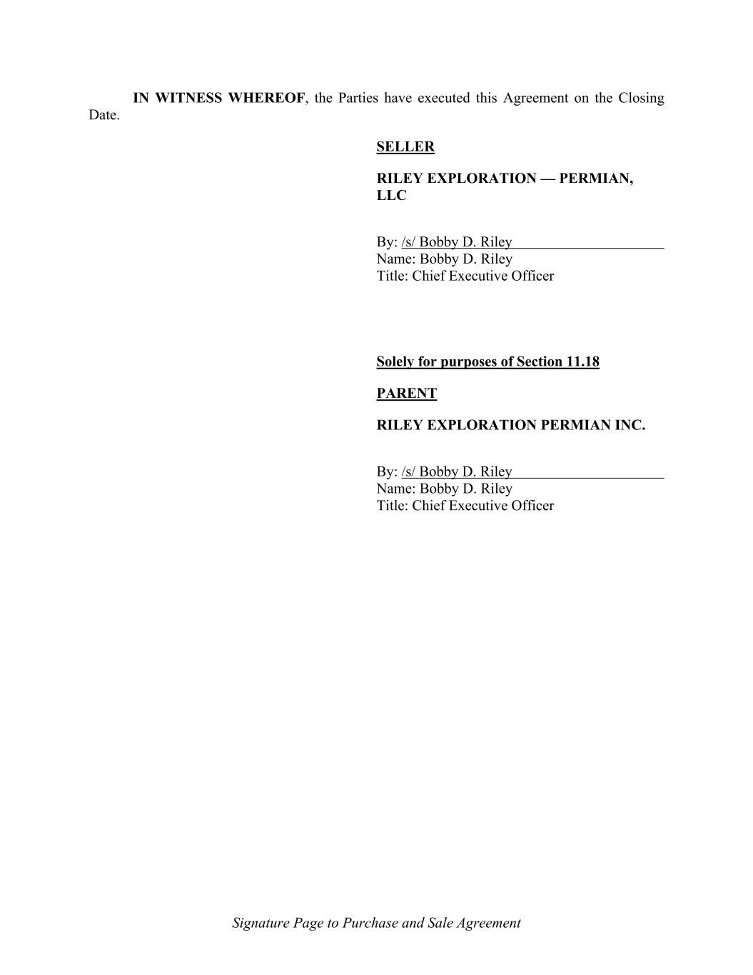 Signature Page to Purchase and Sale Agreement IN WITNESS WHEREOF, the Parties have executed this Agreement on the Closing Date. SELLER RILEY EXPLORATION — PERMIAN, LLC By: /s/ Bobby D. Riley Name: Bobby D. Riley Title: Chief Executive Officer Solely for purposes of Section 11.18 PARENT RILEY EXPLORATION PERMIAN INC. By: /s/ Bobby D. Riley Name: Bobby D. Riley Title: Chief Executive Officer