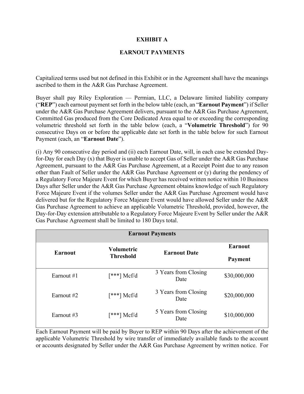 EXHIBIT A EARNOUT PAYMENTS Capitalized terms used but not defined in this Exhibit or in the Agreement shall have the meanings ascribed to them in the A&R Gas Purchase Agreement. Buyer shall pay Riley Exploration — Permian, LLC, a Delaware limited liability company (“REP”) each earnout payment set forth in the below table (each, an “Earnout Payment”) if Seller under the A&R Gas Purchase Agreement delivers, pursuant to the A&R Gas Purchase Agreement, Committed Gas produced from the Core Dedicated Area equal to or exceeding the corresponding volumetric threshold set forth in the table below (each, a “Volumetric Threshold”) for 90 consecutive Days on or before the applicable date set forth in the table below for such Earnout Payment (each, an “Earnout Date”). (i) Any 90 consecutive day period and (ii) each Earnout Date, will, in each case be extended Day- for-Day for each Day (x) that Buyer is unable to accept Gas of Seller under the A&R Gas Purchase Agreement, pursuant to the A&R Gas Purchase Agreement, at a Receipt Point due to any reason other than Fault of Seller under the A&R Gas Purchase Agreement or (y) during the pendency of a Regulatory Force Majeure Event for which Buyer has received written notice within 10 Business Days after Seller under the A&R Gas Purchase Agreement obtains knowledge of such Regulatory Force Majeure Event if the volumes Seller under the A&R Gas Purchase Agreement would have delivered but for the Regulatory Force Majeure Event would have allowed Seller under the A&R Gas Purchase Agreement to achieve an applicable Volumetric Threshold, provided, however, the Day-for-Day extension attributable to a Regulatory Force Majeure Event by Seller under the A&R Gas Purchase Agreement shall be limited to 180 Days total. Earnout Payments Earnout Volumetric Threshold Earnout Date Earnout Payment Earnout #1 [***] Mcf/d 3 Years from Closing Date $30,000,000 Earnout #2 [***] Mcf/d 3 Years from Closing Date $20,000,000 Earnout #3 [***] Mcf/d 5 Years from Closing Date $10,000,000 Each Earnout Payment will be paid by Buyer to REP within 90 Days after the achievement of the applicable Volumetric Threshold by wire transfer of immediately available funds to the account or accounts designated by Seller under the A&R Gas Purchase Agreement by written notice. For